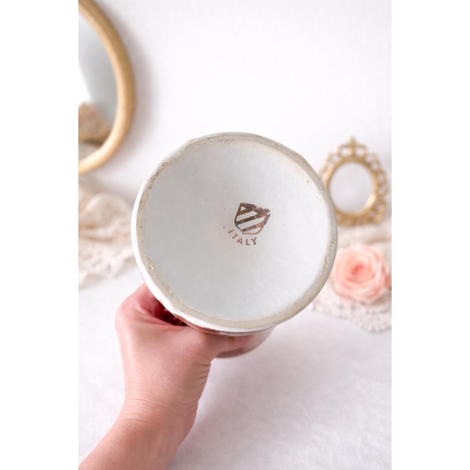 Elegant vintage Italian vase featuring delicate handpainted pink and gold details with a charming windmill scene. Crafted in classic Rococo style, this 8" tall piece showcases intricate artistry and a painted maker's stamp on the bottom, verifying its authenticity.