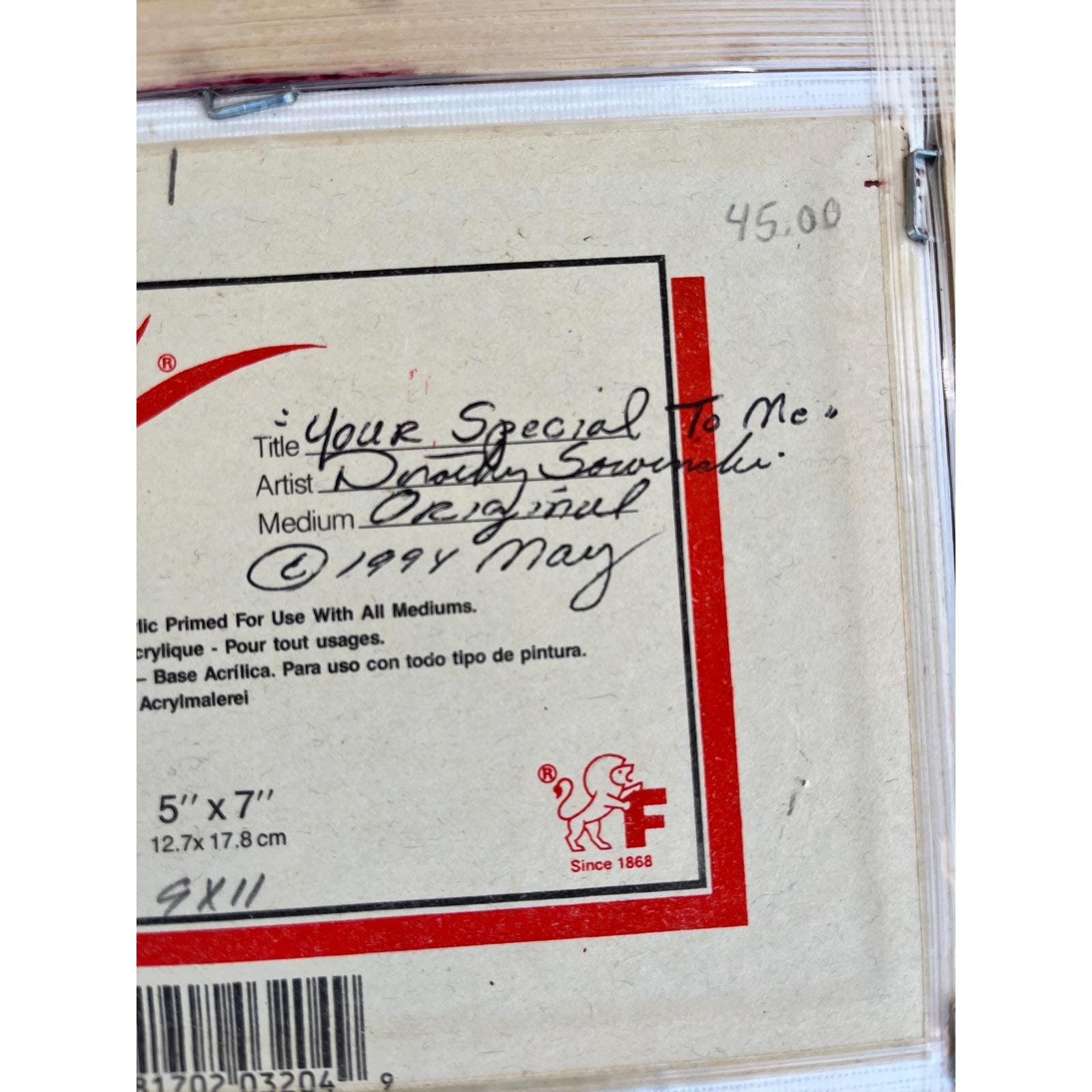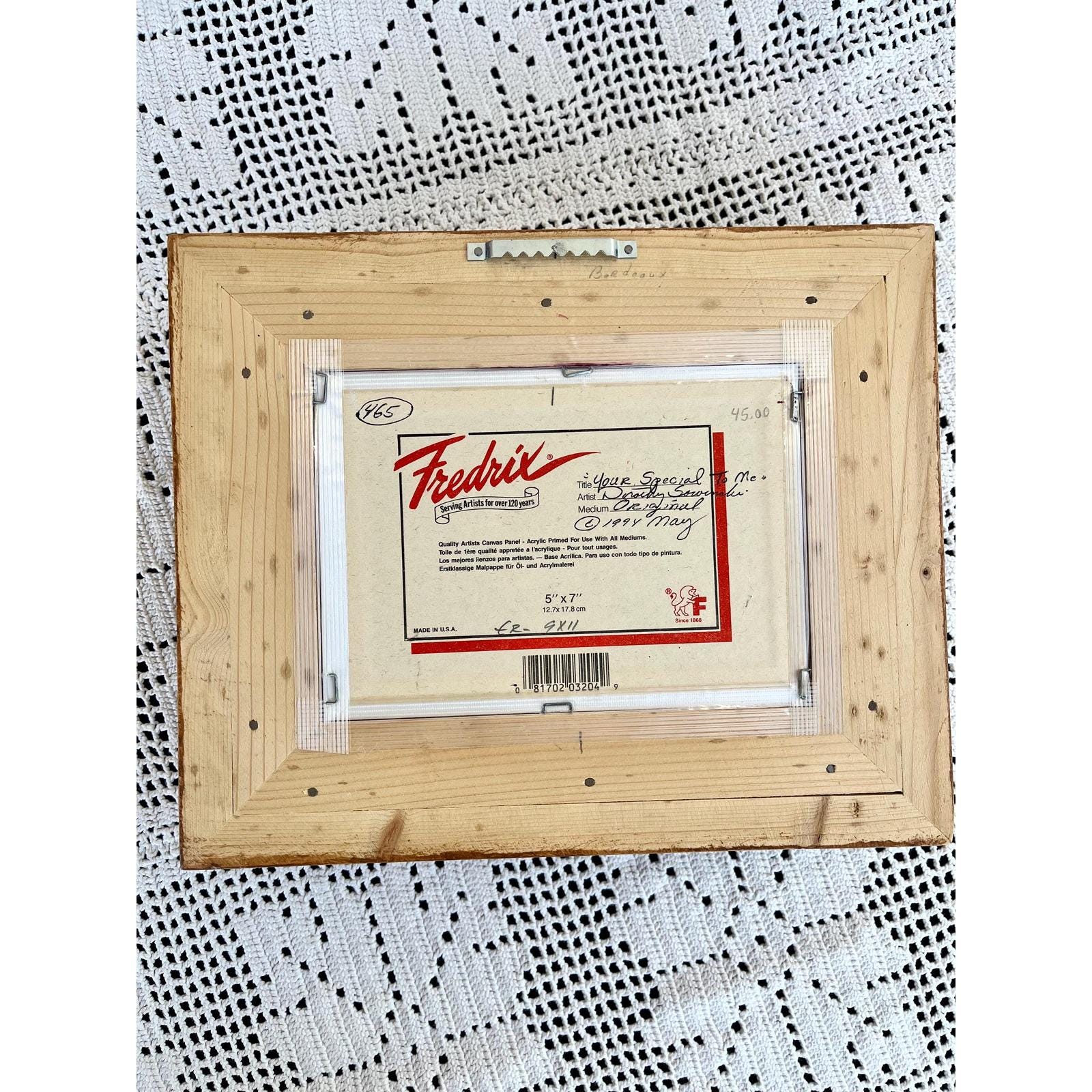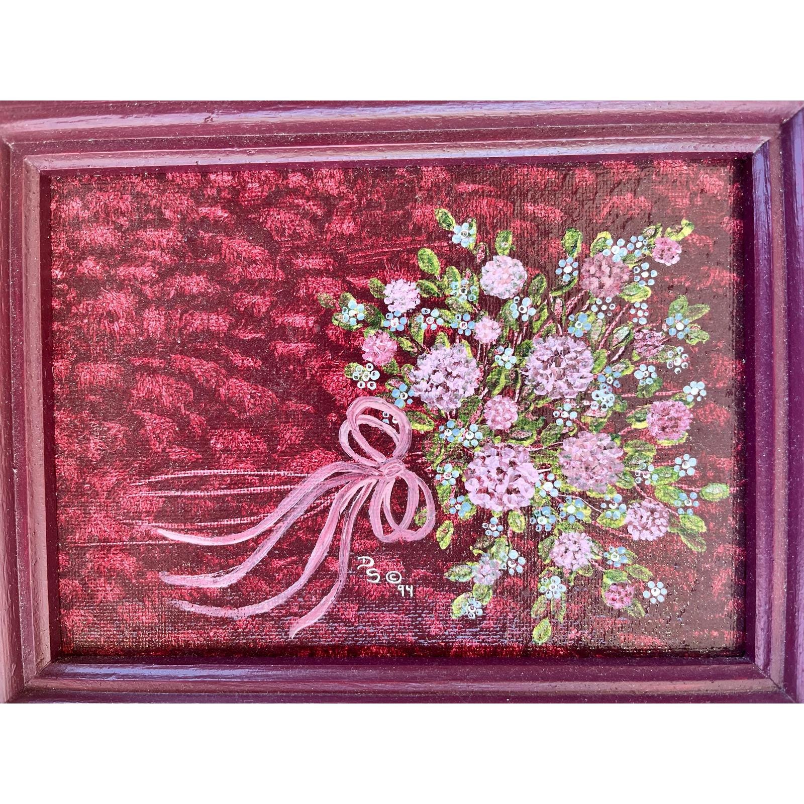 Beautiful vintage acrylic paintings featuring maroon backgrounds with delicate pink floral designs, signed by artist Dorothy Sowinski in 1994. Each piece is an original artwork, with sweet handwritten messages on the back from the artist, adding a personal touch.