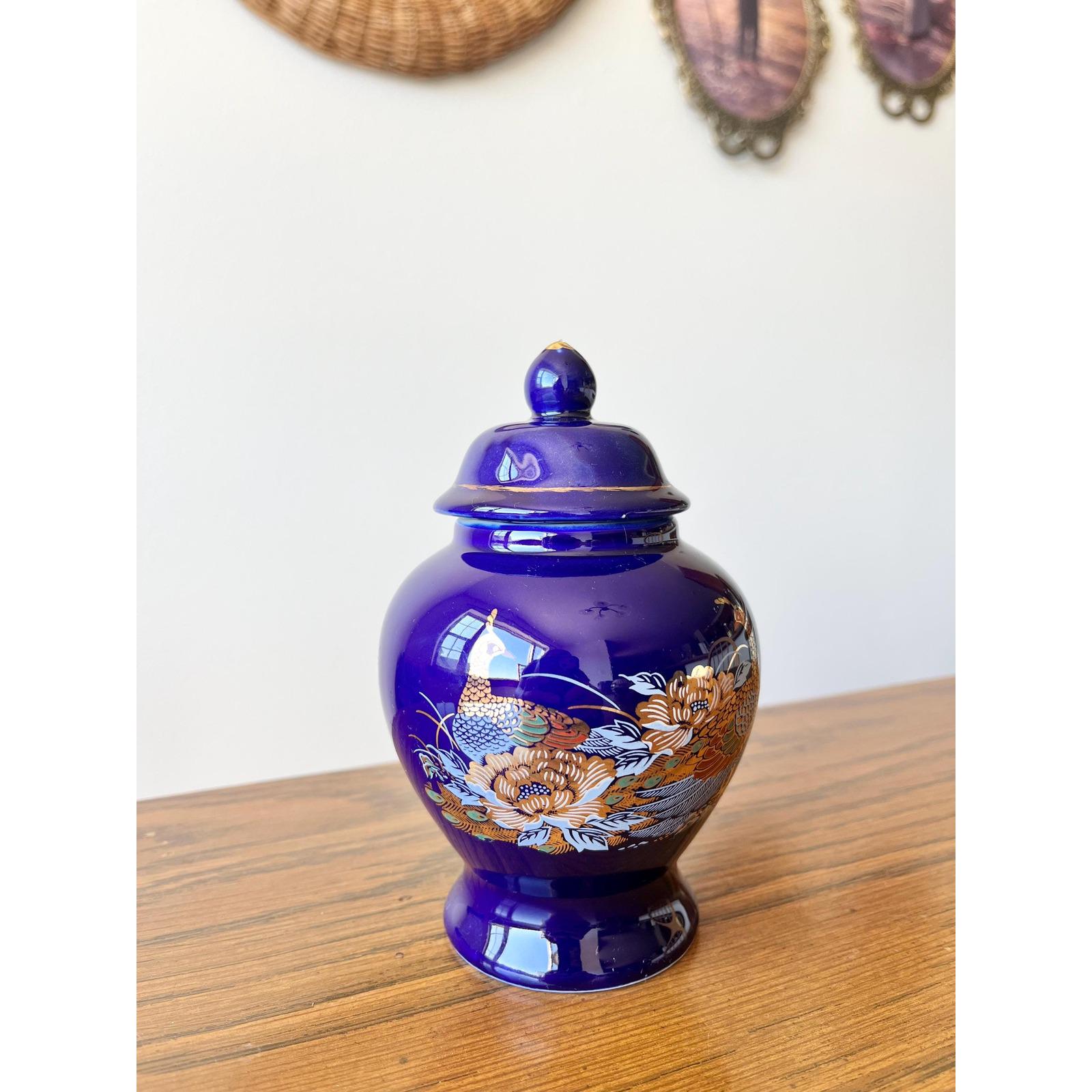 A charming vintage mini ginger jar featuring a striking cobalt blue glaze and intricate peacock pattern. Made in Taiwan, this decorative jar measures 5.5" tall with a 3.5" diameter, perfect for collectors of Asian ceramics or colorful vintage home accents.