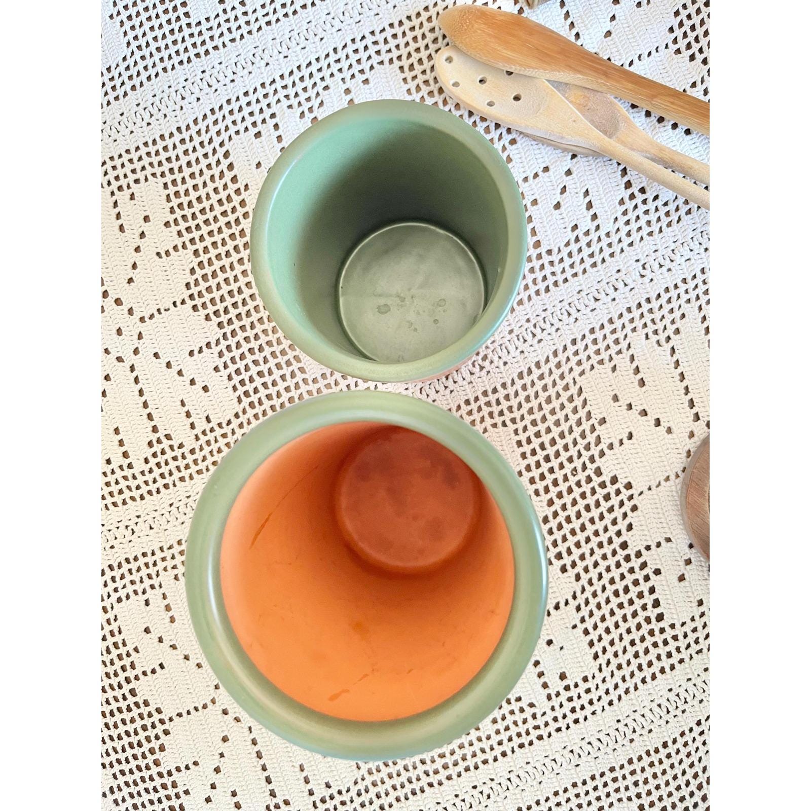This set of two rustic Casa Verde terracotta canisters features earthy clay exteriors with glazed green interiors. The smaller jar comes with a natural cork lid, while the larger is open-style—perfect for countertop storage or kitchen display. Handmade and full of old-world charm, these pieces blend function and character beautifully.