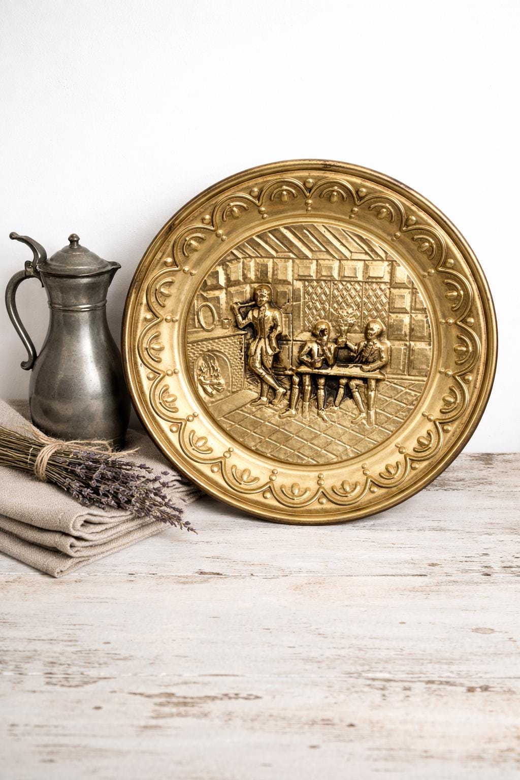 This vintage embossed metal wall plate features a charming colonial pub scene, with finely detailed figures in relief. Made in England, this lightweight decorative plate has a warm brass-tone finish and measures approximately 9.75" in diameter. Likely crafted from tin or another light metal, it’s ideal for gallery walls, pub-themed decor, or anyone who loves traditional English motifs.