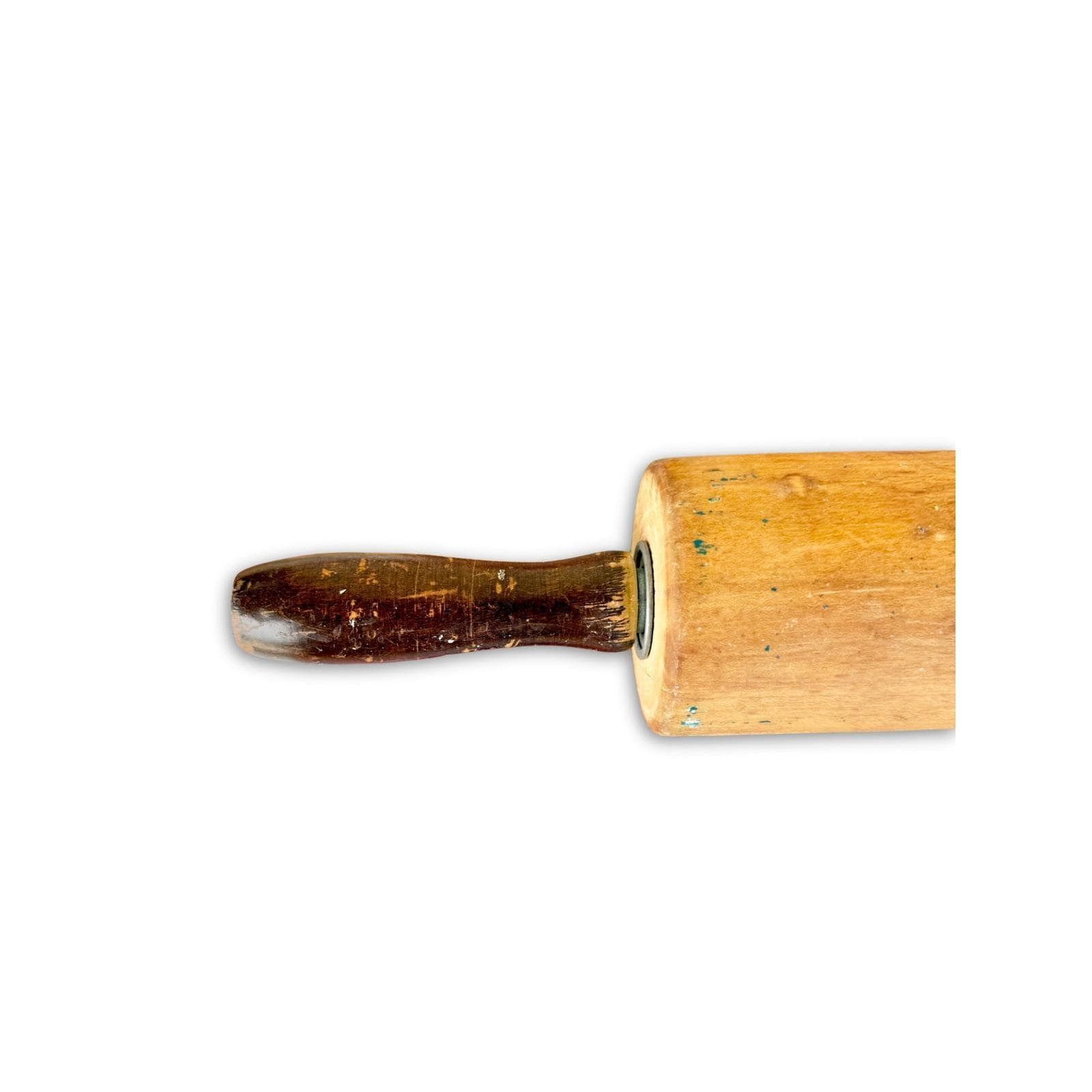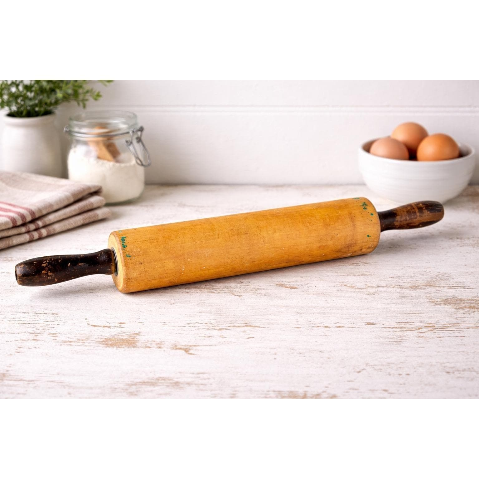 Large rustic primitive wooden rolling pin with a well-worn surface and lots of character. This piece has the sturdy, utilitarian feel of early kitchen tools and works beautifully as décor in farmhouse, primitive, or cottage-style spaces. Perfect for styling on open shelving, in a dough bowl, or as part of an old kitchen vignette. A great piece for collectors of primitive or early kitchenware.