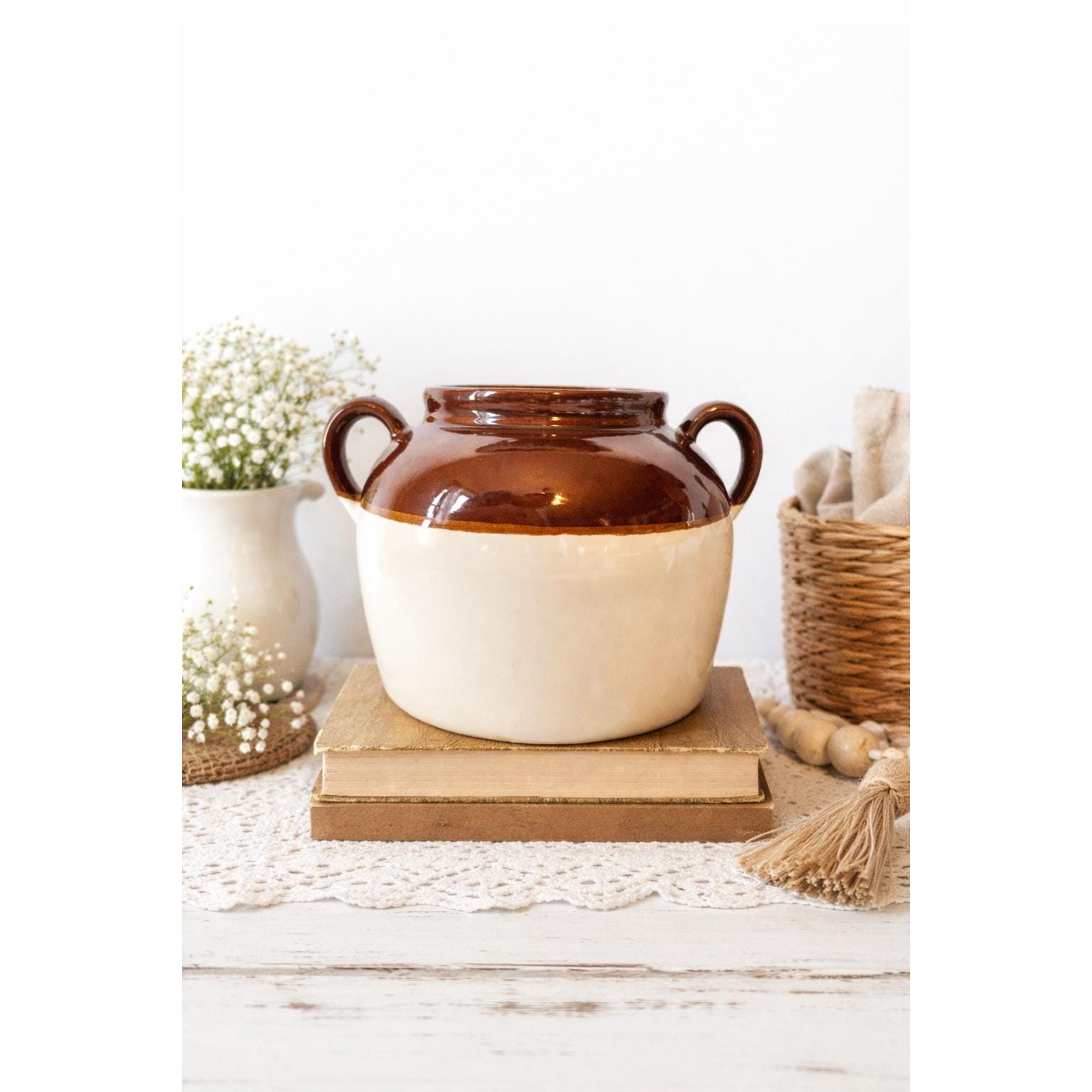 This vintage stoneware bean crock features a classic two-tone glaze with a warm cream body and rich brown top. The simple, rounded form and sturdy handle give it that timeless farmhouse look that works beautifully in both rustic and collected kitchens.