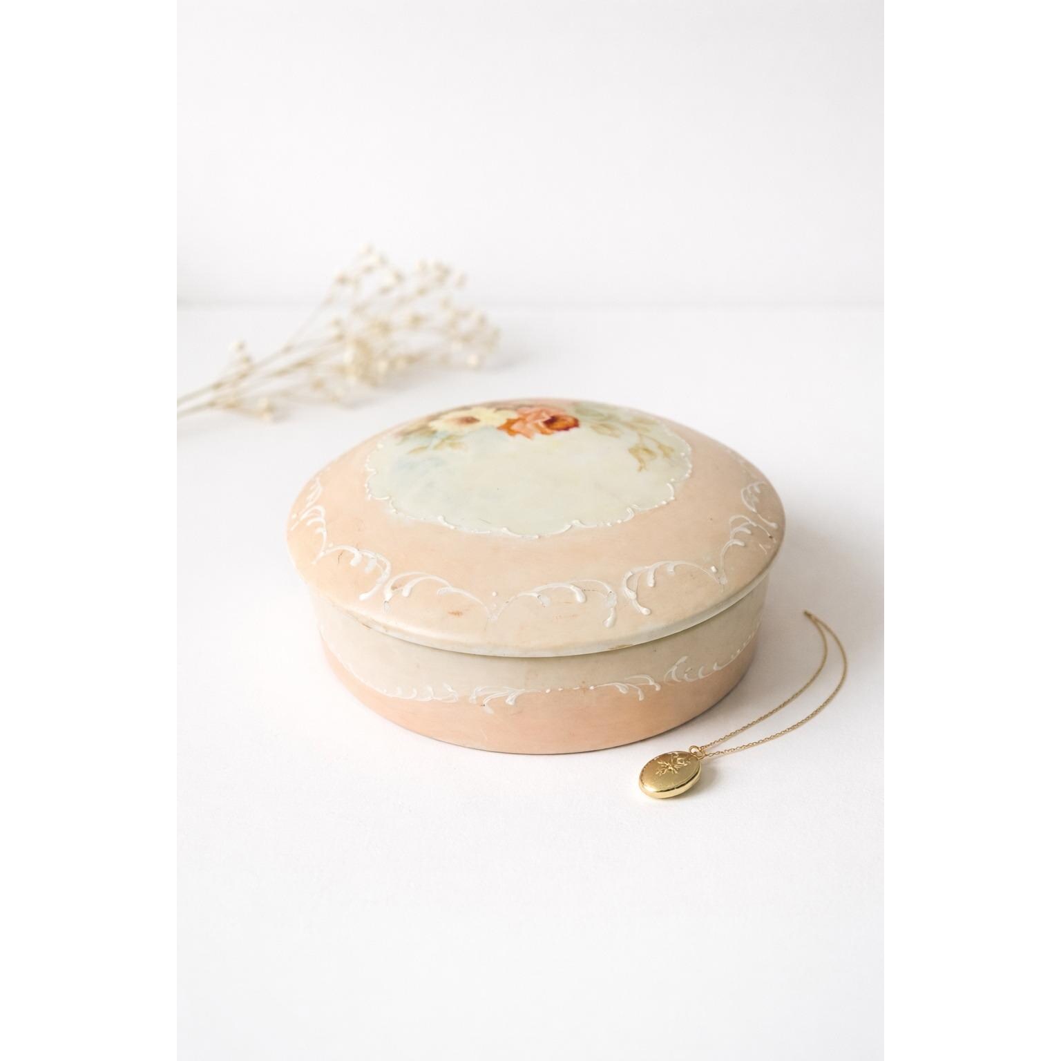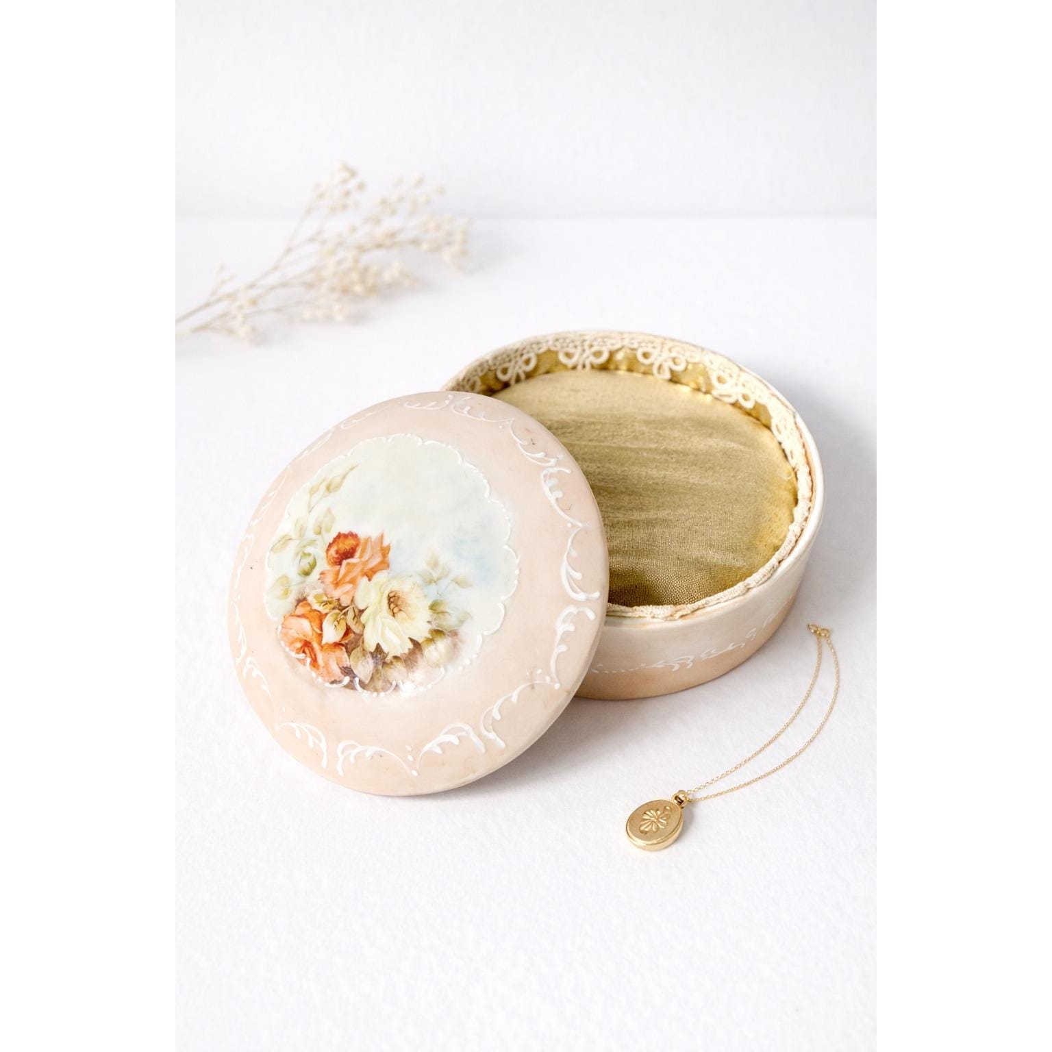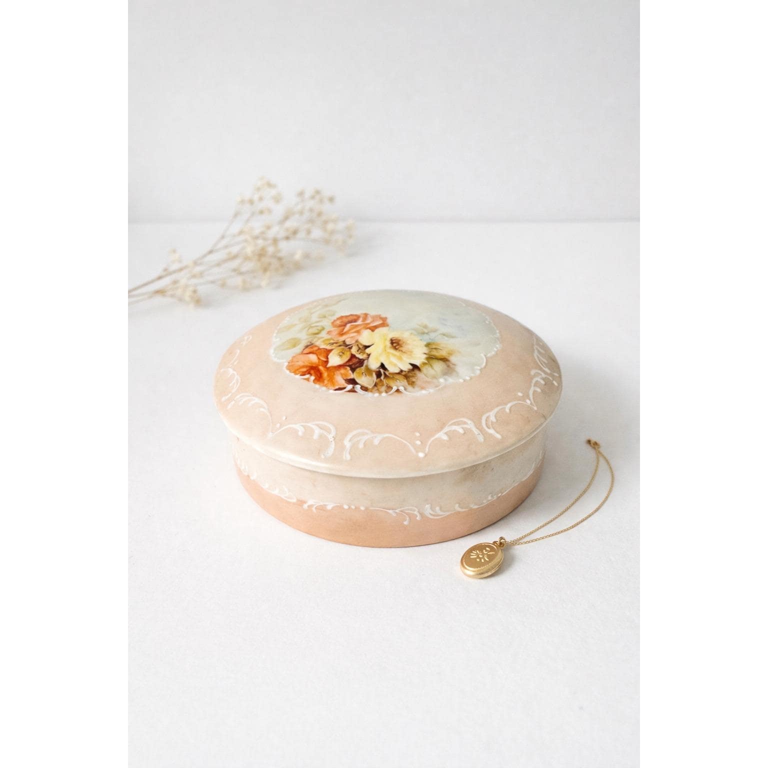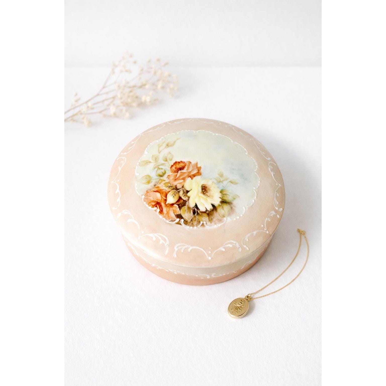 This antique Limoges jewelry box features a beautiful pink floral design with delicate hand-painted details, characteristic of fine French porcelain. The interior includes a soft champagne-colored cushioned lining—perfect for storing rings, earrings, and cherished keepsakes.