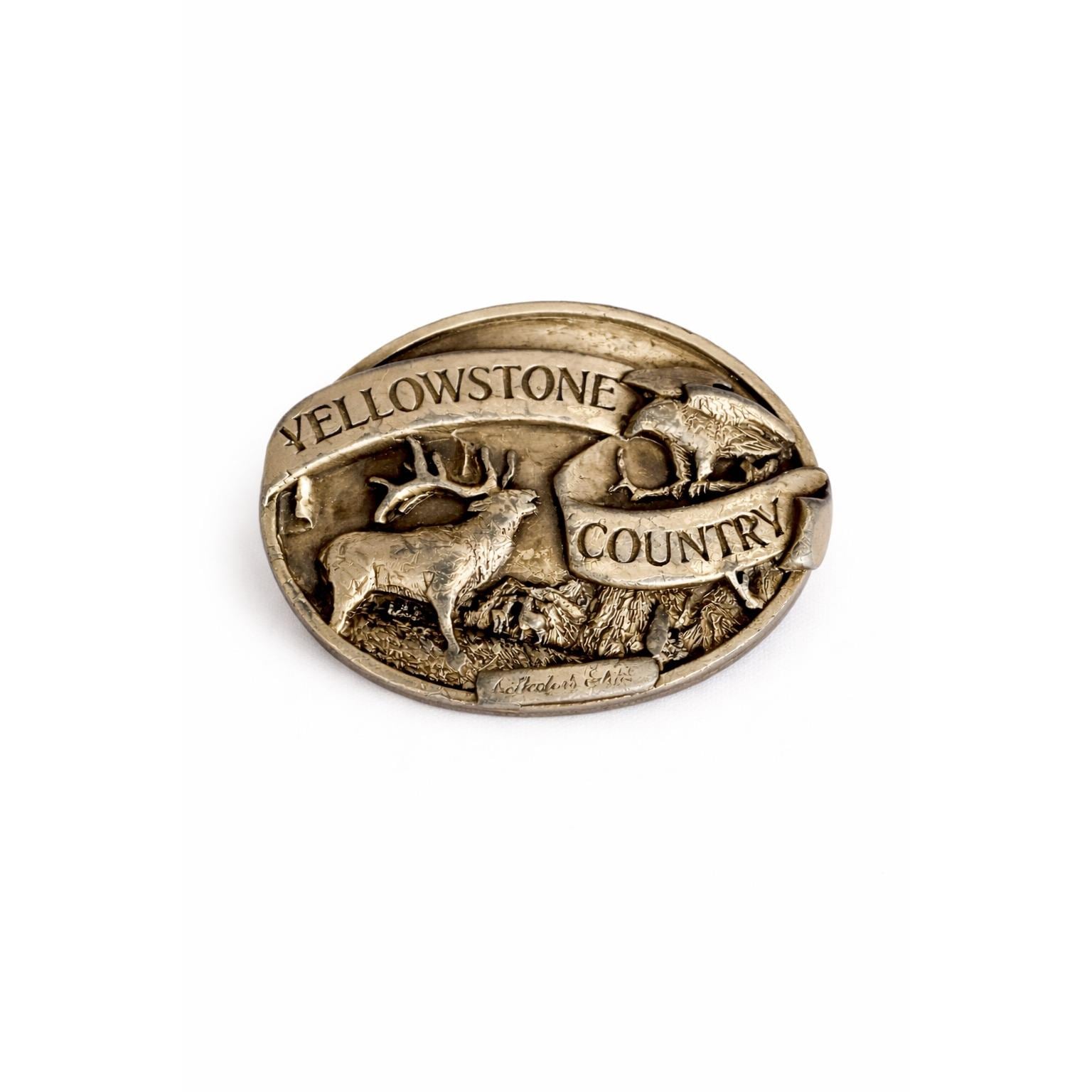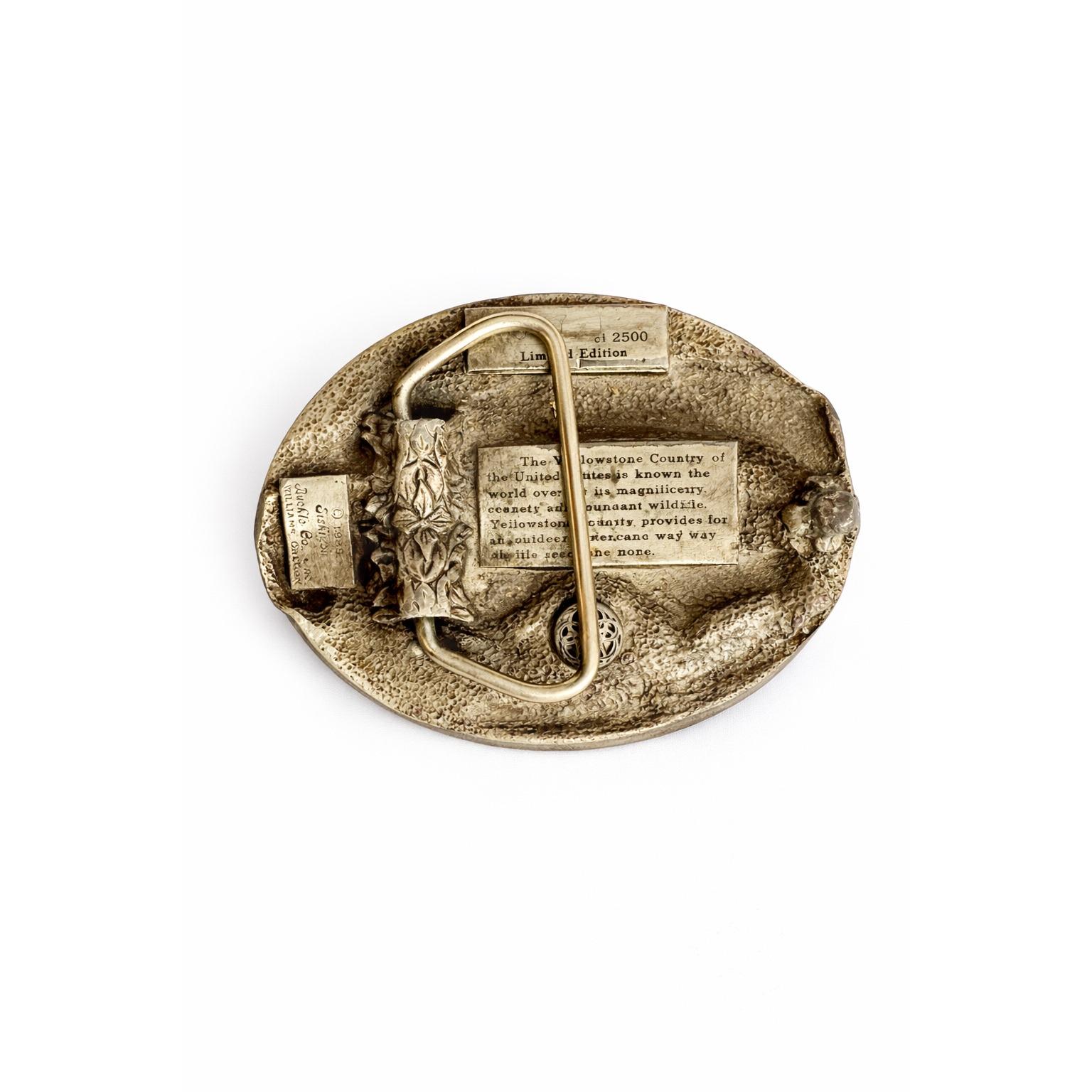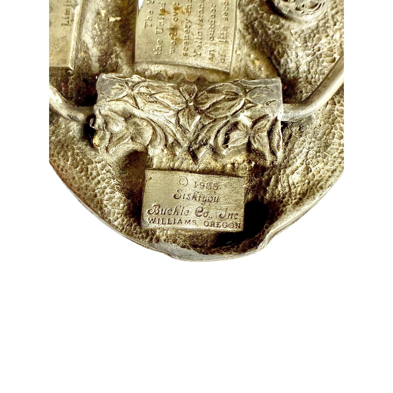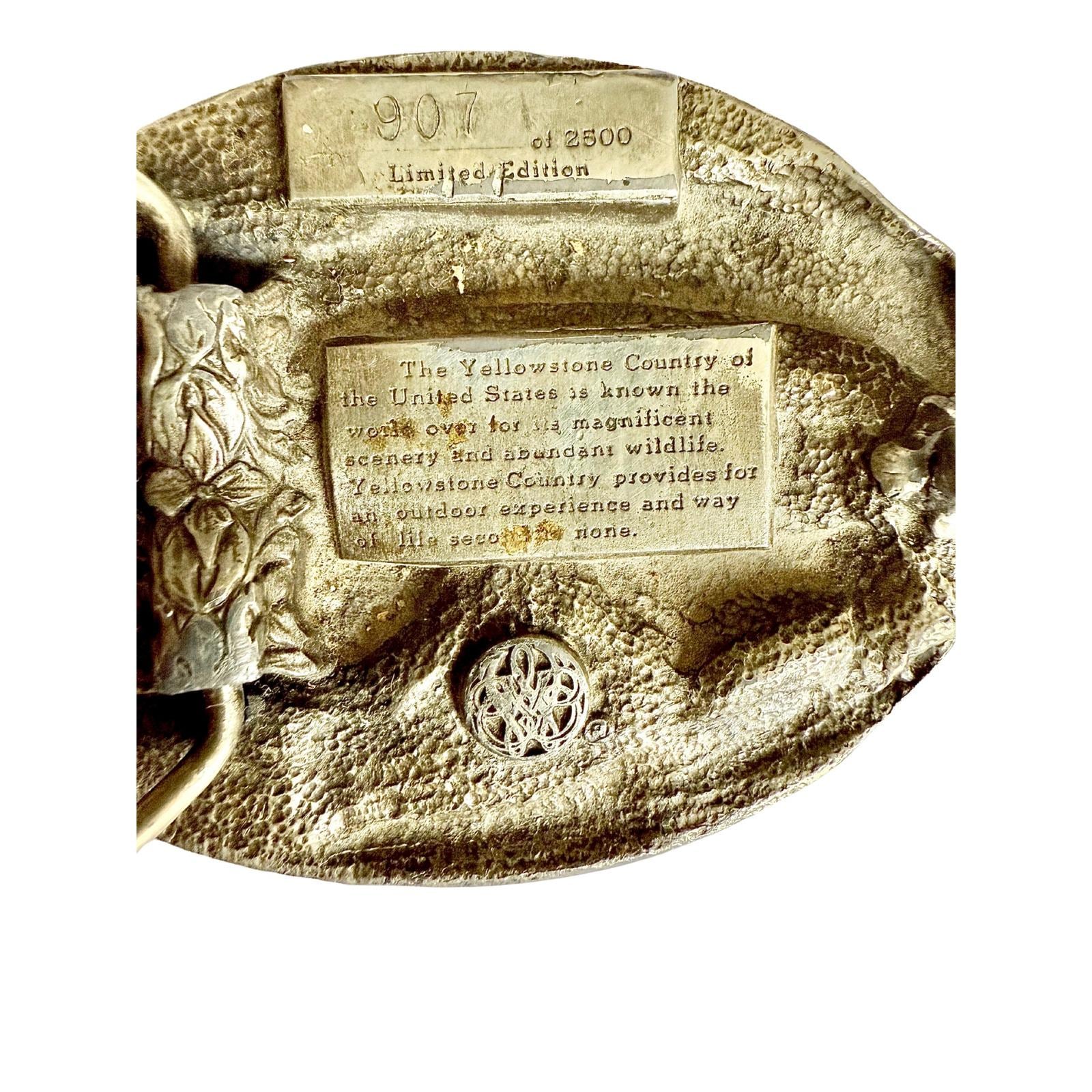 Authentic 1985 Siskiyou "Yellowstone Country" vintage pewter belt buckle featuring powerful wildlife imagery of an elk and falcon in bold raised detail. This solid pewter buckle has a rugged, rustic presence and classic Western Americana appeal—perfect for collectors, nature lovers, or statement Western wear.