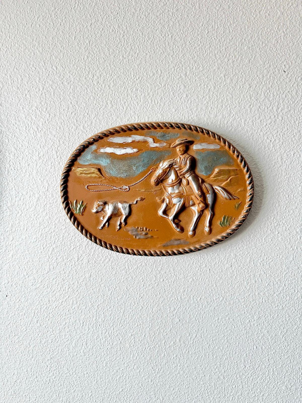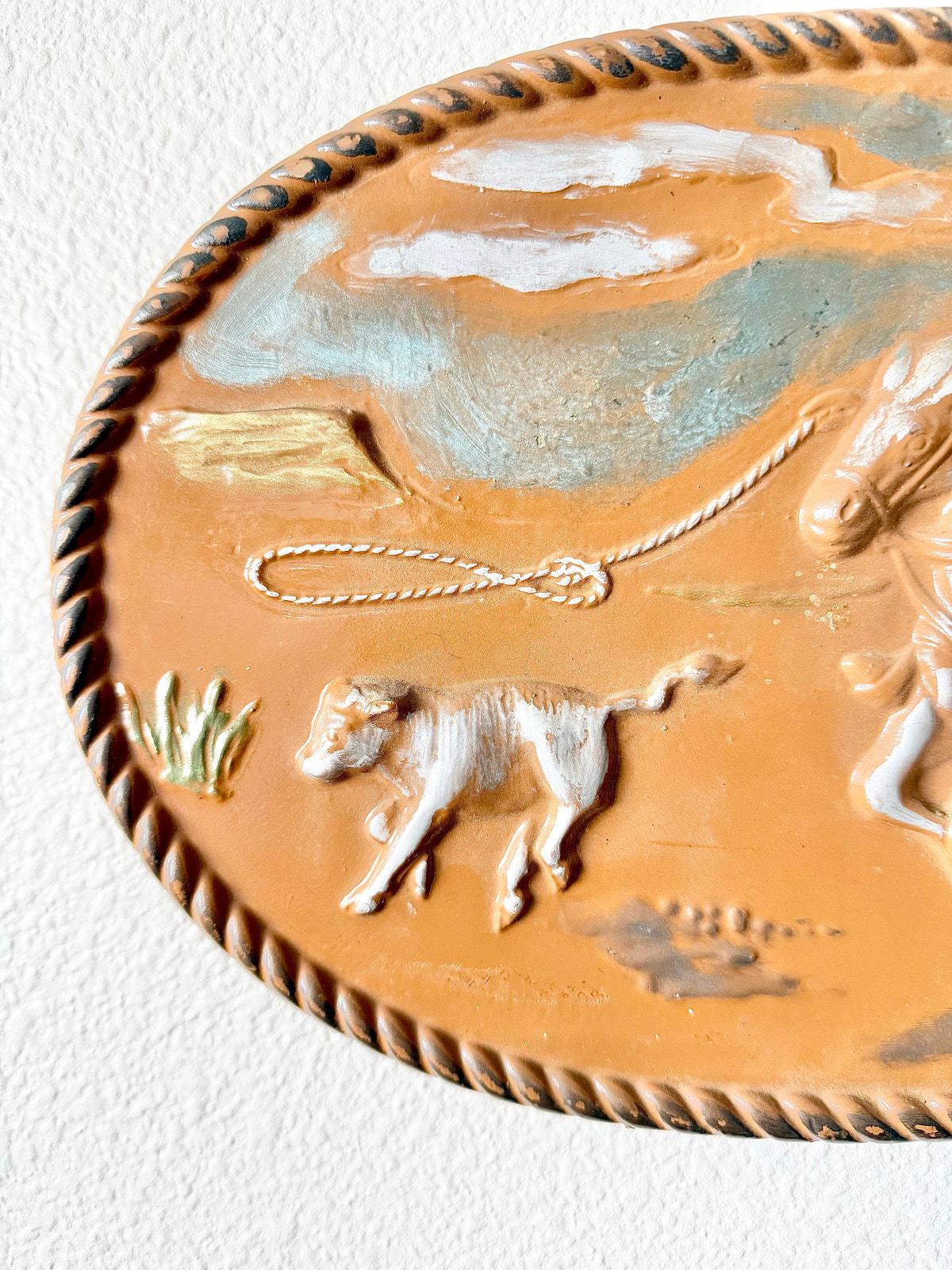 A heavy ceramic 3D art plaque featuring a cowboy wrangling a calf. Has an oval shape and terra cotta color glaze.