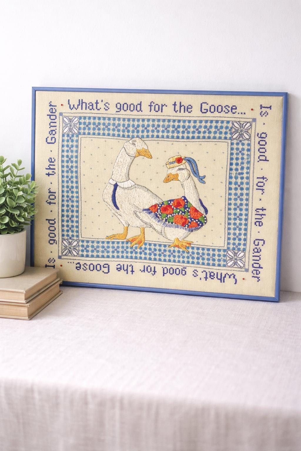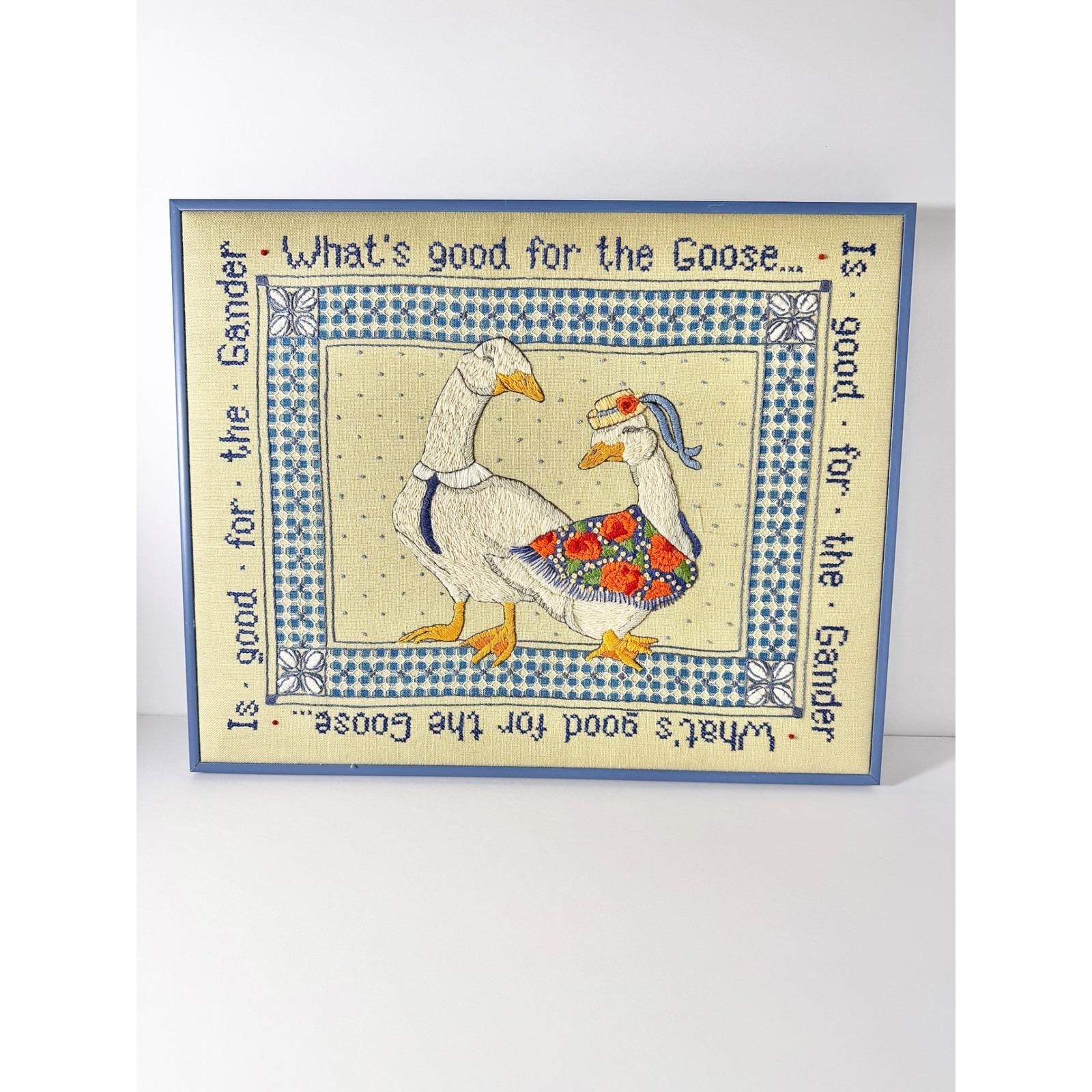Keywords: needlepoint art, framed art, goose decor, farmhouse art, country charm, whimsical art, quote art, wall hanging, gift idea, folk art, vintage inspired, kitchen decor