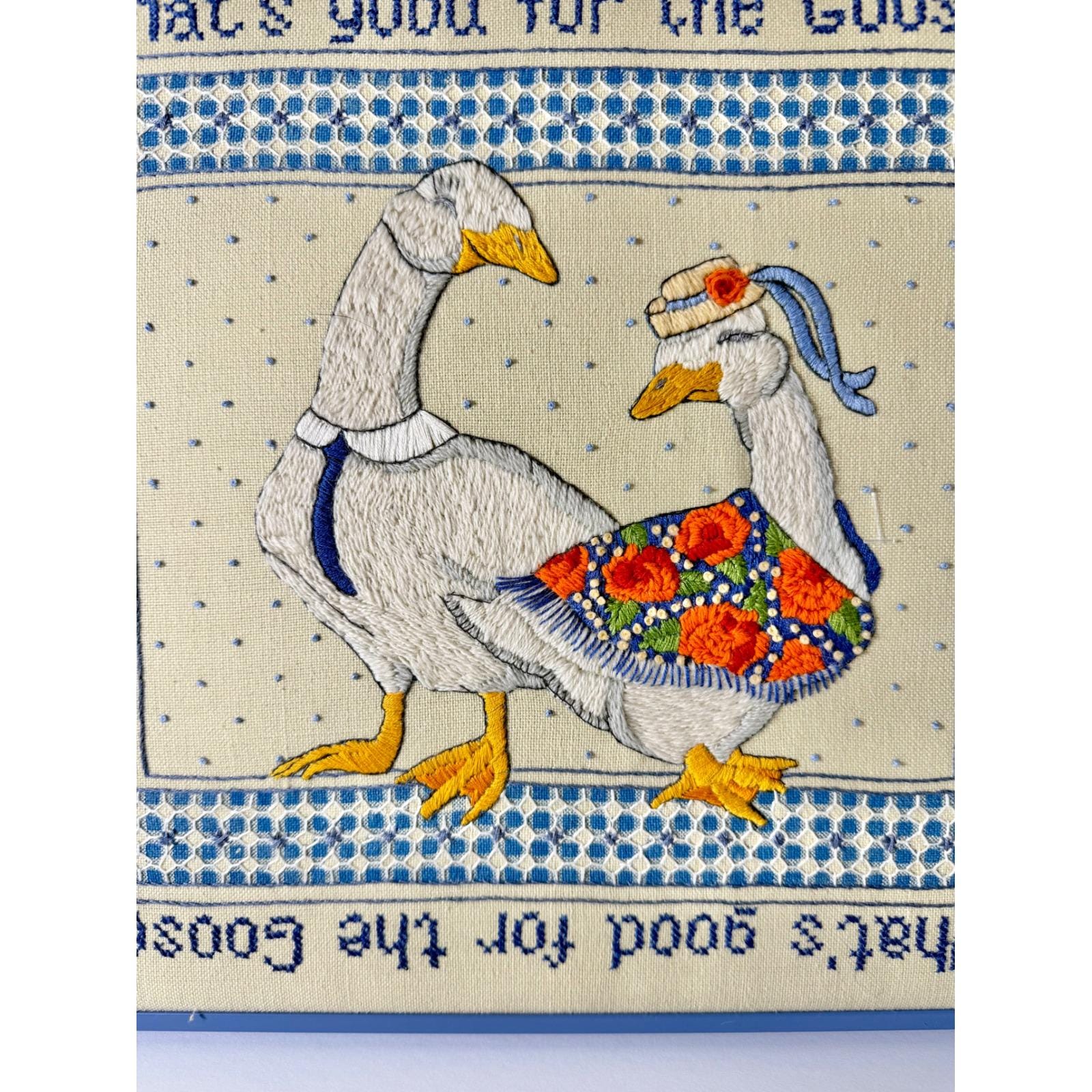 Charming needlepoint artwork showcases two whimsical geese, one adorned with a floral shawl and the other with a tie, accompanied by the classic saying 'What's good for the Goose is good for the Gander'.