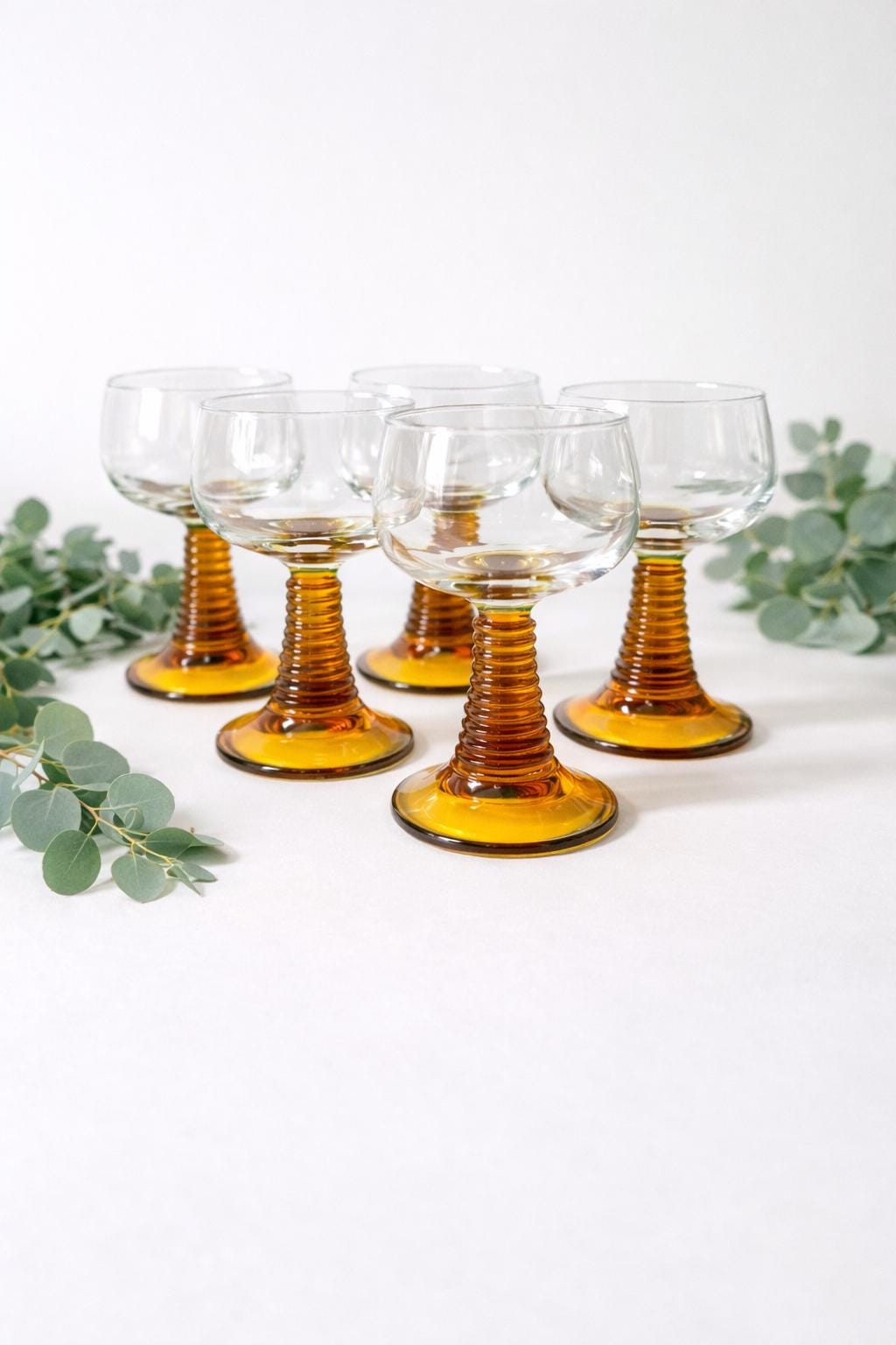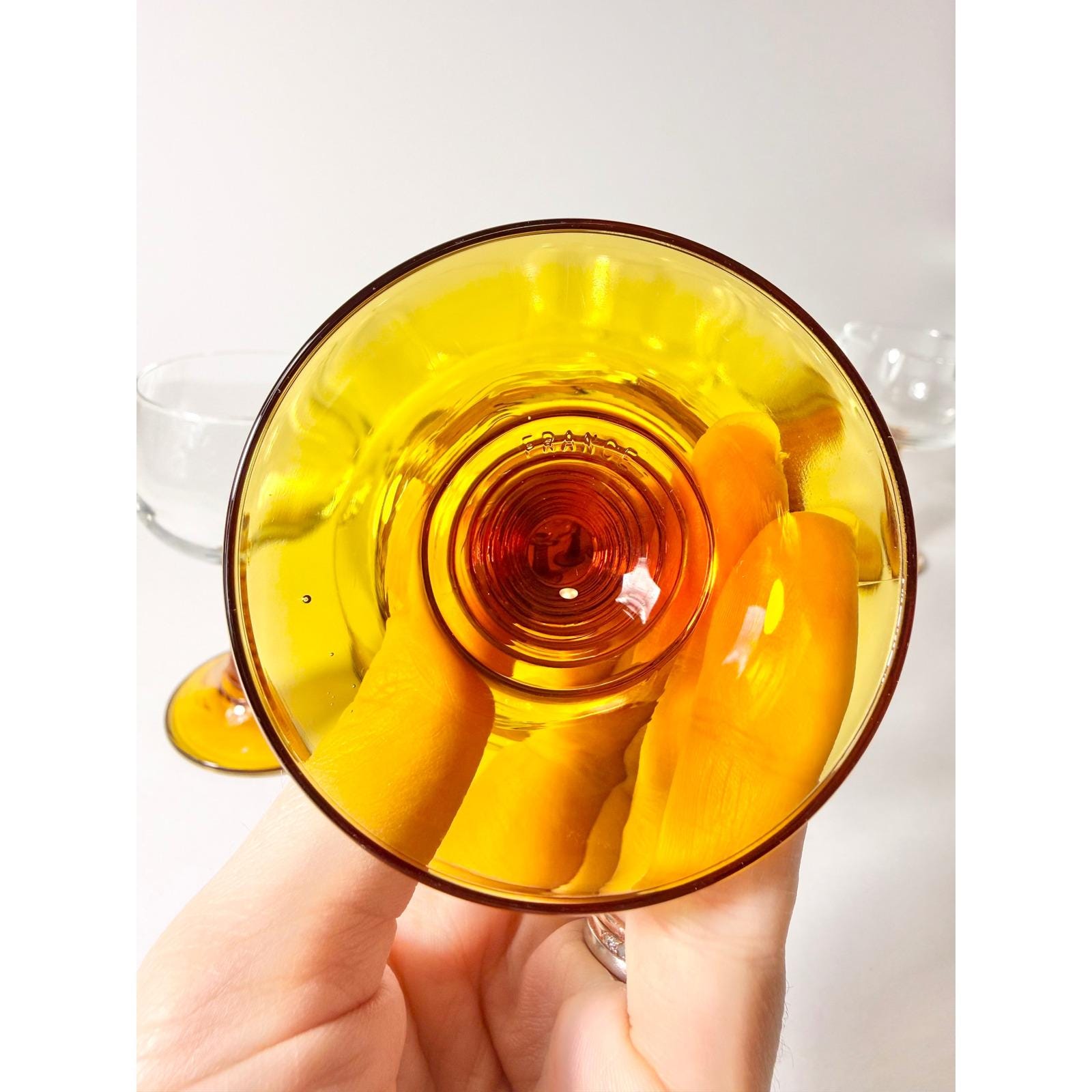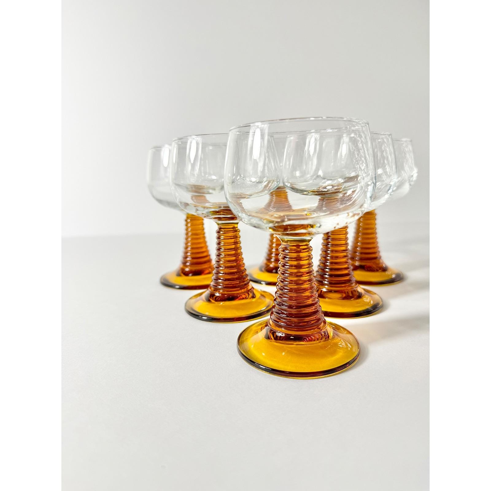 A gorgeous set of 6 glass French Luminarc Beehive wine glasses with amber stems.