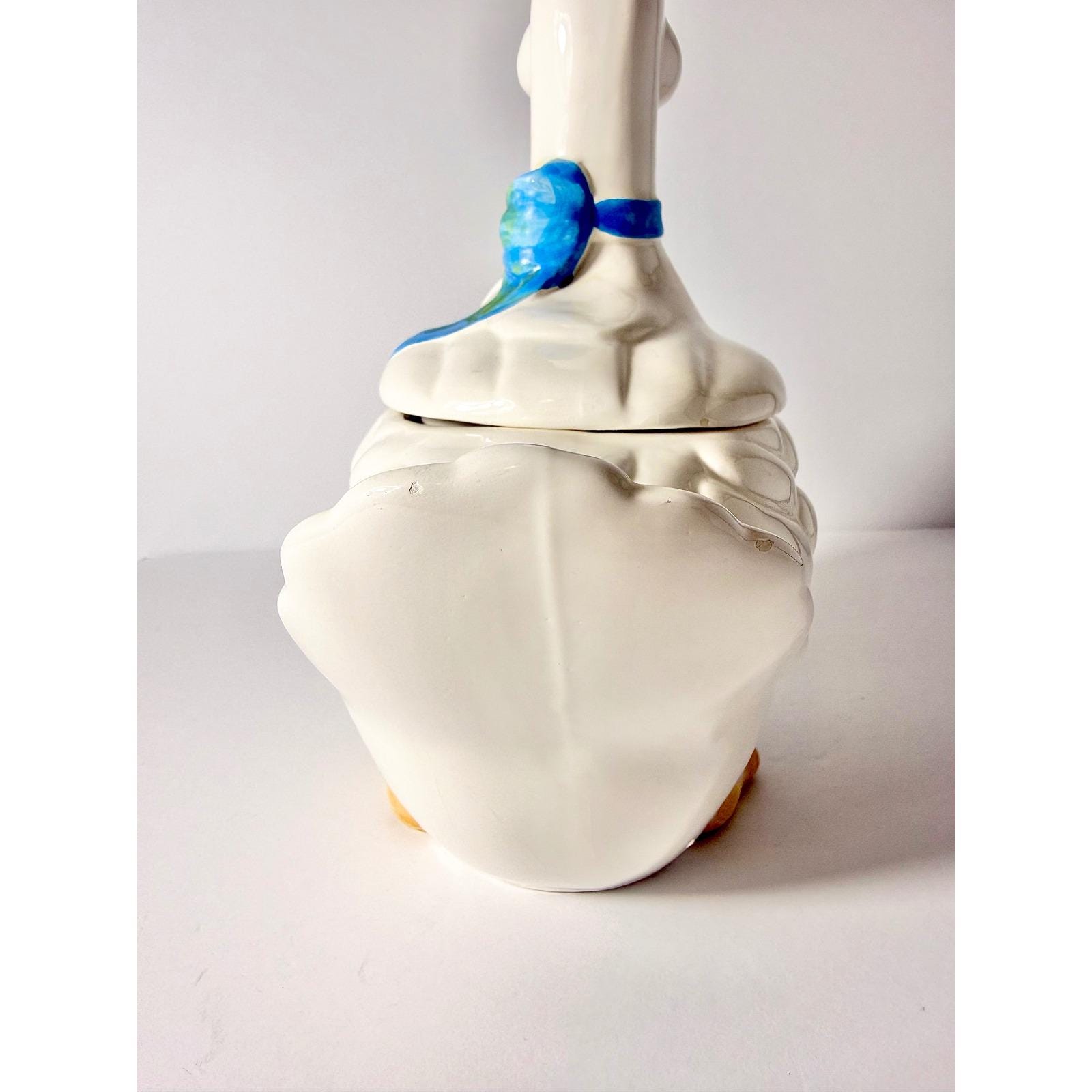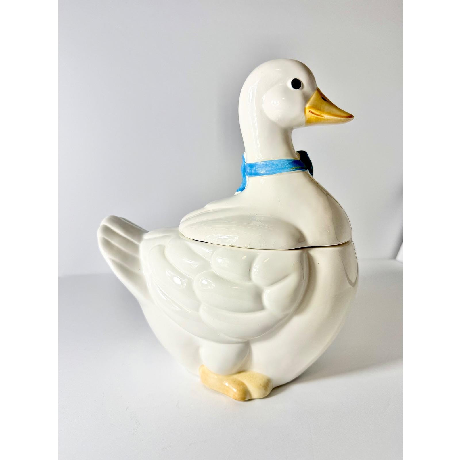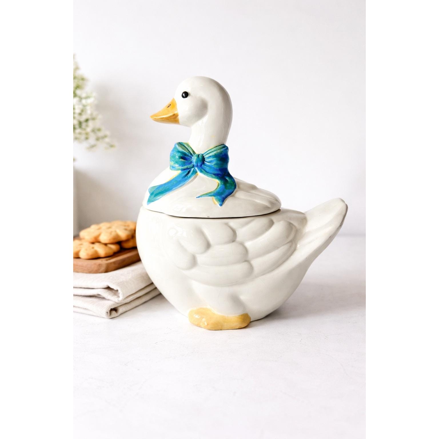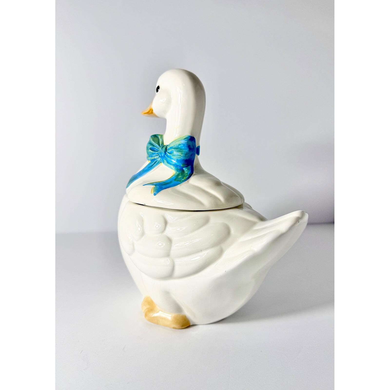 This 1980's vintage ceramic goose cookie jar has a blue bow and plenty of room for your sweet treats!