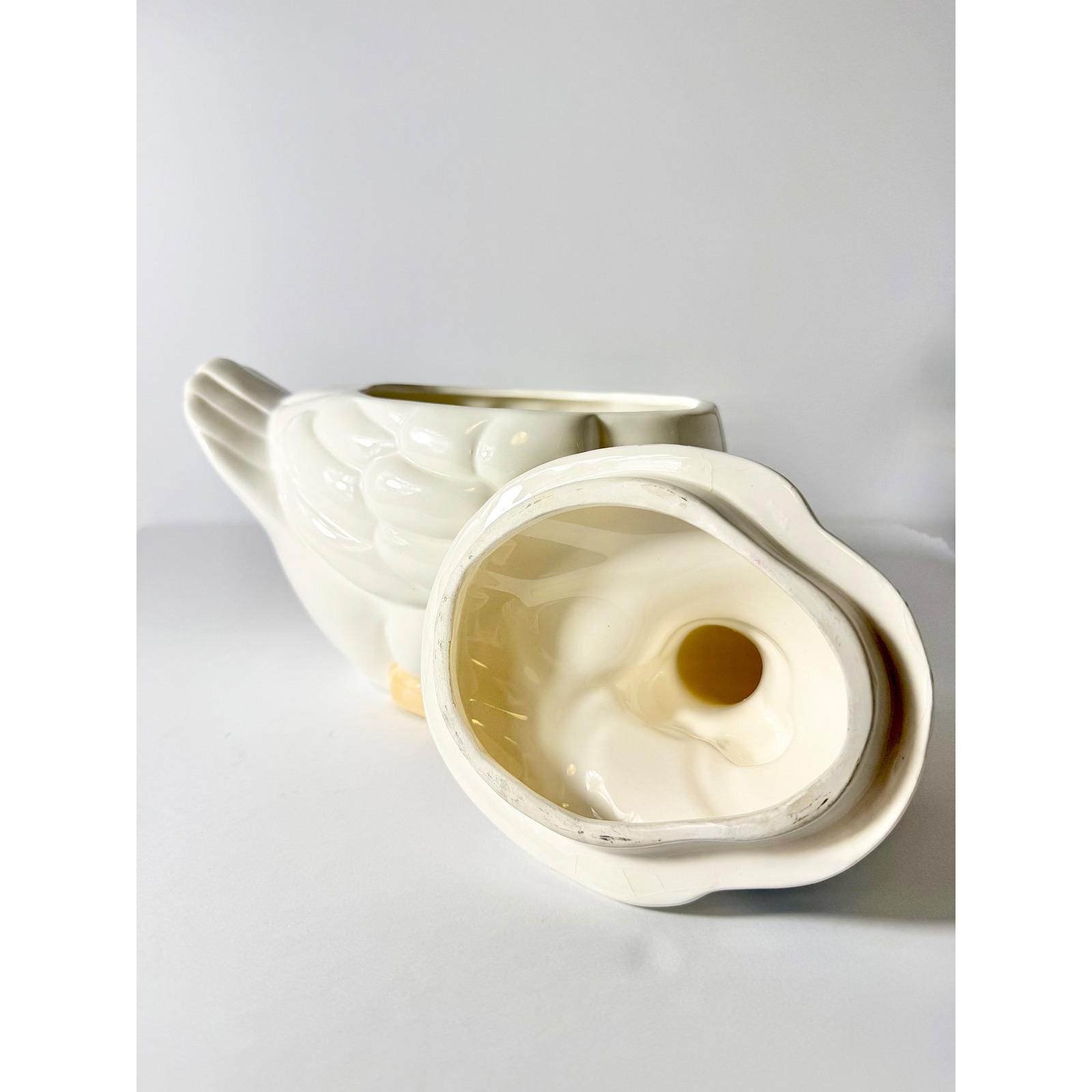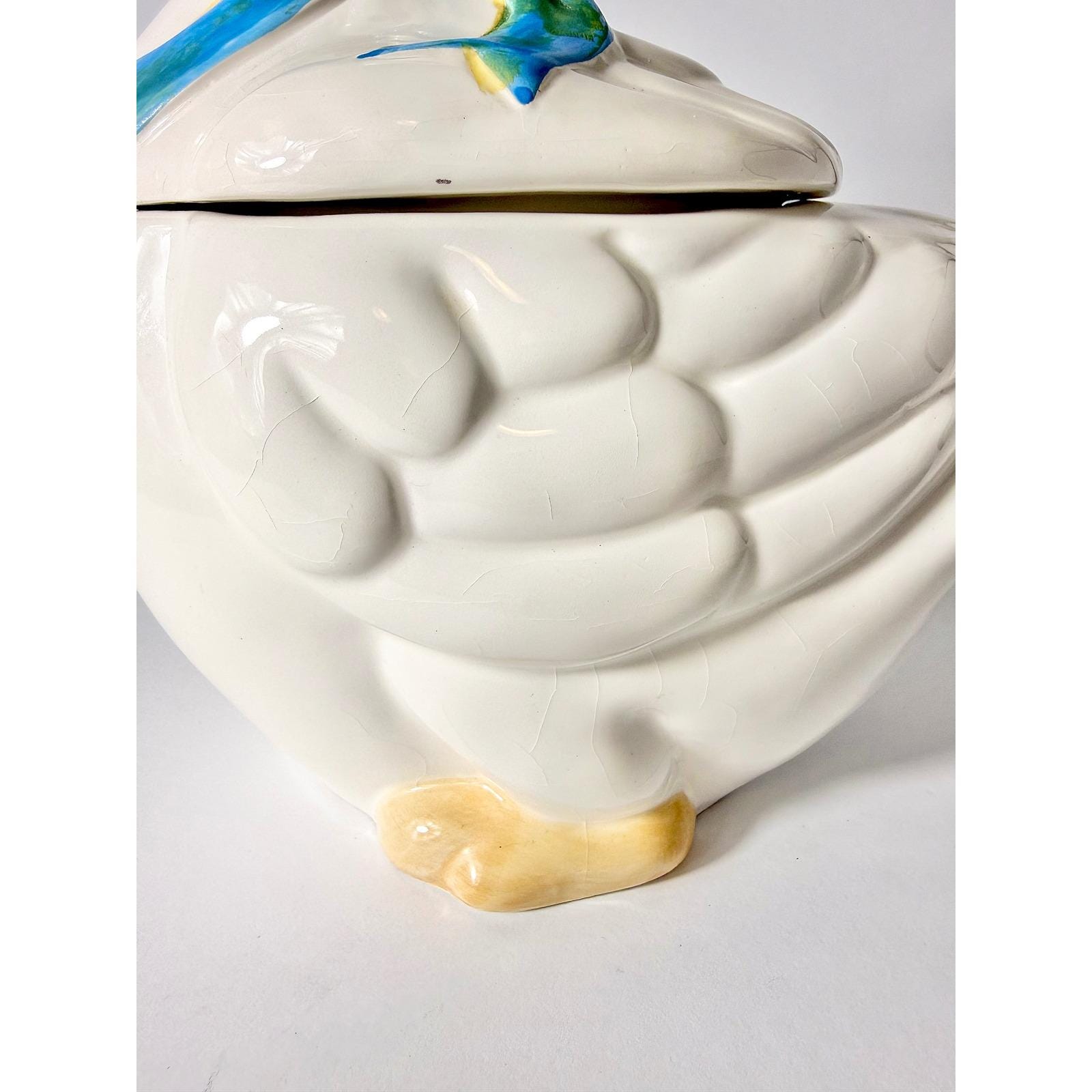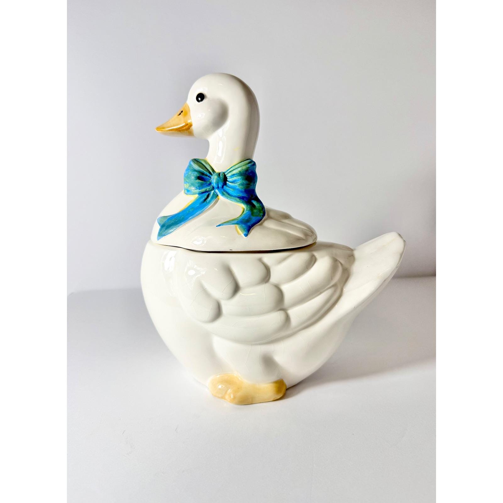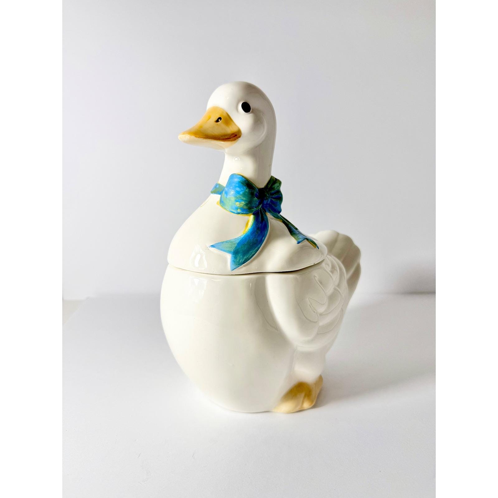 This 1980's vintage ceramic goose cookie jar has a blue bow and plenty of room for your sweet treats!