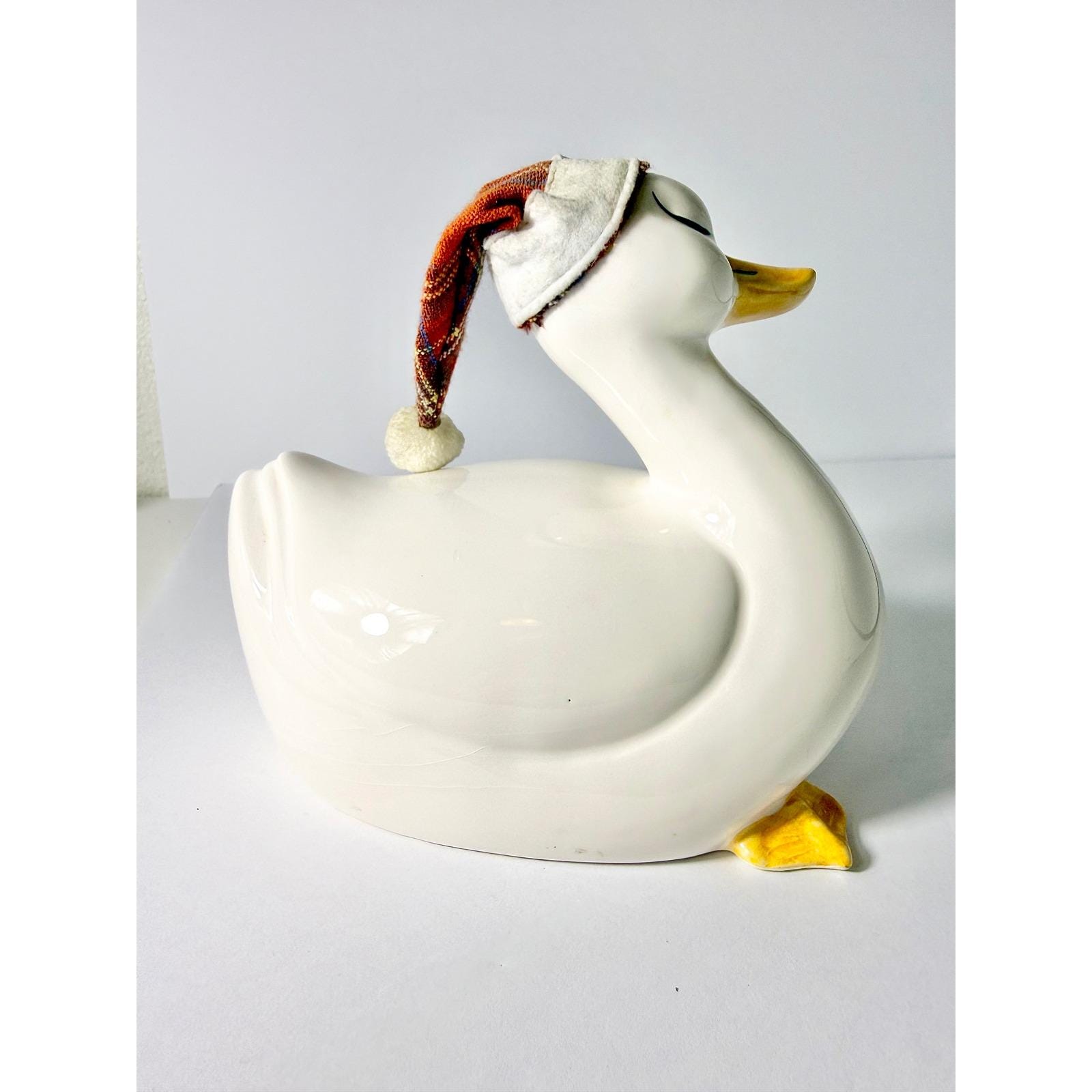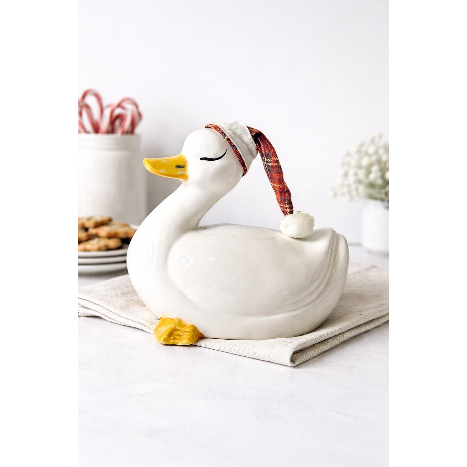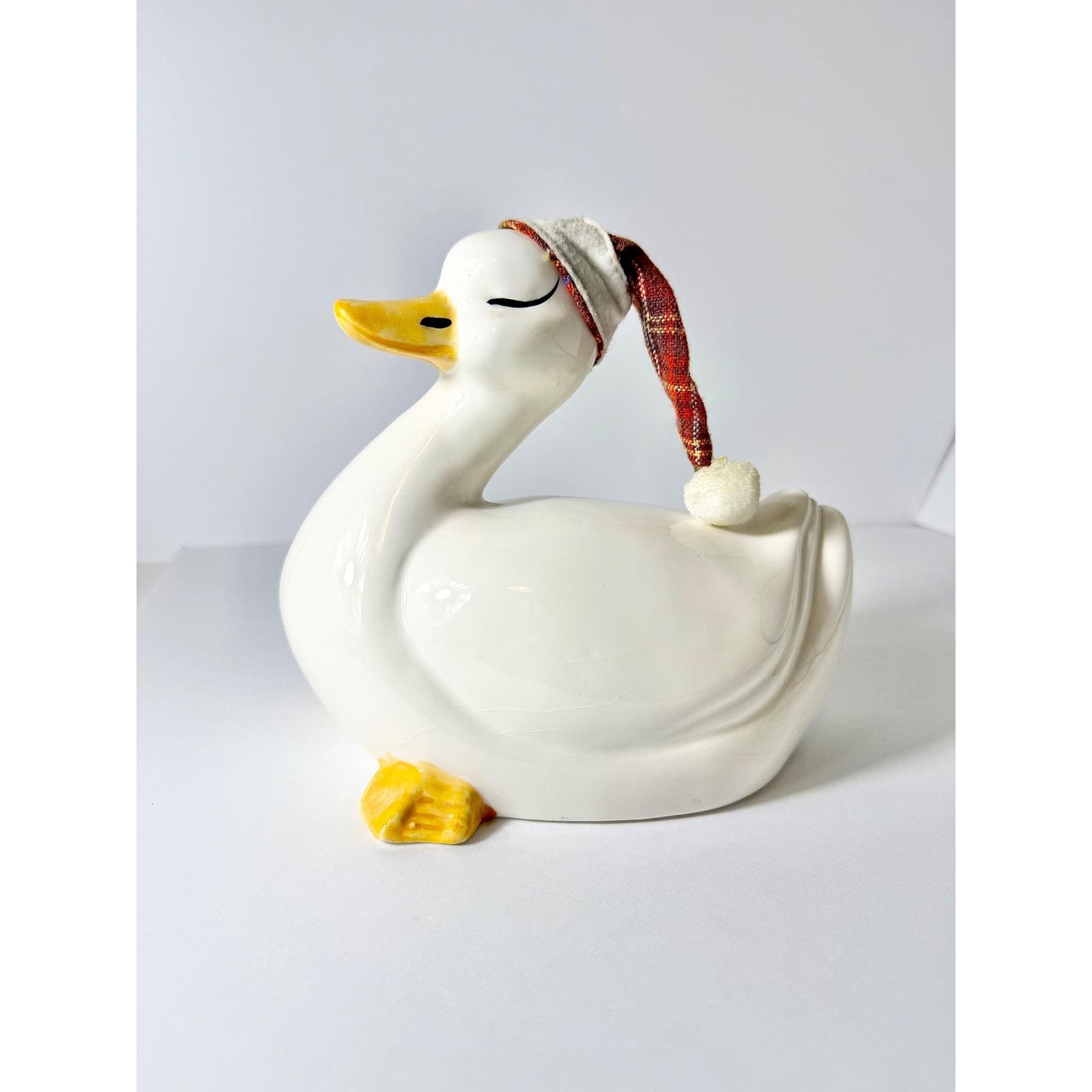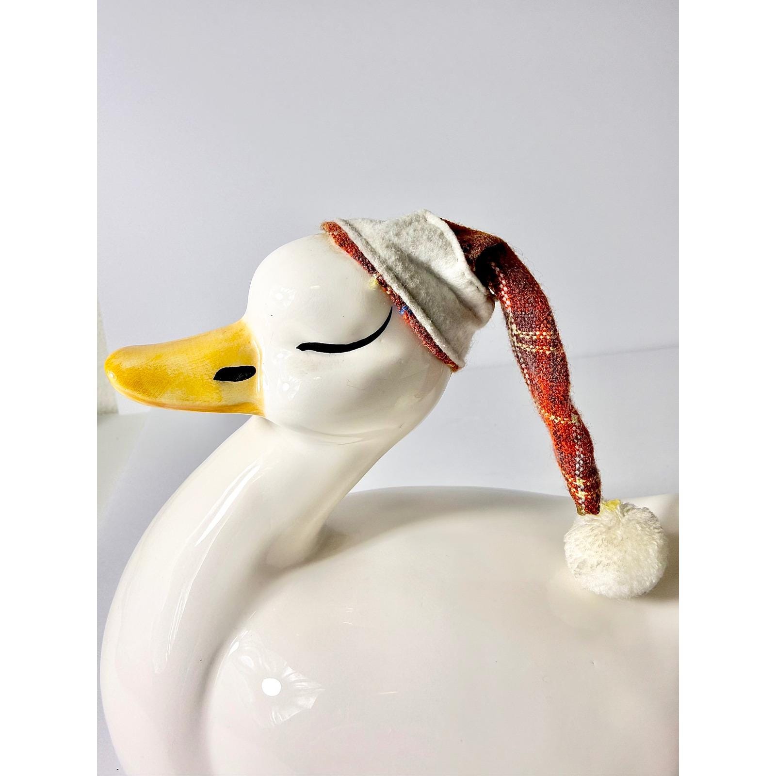 Cozy up your home with this charming ceramic duck, dreaming sweetly in its festive plaid hat. Perfect for gracing your mantelpiece during the winter holidays, adorning a shelf in a nursery, or adding a whimsical accent to your kitchen counter.