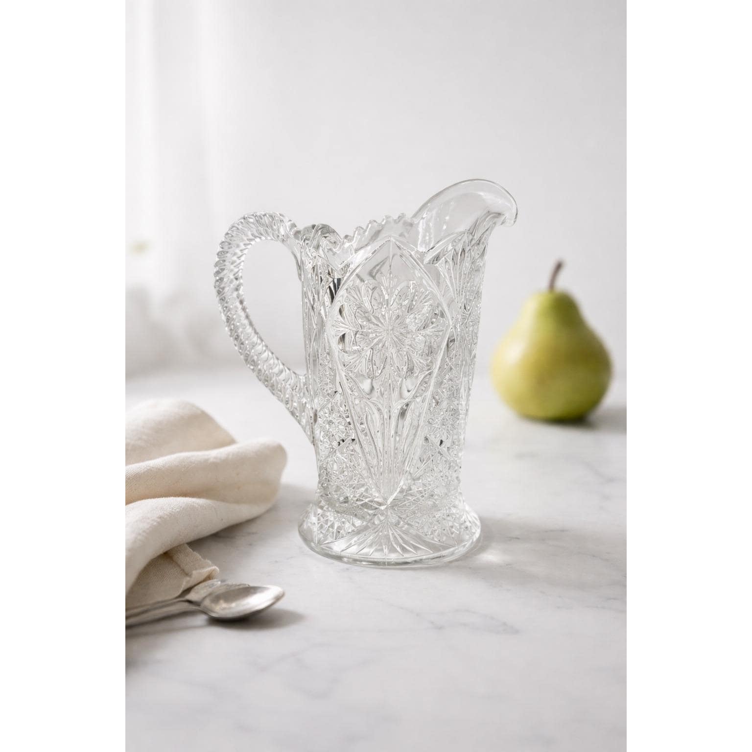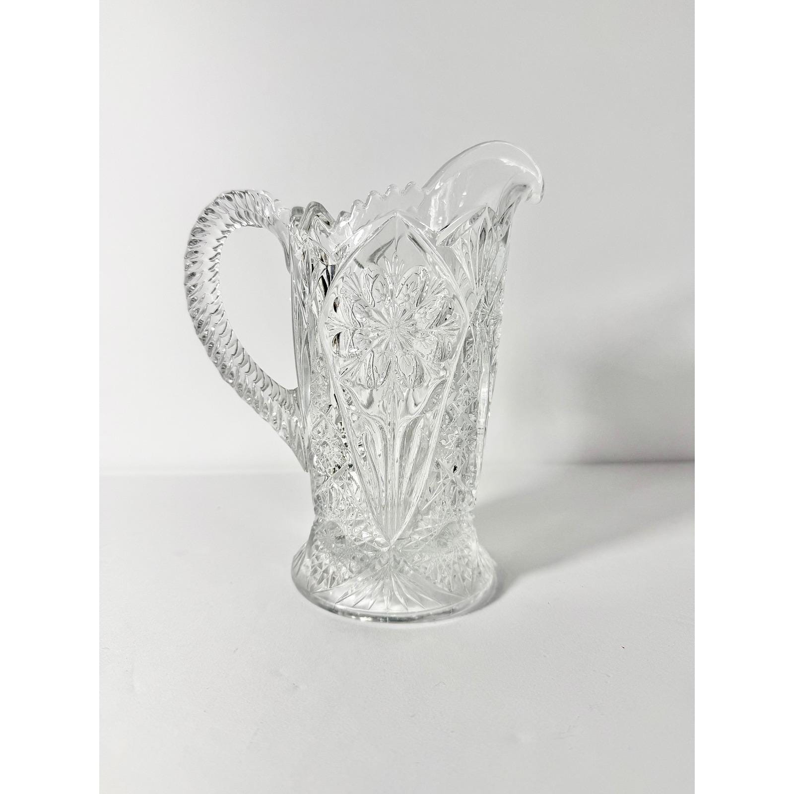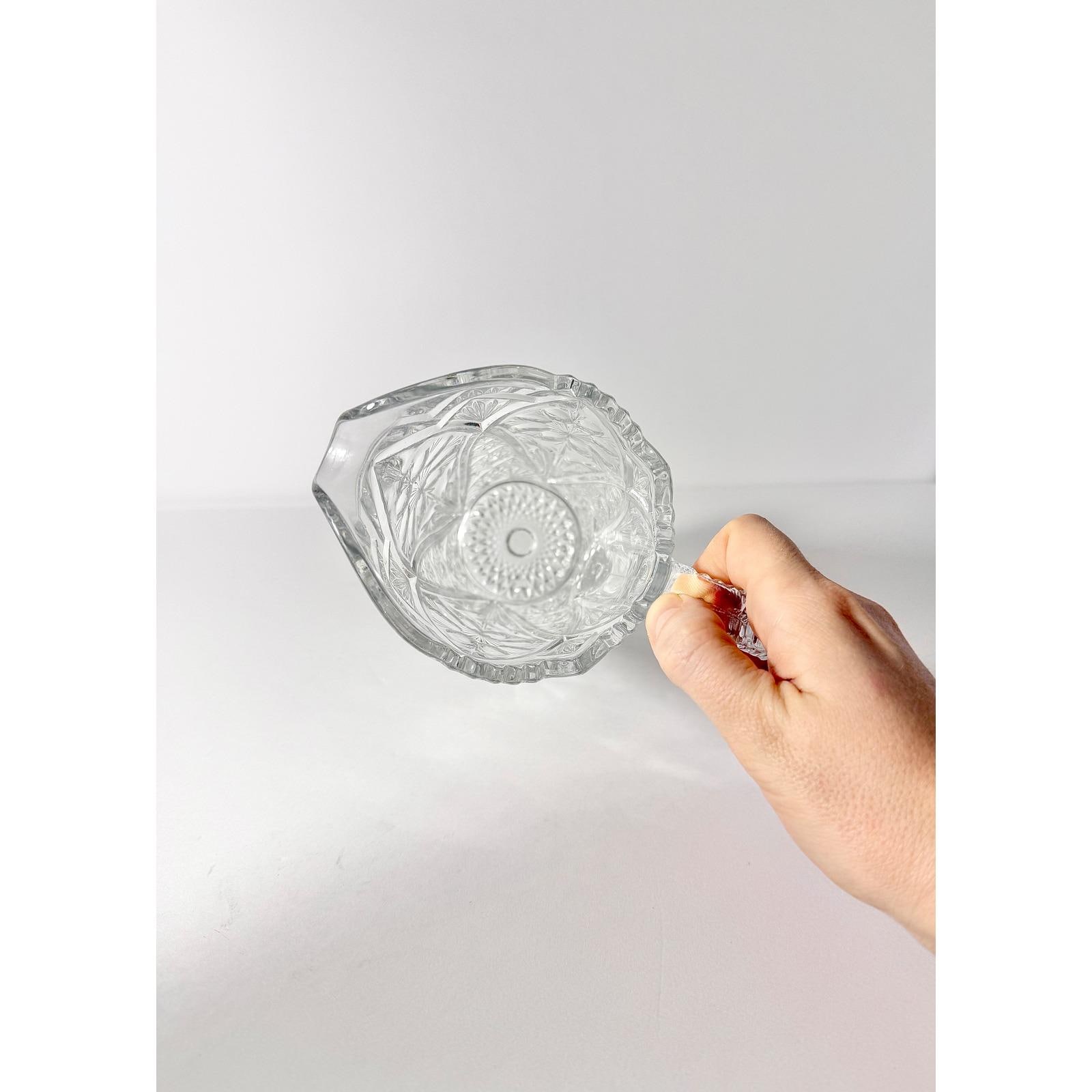 This American made pressed pattern glass pitcher was likely manufactured in the 1950's-1980's. It has a stunning floral design.