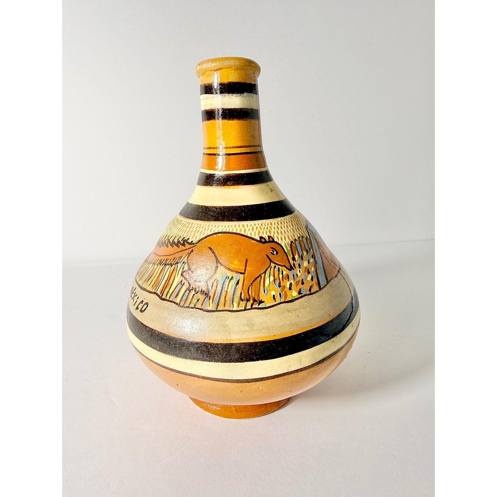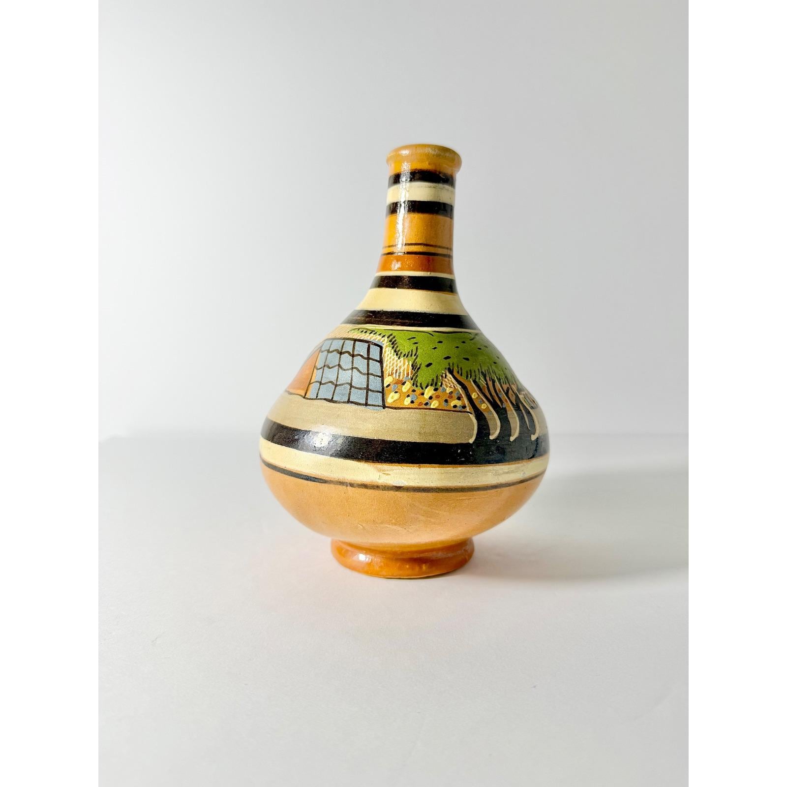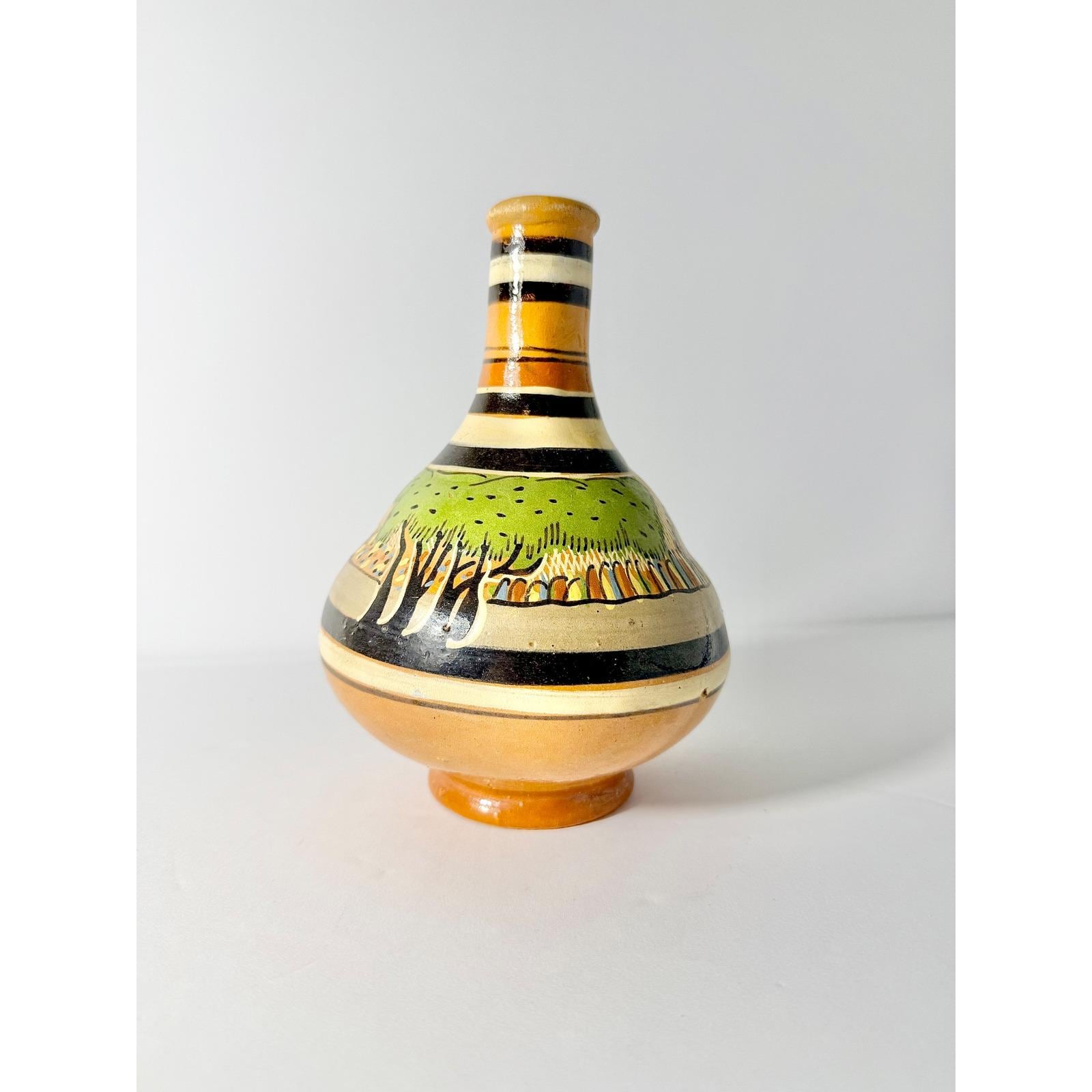 This hand made Mexican water jug is highly collectible and valued for its unique and cultural craftsmanship. It's made with terra cotta clay and finished with a glaze. It has a bulbous body and narrow neck, which can be used for stand alone decor or as a vase.