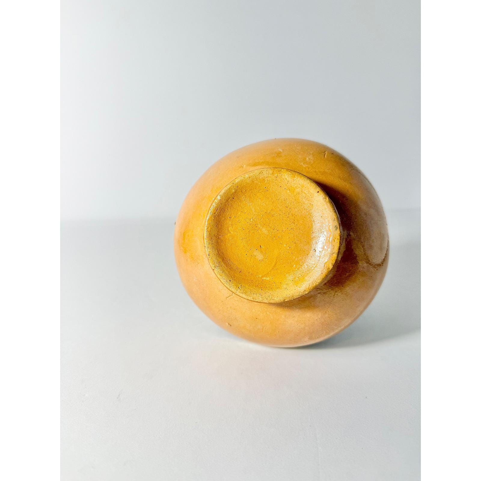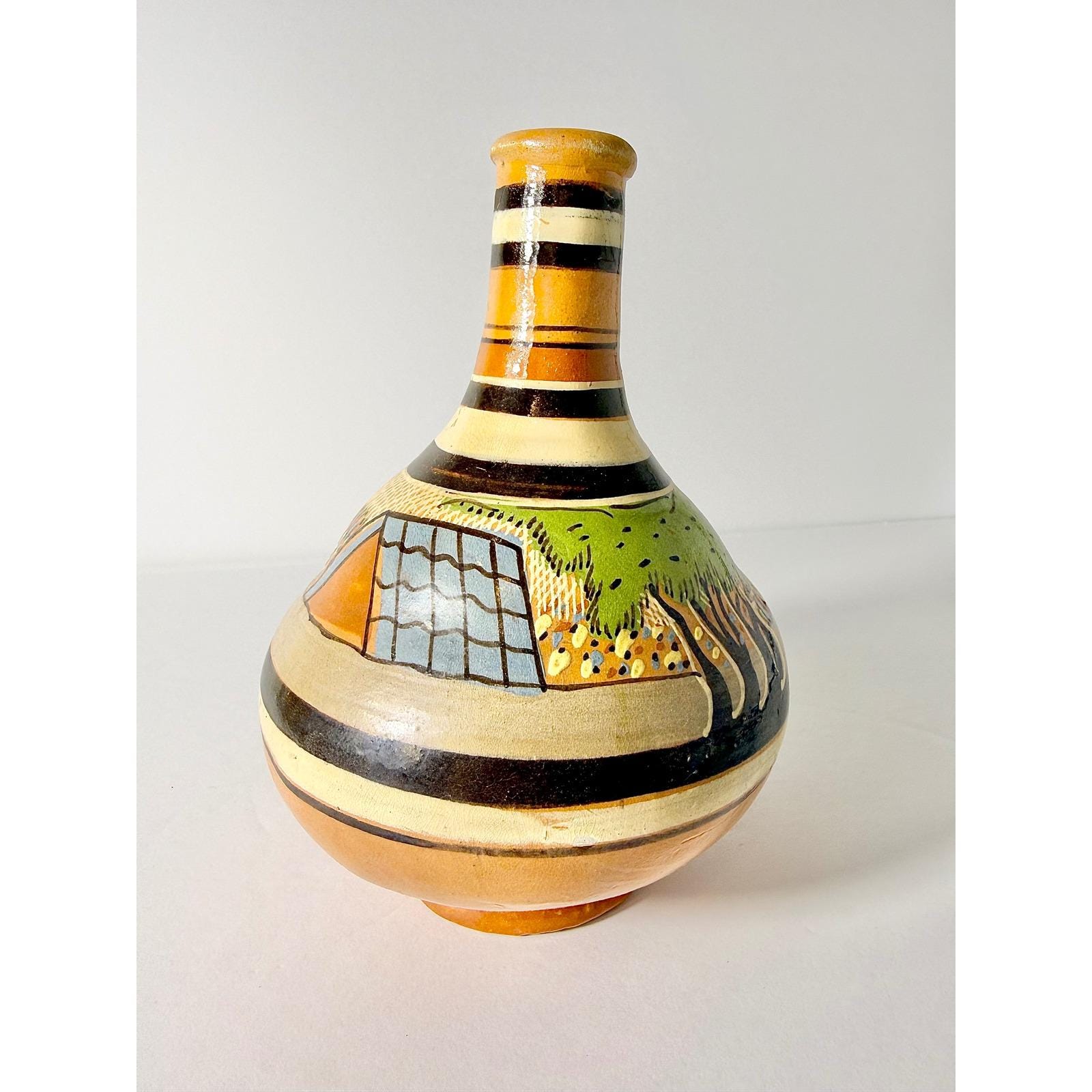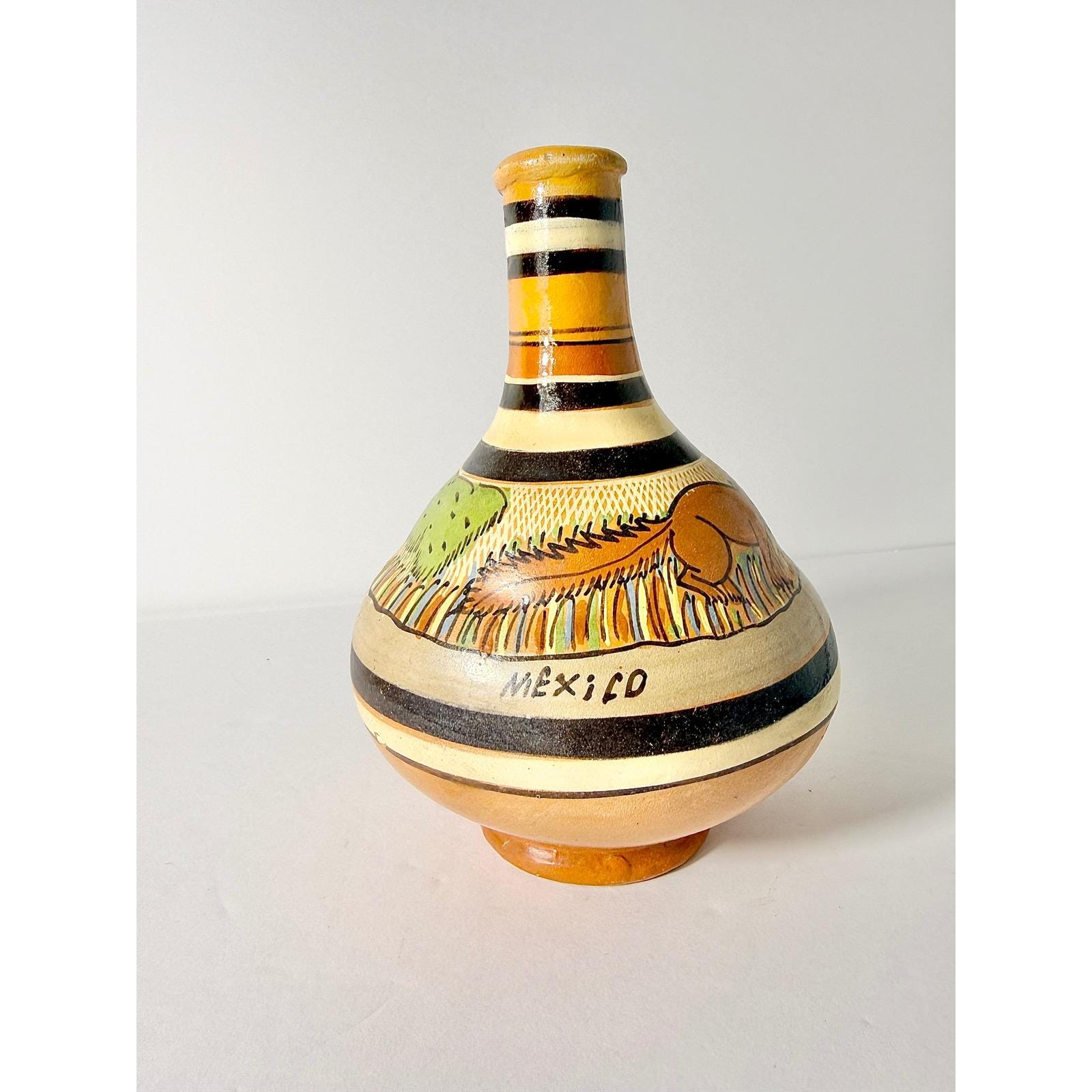 This hand made Mexican water jug is highly collectible and valued for its unique and cultural craftsmanship. It's made with terra cotta clay and finished with a glaze. It has a bulbous body and narrow neck, which can be used for stand alone decor or as a vase.