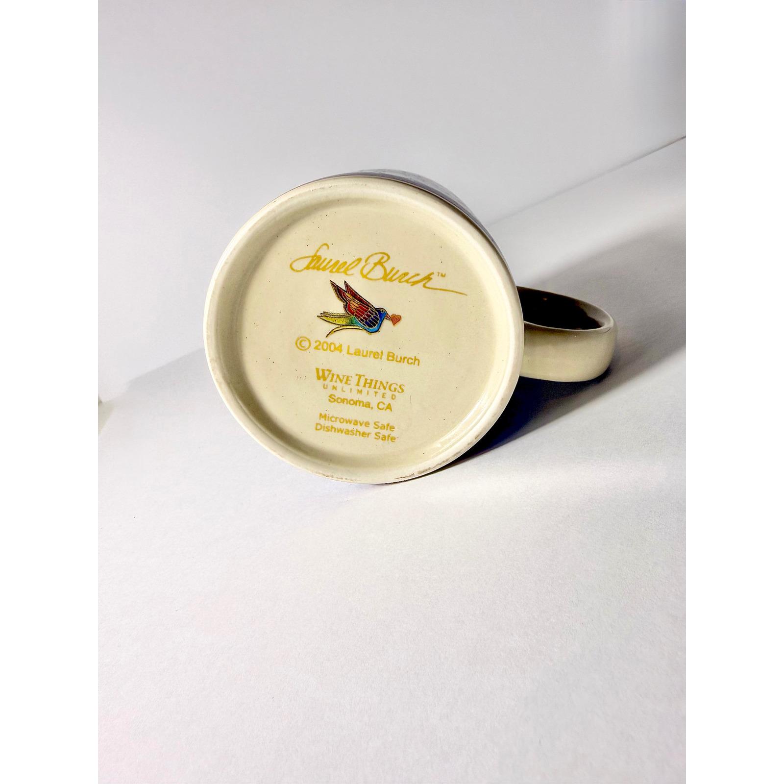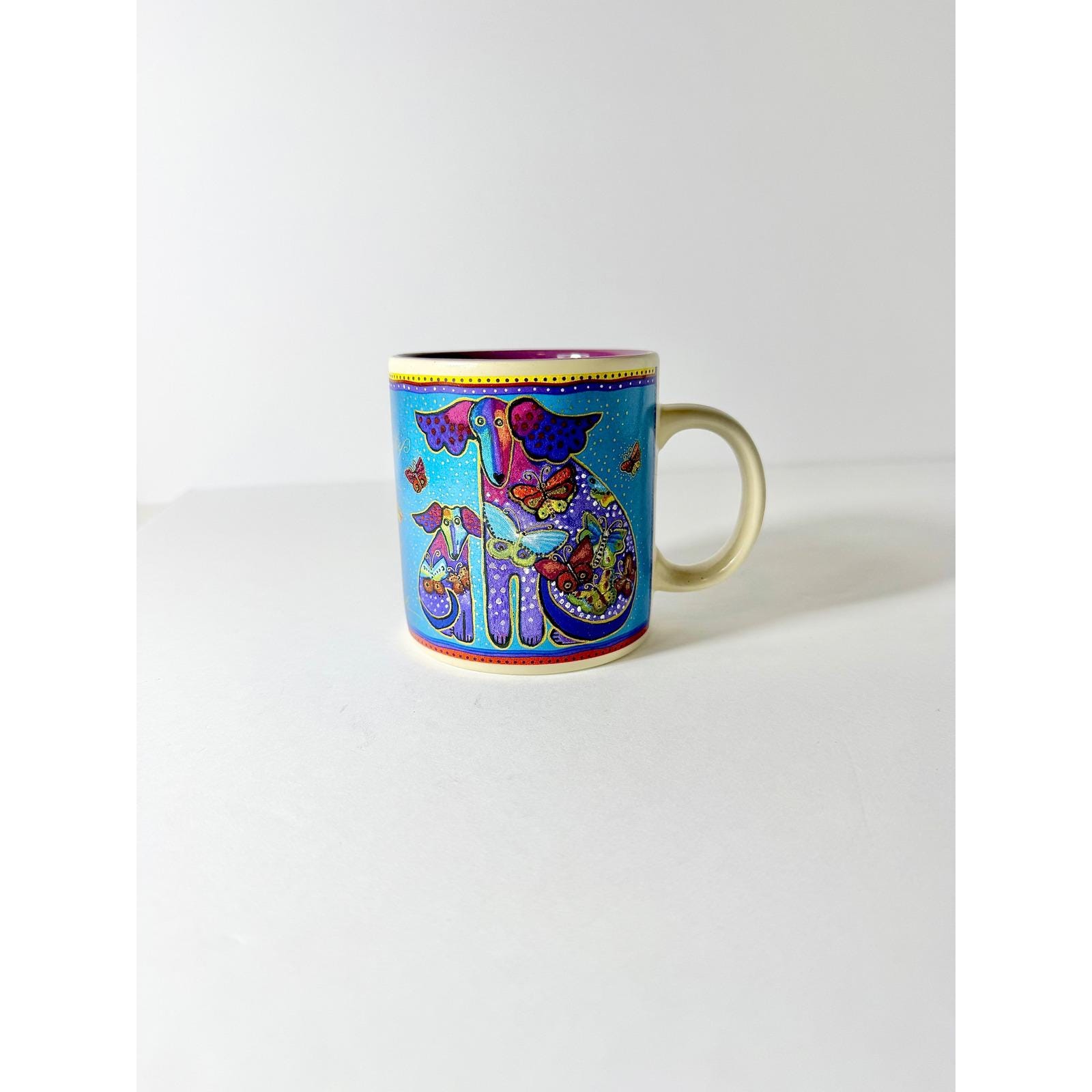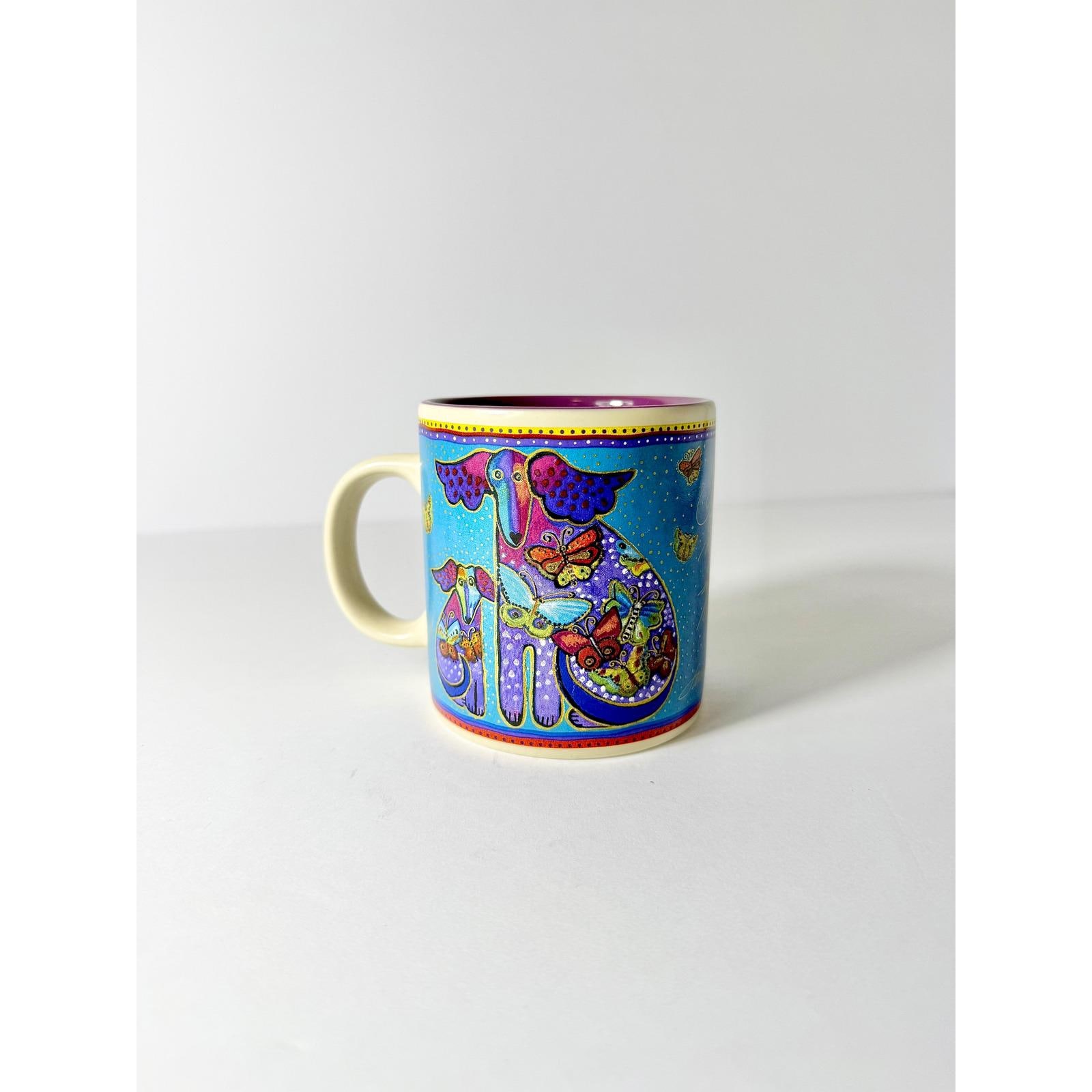 The mug features Laurel Burch's distinctive whimsical artwork of butterflies and a dog