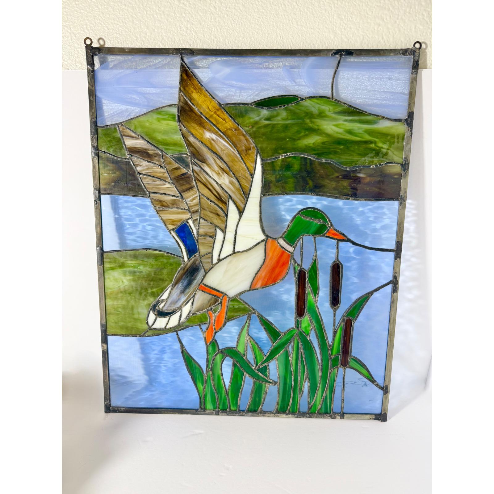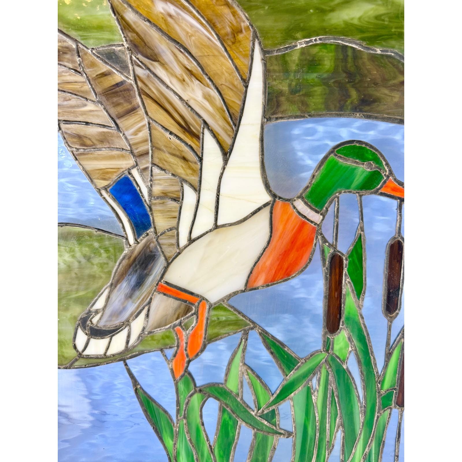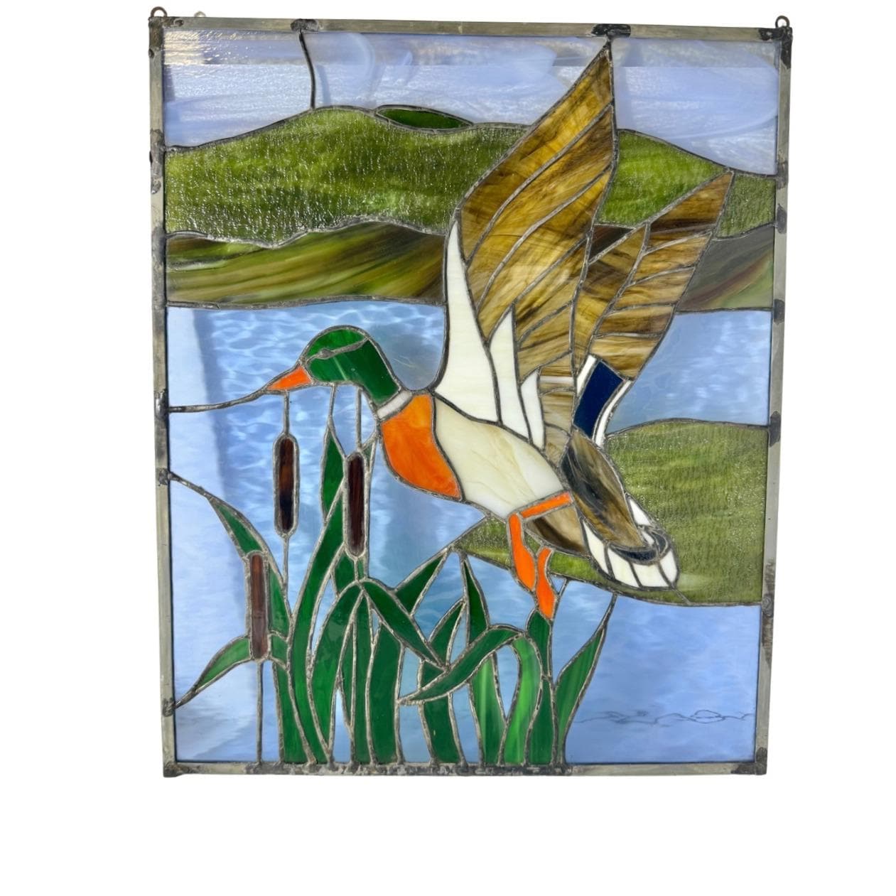 A gorgeous stained glass window panel featuring a colorful flying duck over a pond, rolling hills, and cattails.