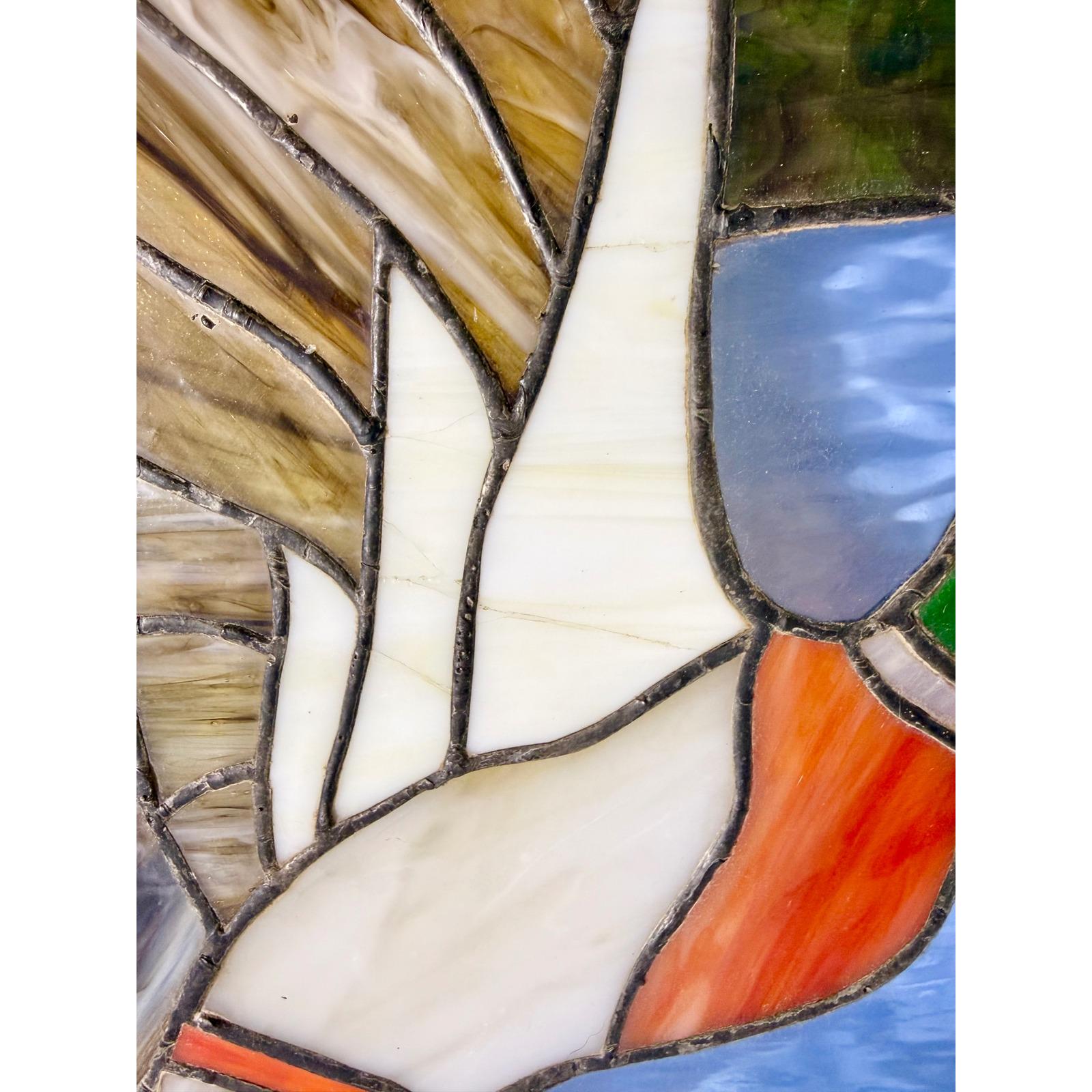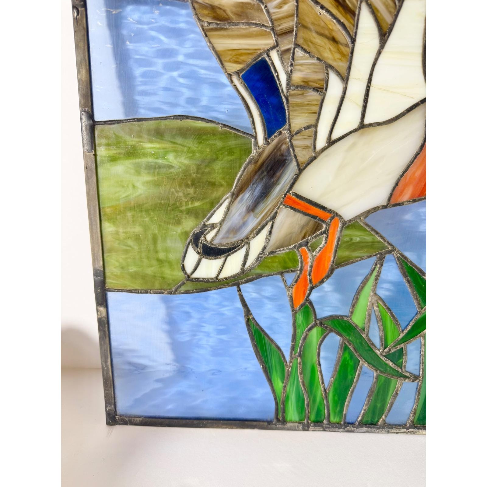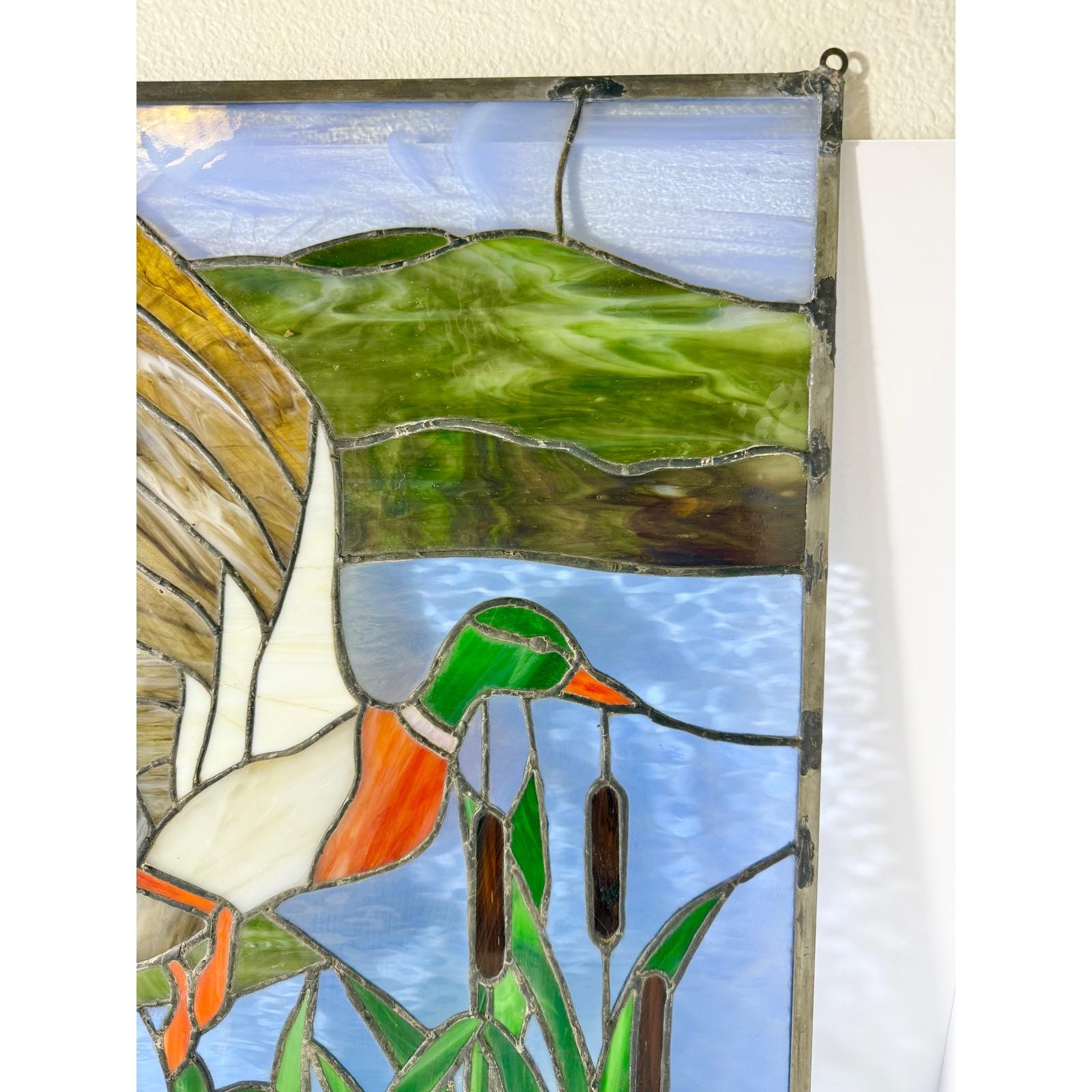 A gorgeous stained glass window panel featuring a colorful flying duck over a pond, rolling hills, and cattails.