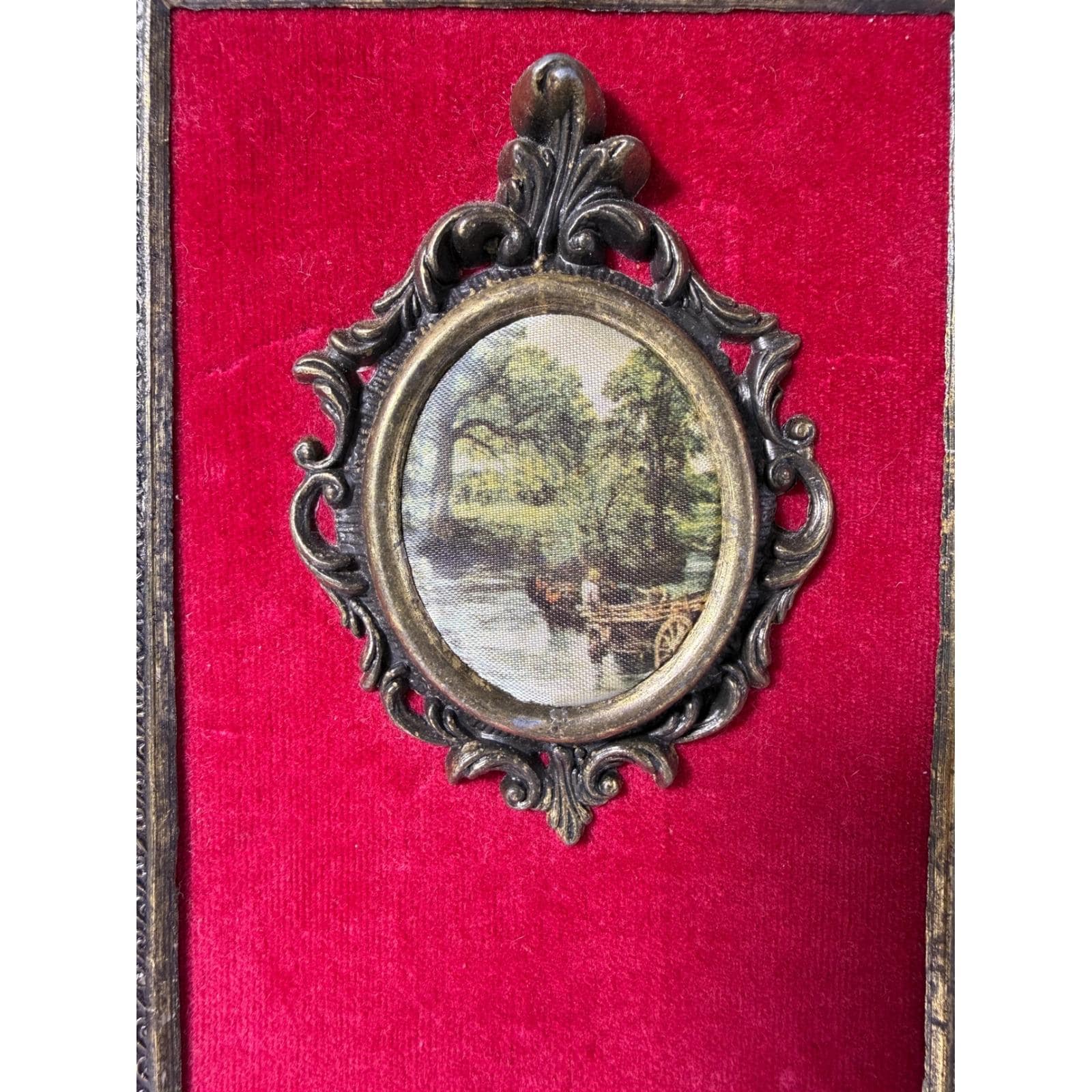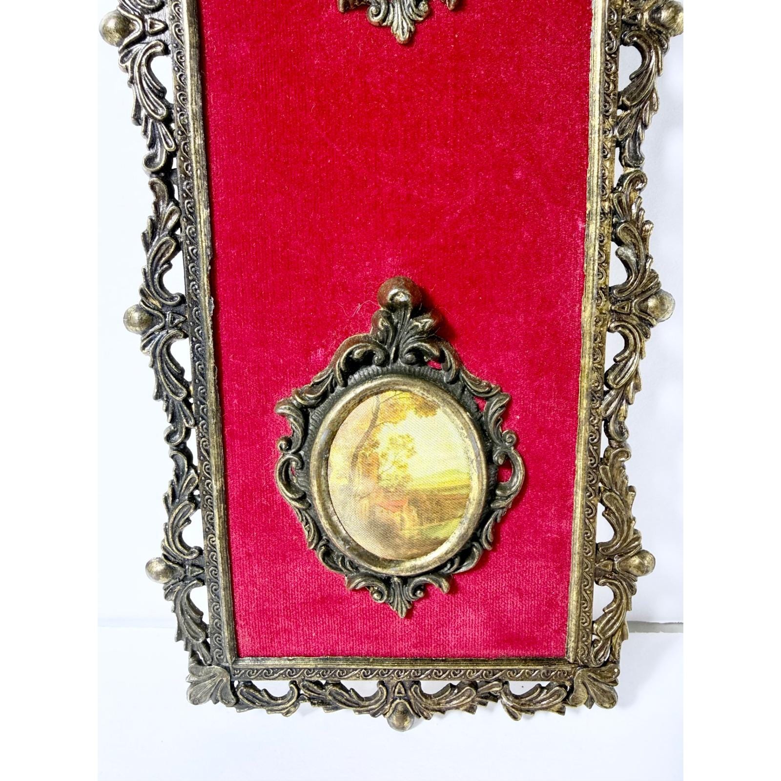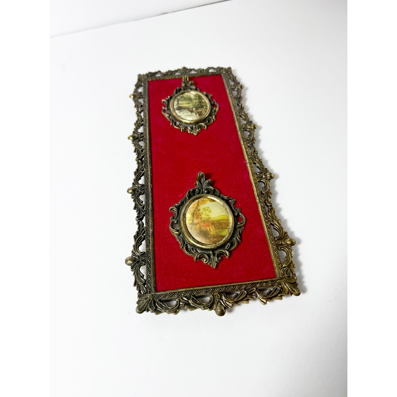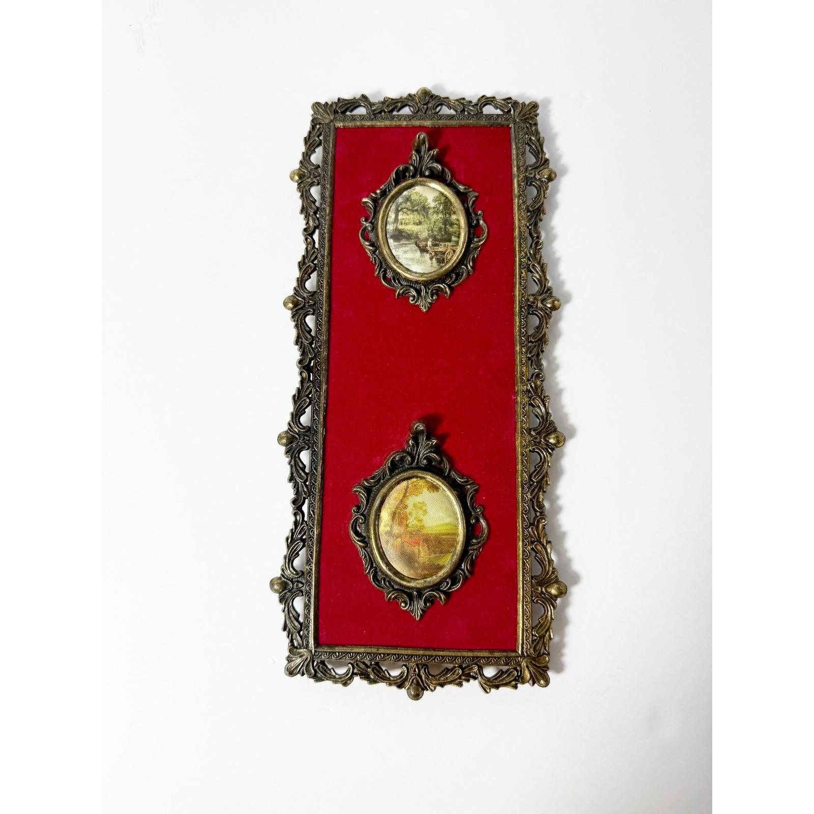 Vintage Italian Brass Ornate Framed Art with Red Velvet Backing