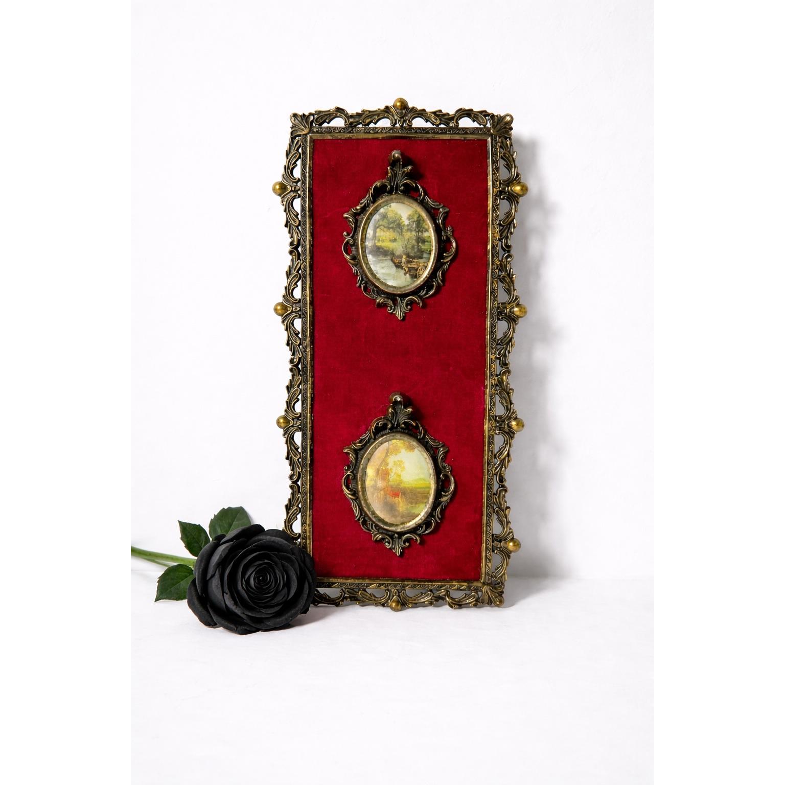 Features two smaller framed art prints mounted on a red velvet backing.