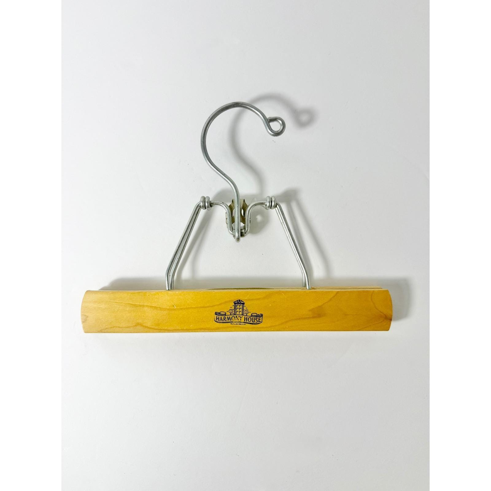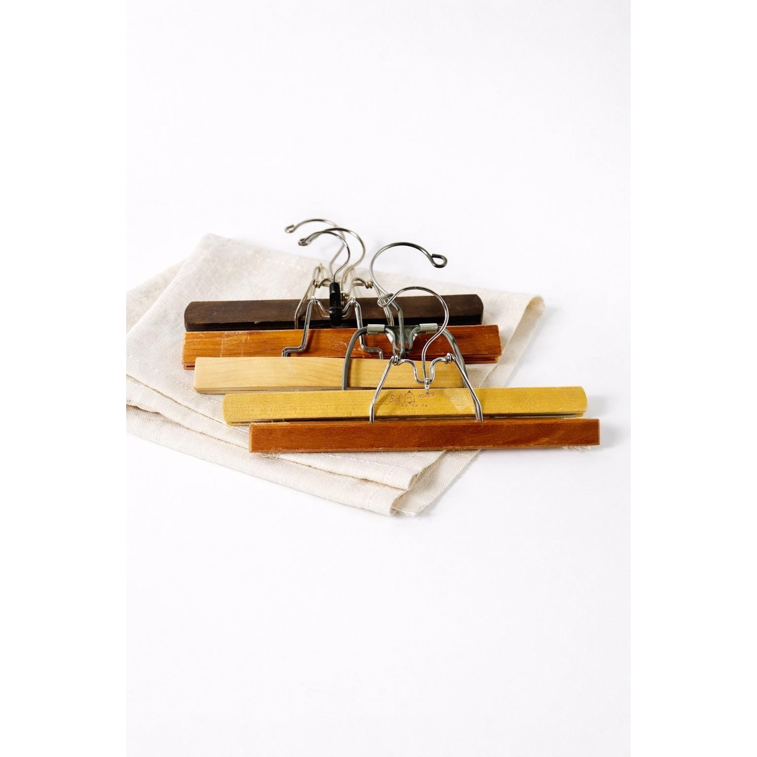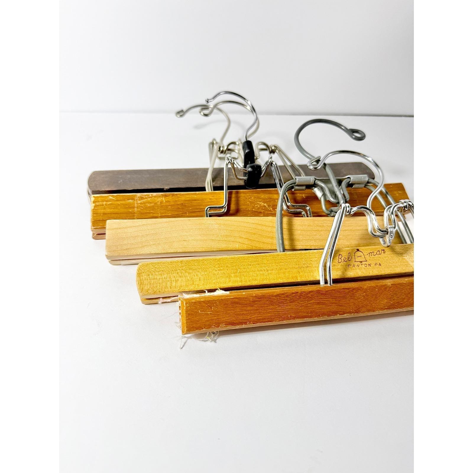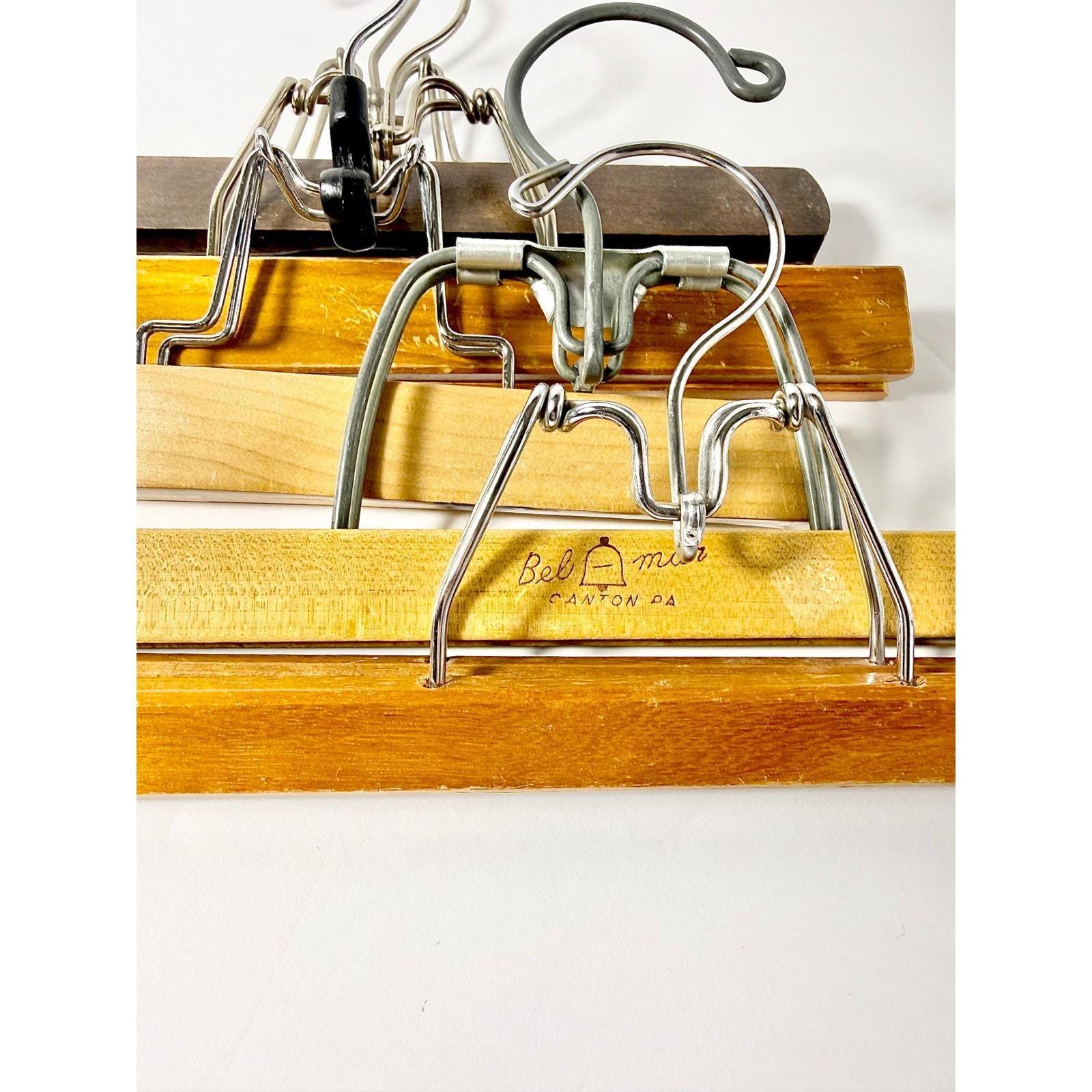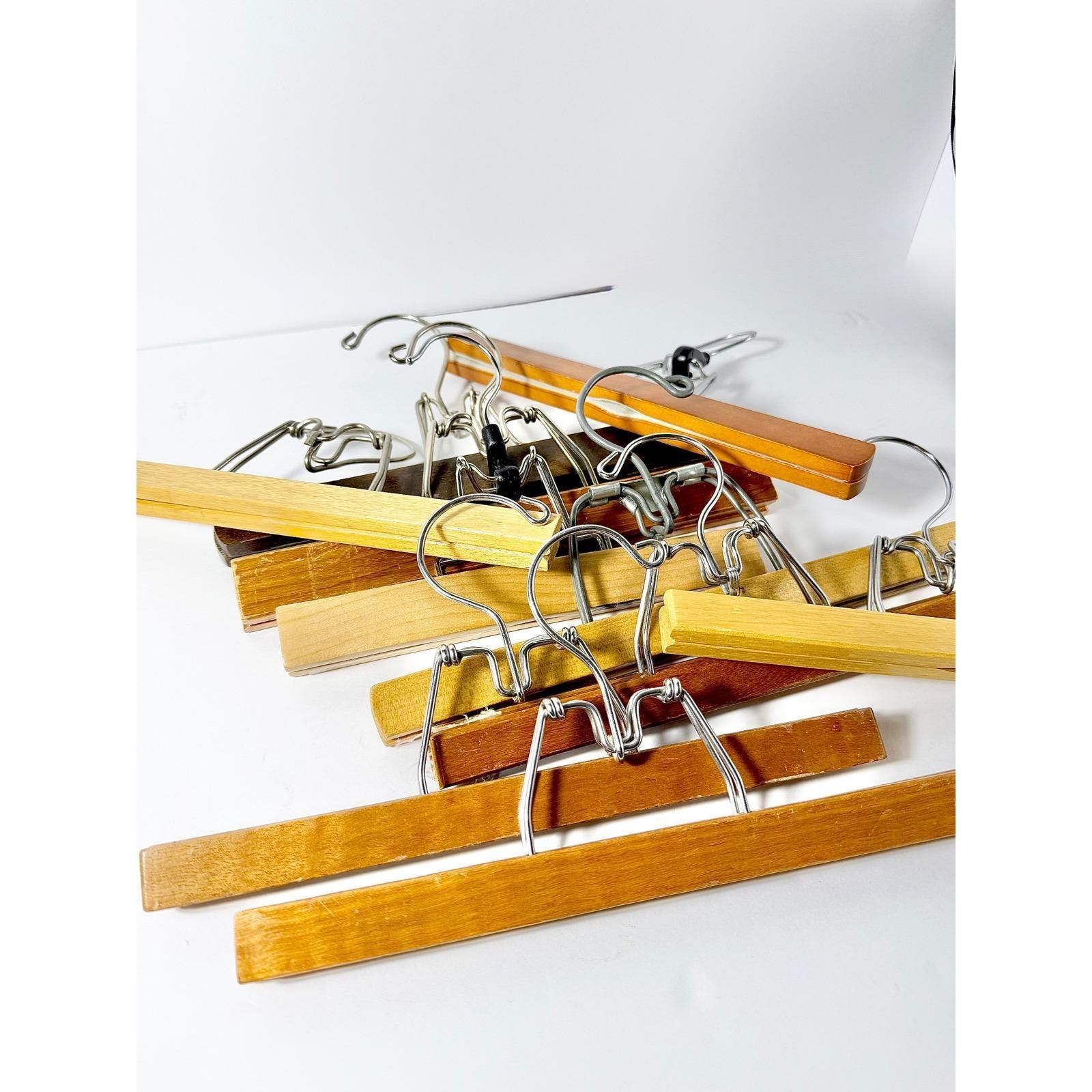 Assorted vintage wooden clamp pant hangers.