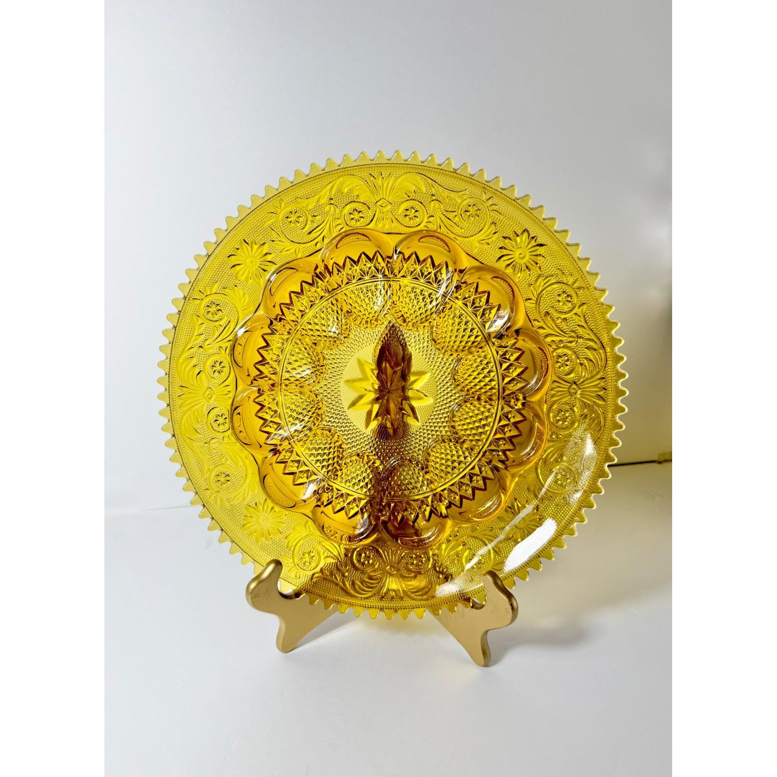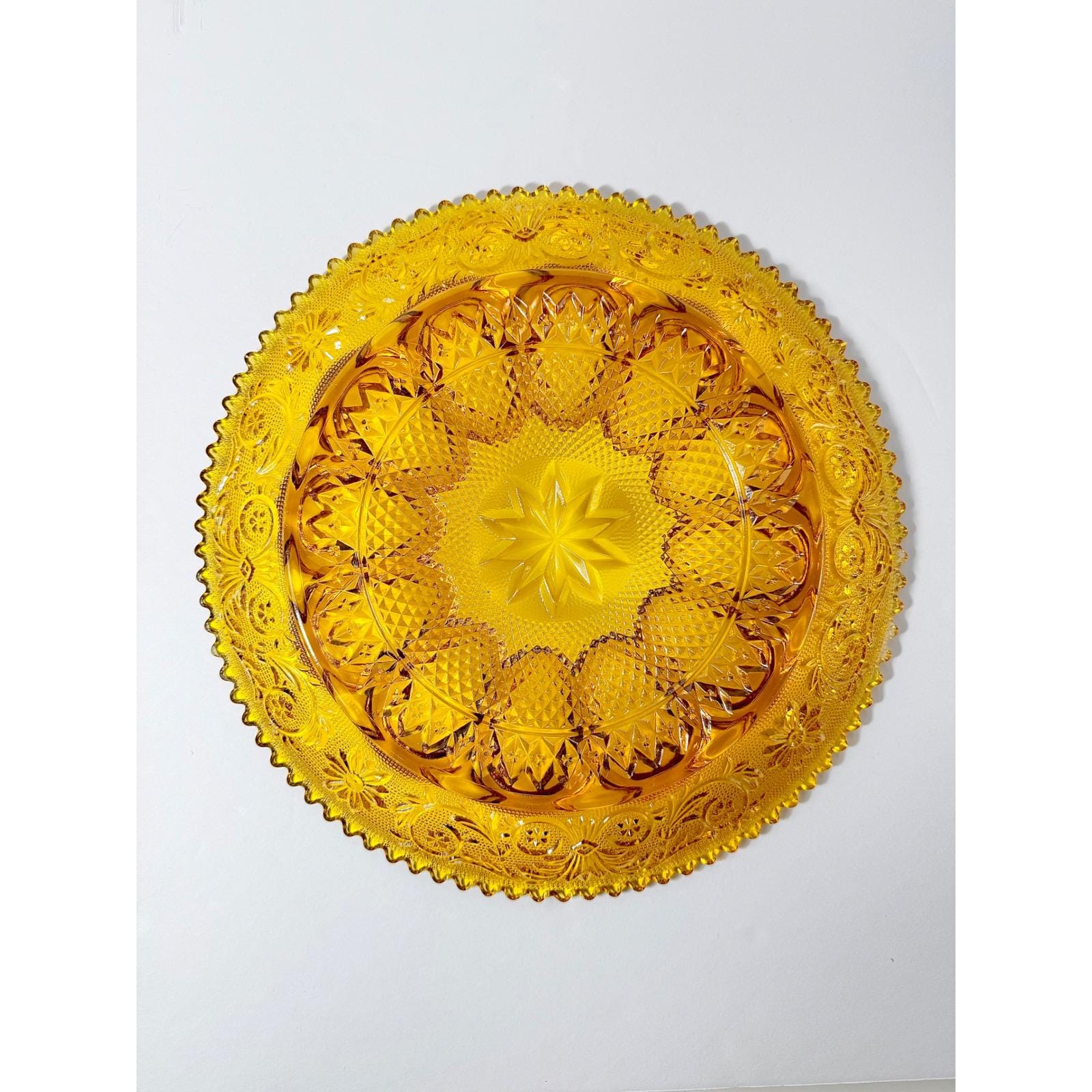 This stunning vintage deviled egg platter by Tiara Indiana Glass is crafted from heavy pressed amber glass and features beautifully detailed sawtooth edges. A bold central starburst design adds classic mid-century charm, making this piece both functional and display-worthy.
