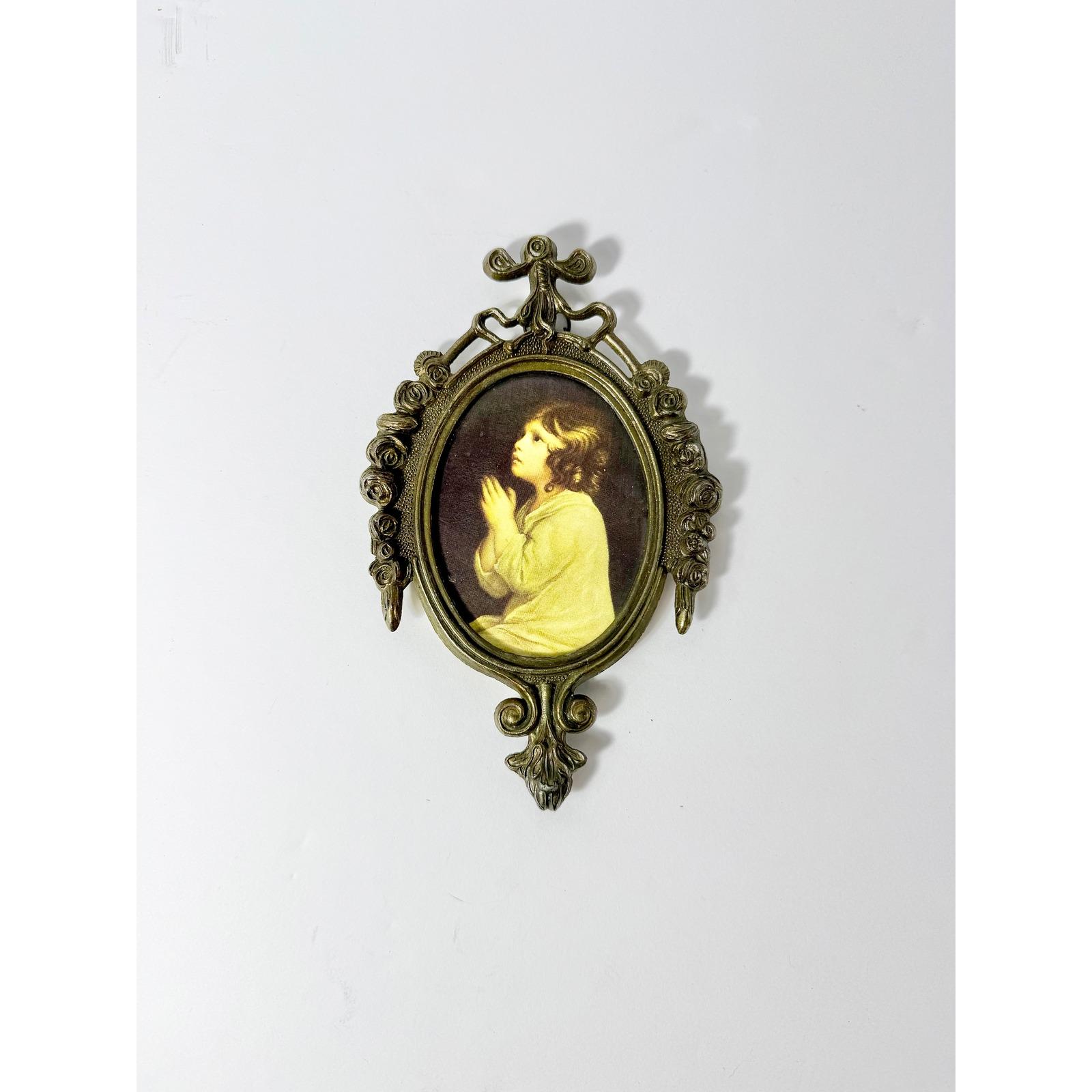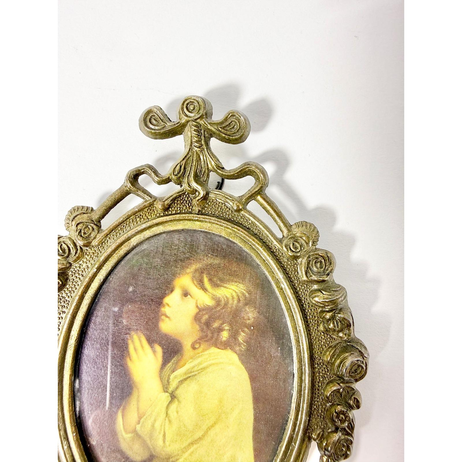 Vintage Italian Ornate Brass Oval Frame with Praying Child Print