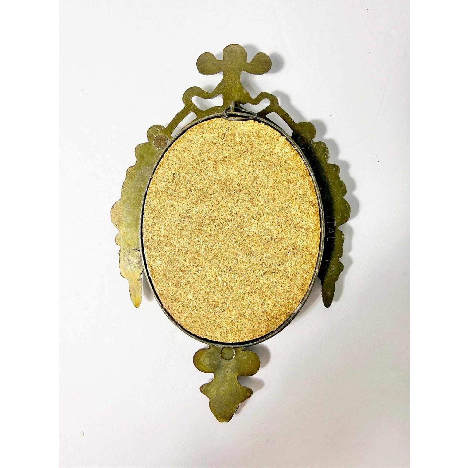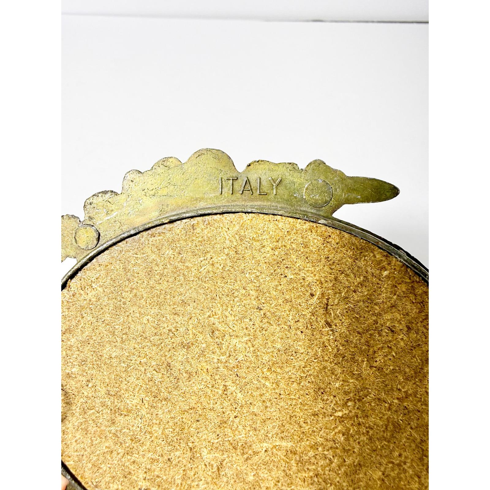 This vintage Italian oval frame features beautifully ornate brass detailing and holds a softly aged print of a praying child. The intricate metalwork and warm brass patina give the piece an old-world, heirloom quality that feels both sentimental and decorative.