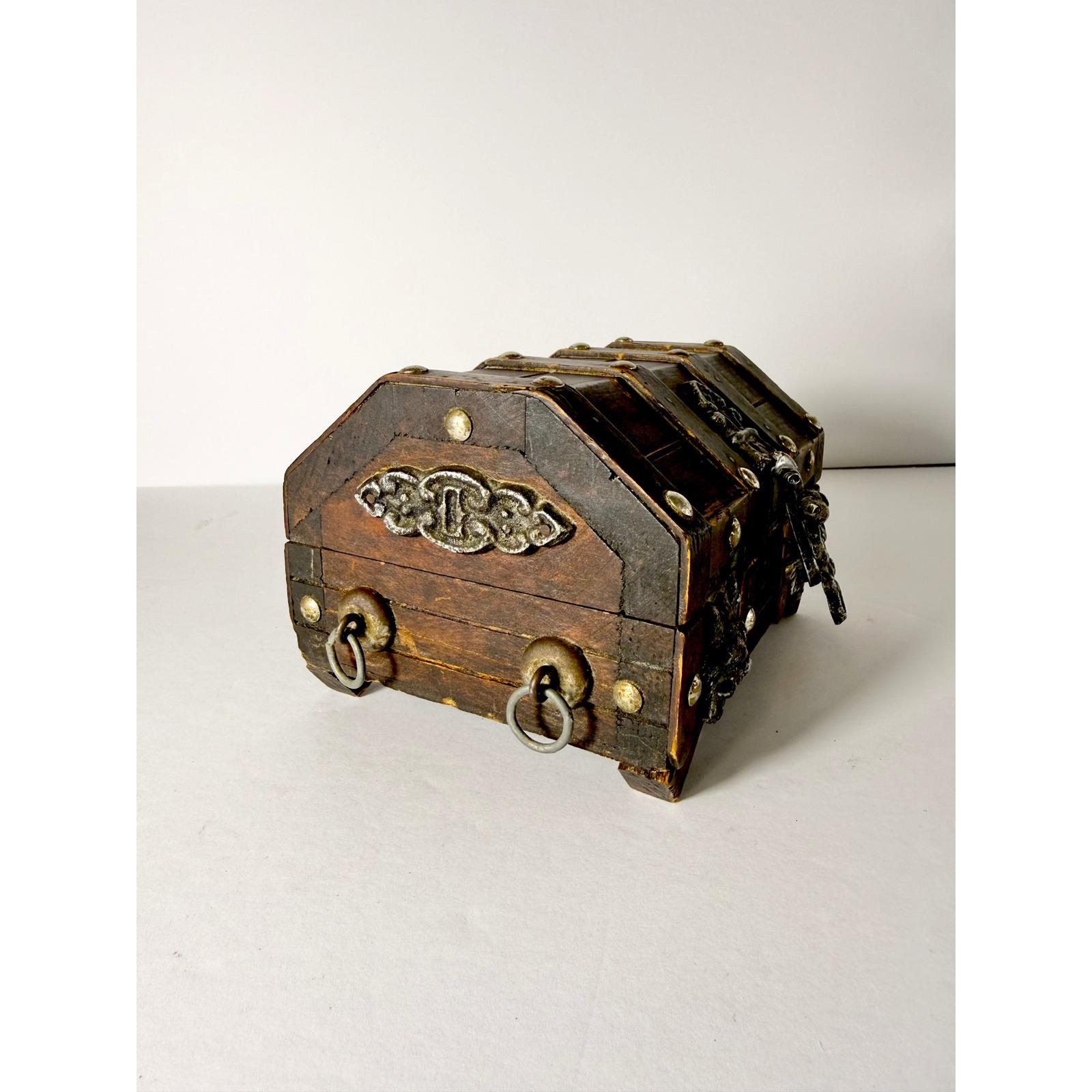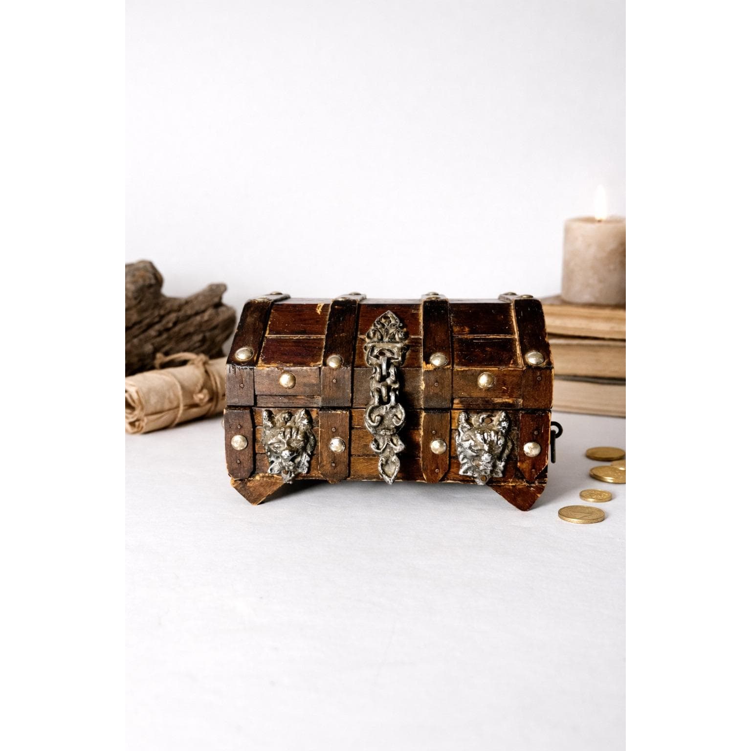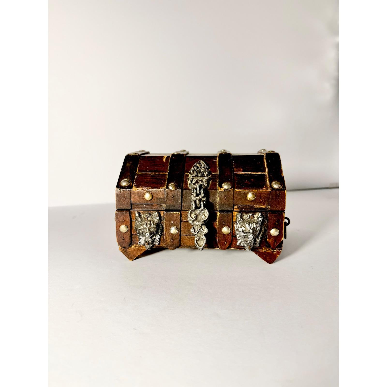 This vintage wood treasure chest features bold metal lion head accents and dark, gothic detailing that give it an old-world, almost medieval feel to fuel your dark academia dreams. The solid wood construction and aged hardware make it a striking decorative piece with real presence.