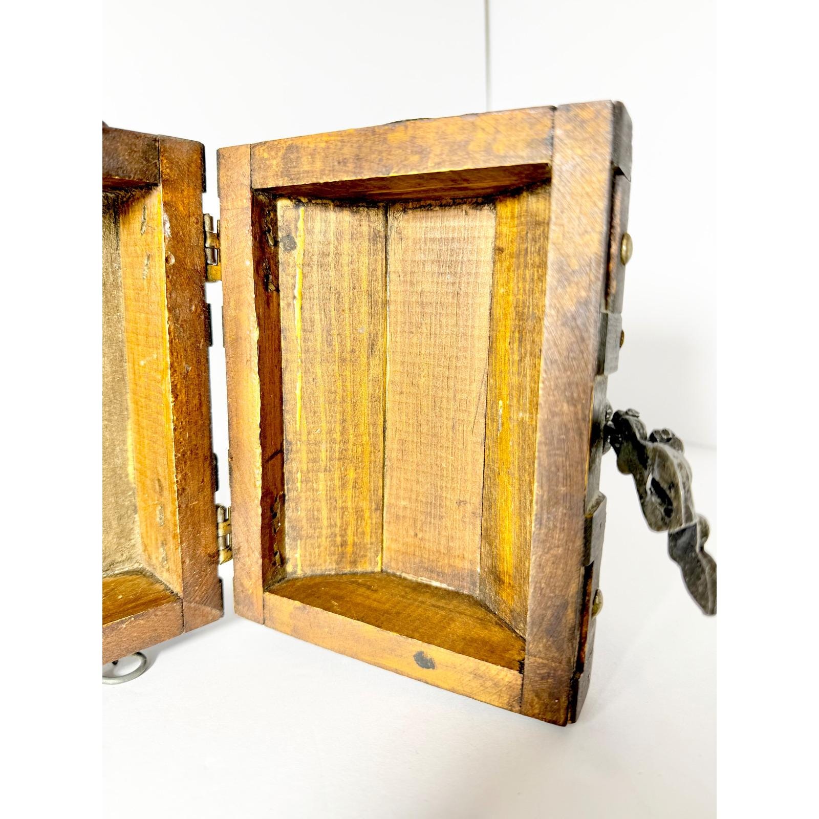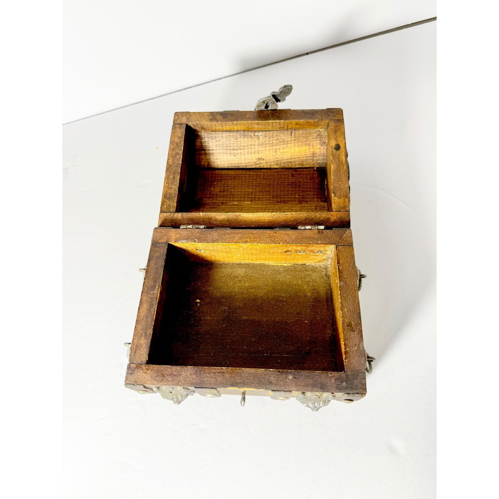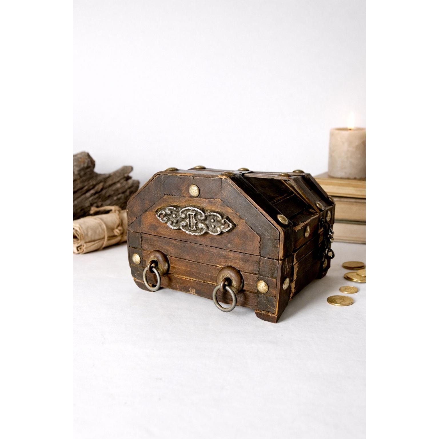 This vintage wood treasure chest features bold metal lion head accents and dark, gothic detailing that give it an old-world, almost medieval feel to fuel your dark academia dreams. The solid wood construction and aged hardware make it a striking decorative piece with real presence.
