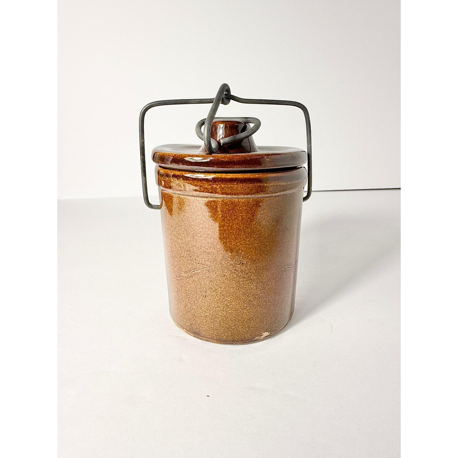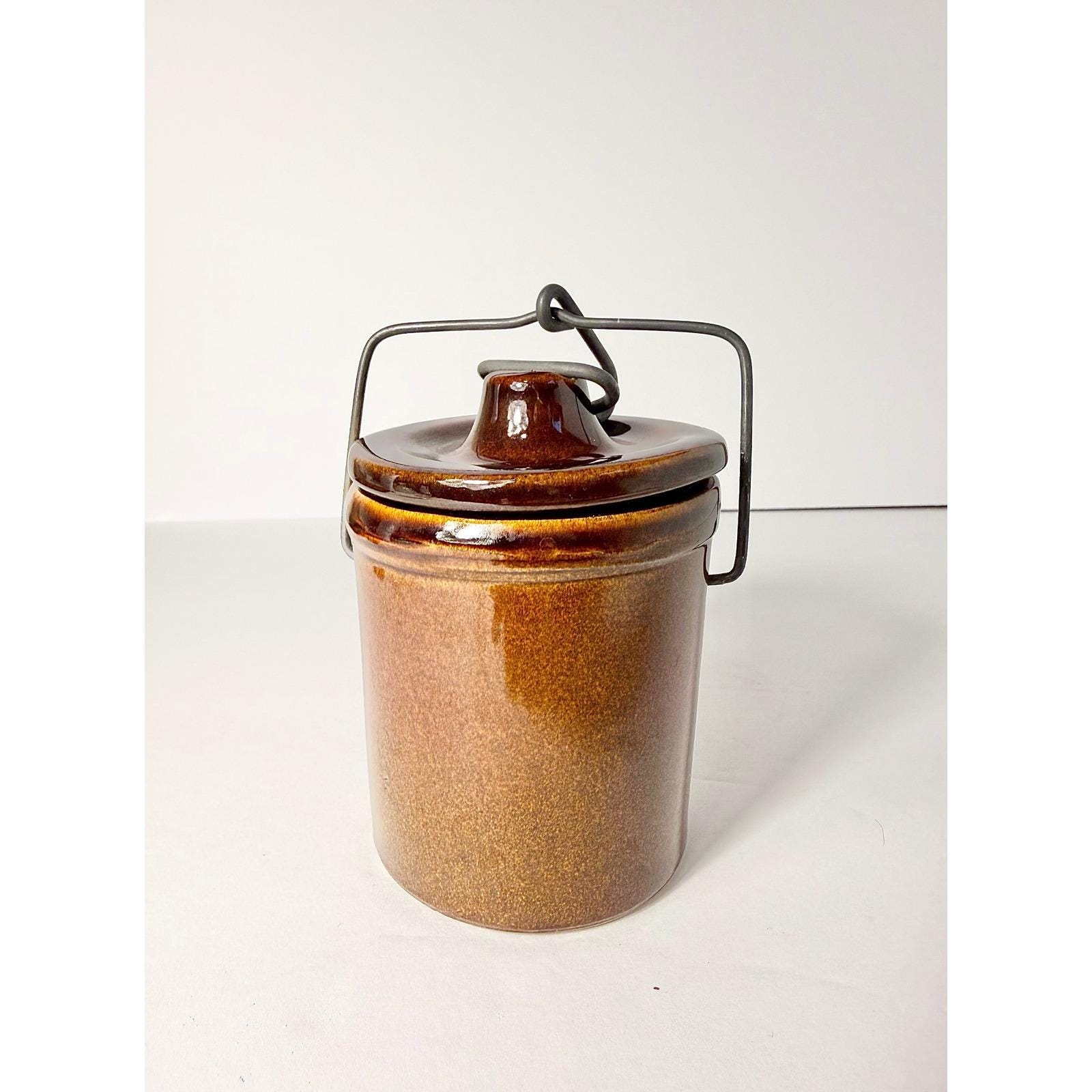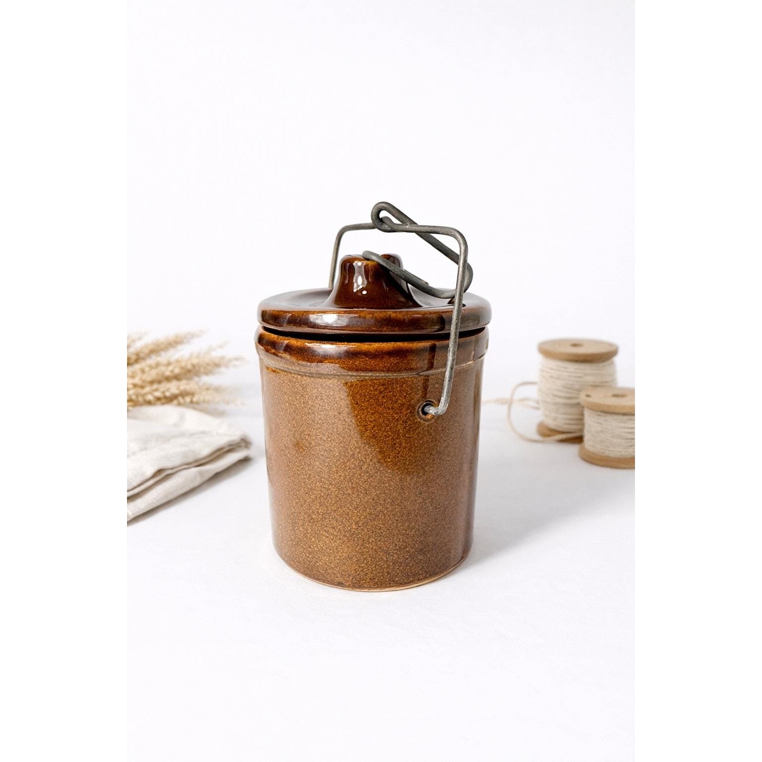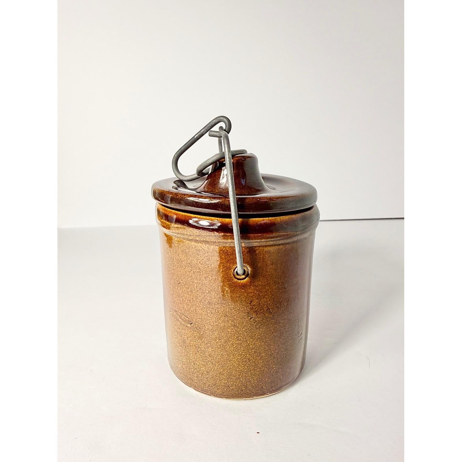 This crock has a simple, sturdy form with that classic stoneware look that works well in farmhouse, primitive, or early kitchen displays. The lid is complete with a wire bail closure meant to keep the crocks airtight. There is no rubber in the lid.