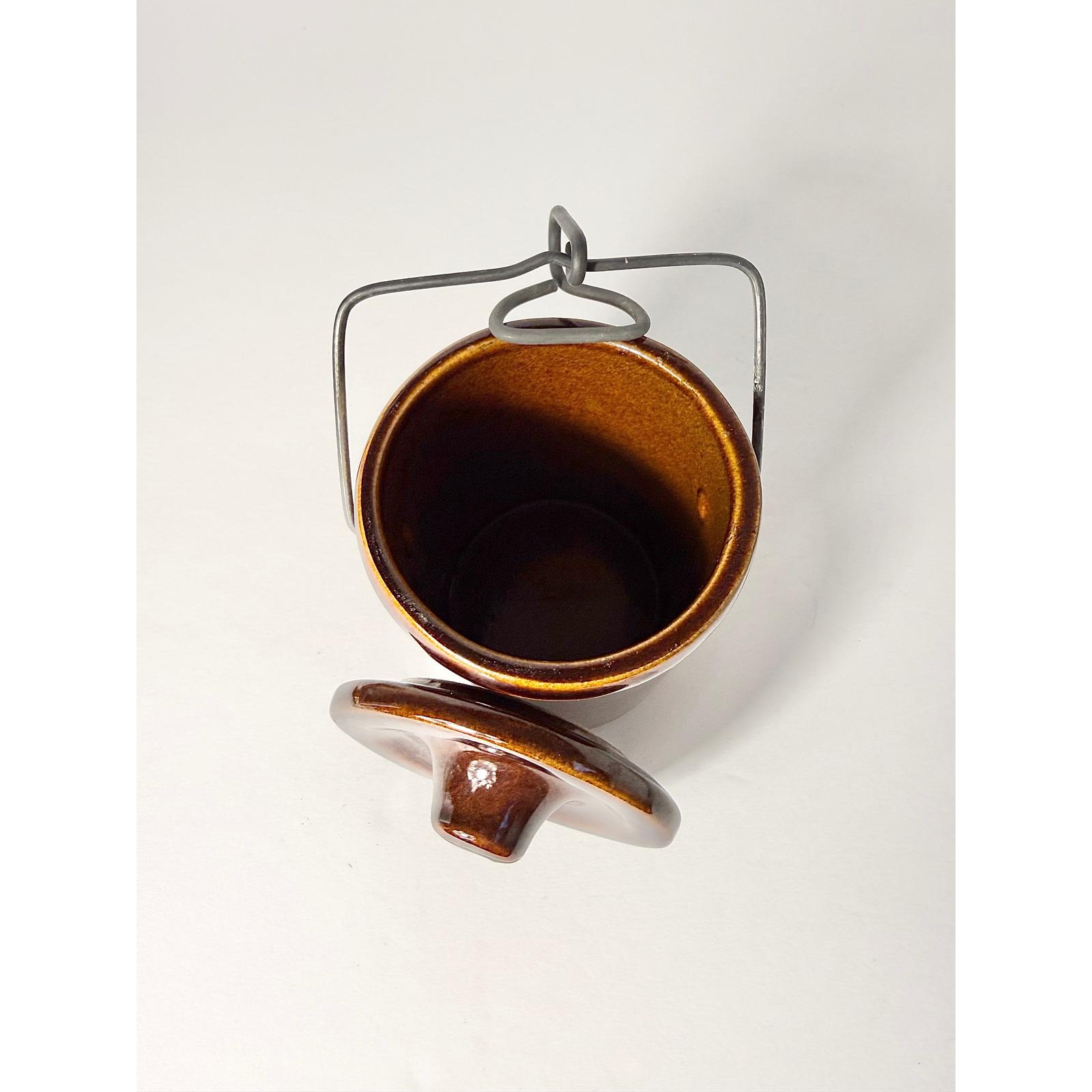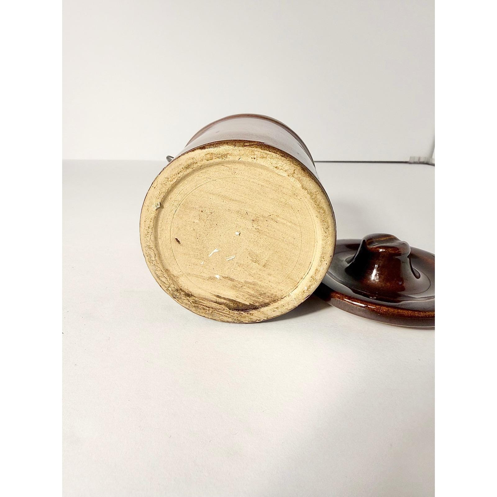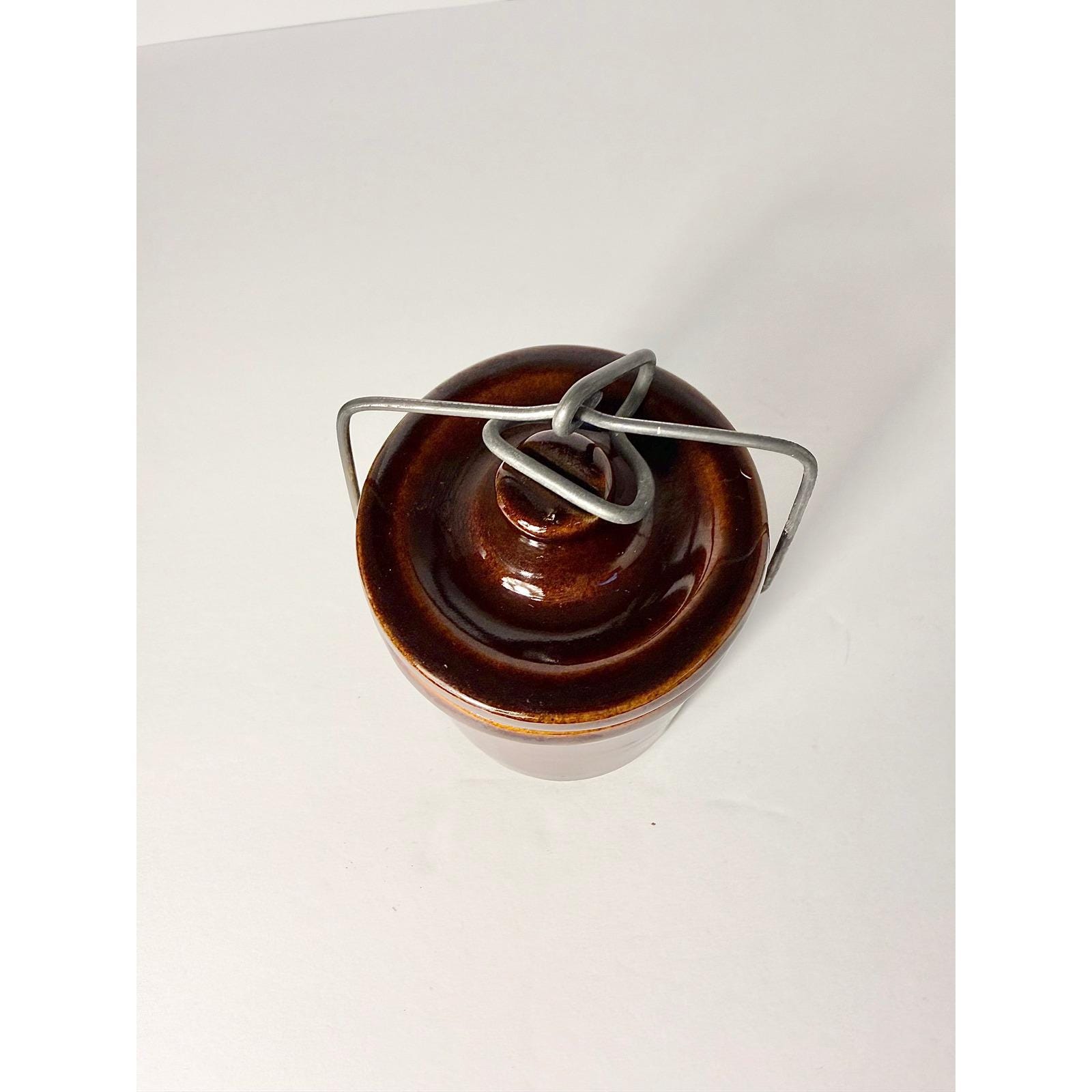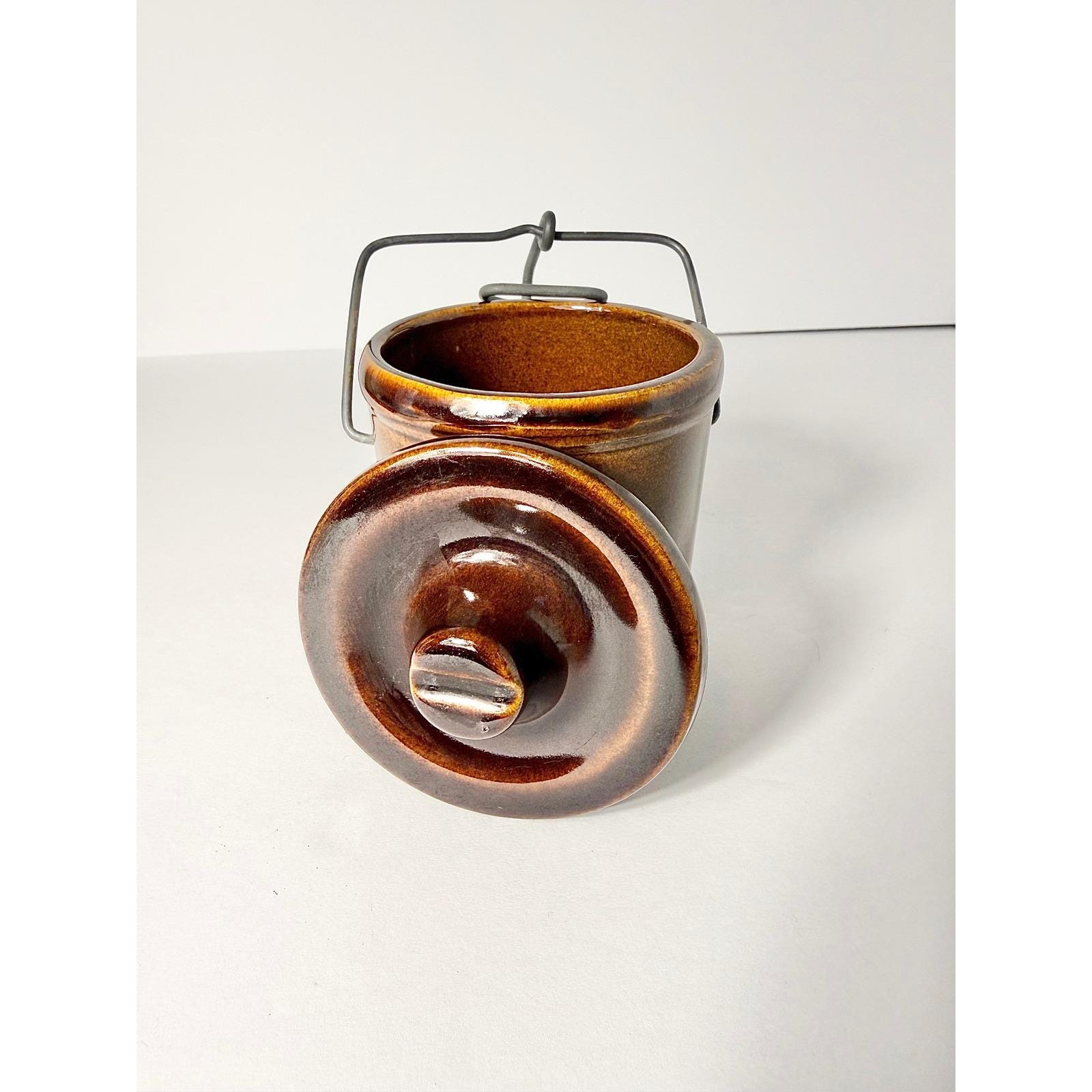 This crock has a simple, sturdy form with that classic stoneware look that works well in farmhouse, primitive, or early kitchen displays. The lid is complete with a wire bail closure meant to keep the crocks airtight. There is no rubber in the lid.