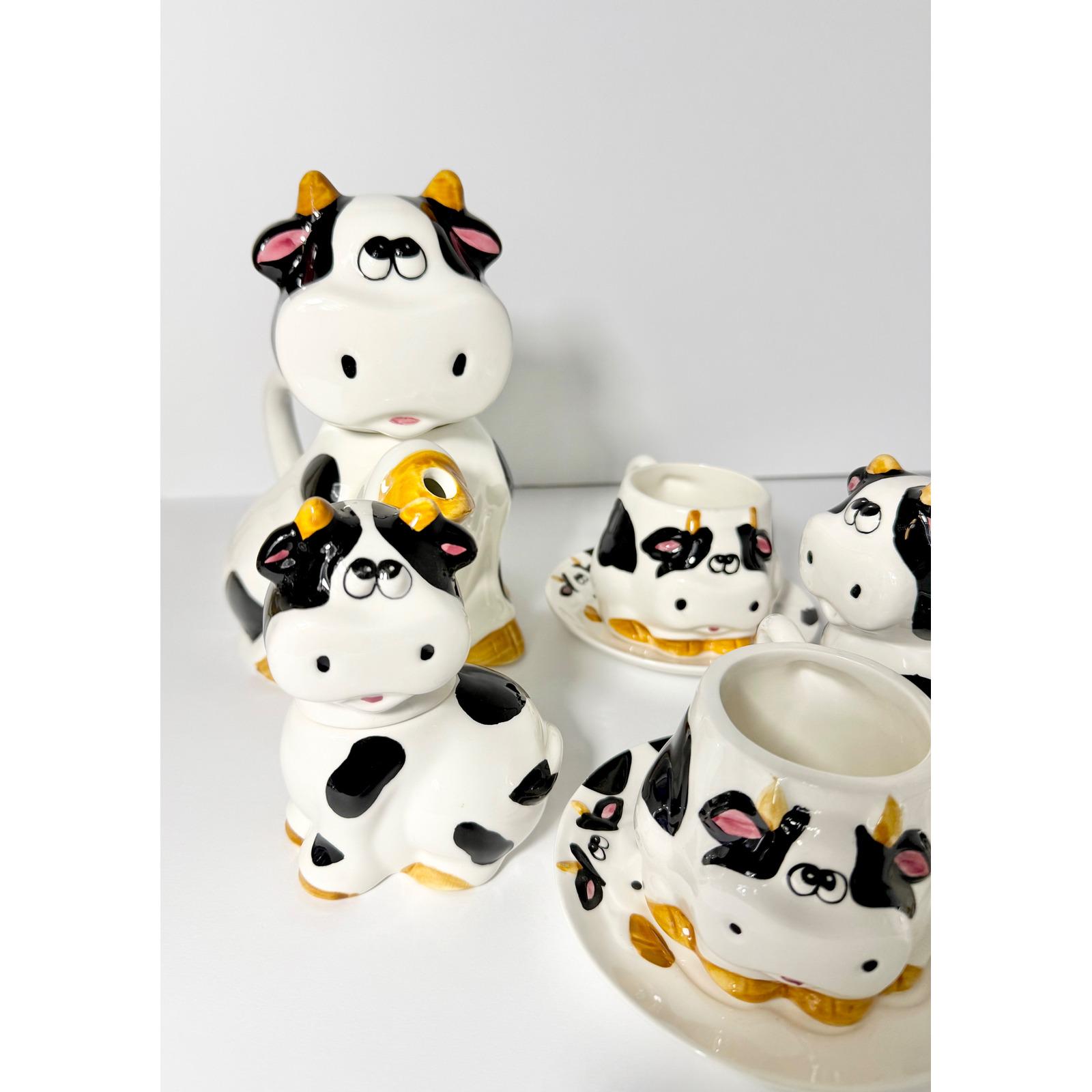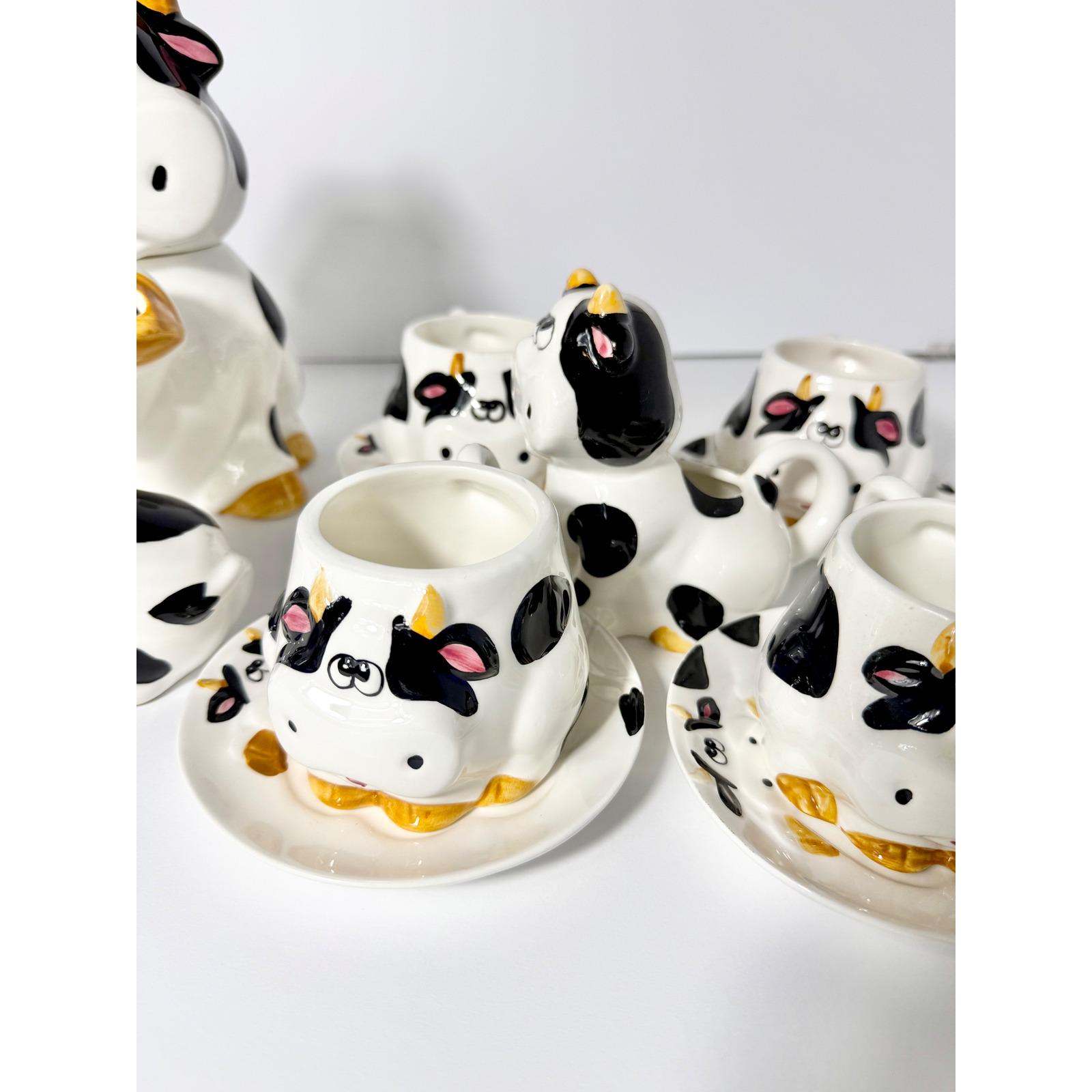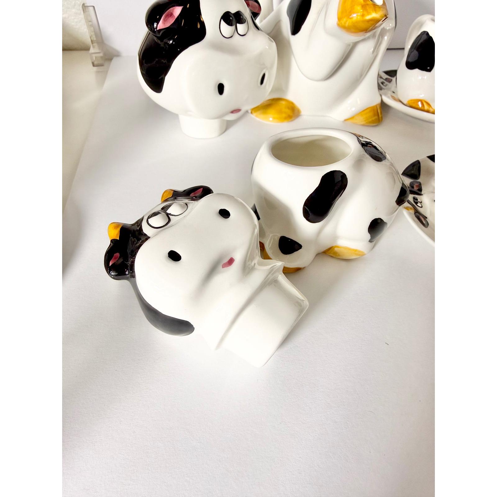 This charming vintage spotted cow tea and coffee set is a complete matching collection that brings playful character to any kitchen or tea table. Featuring the classic black-and-white cow pattern, this set is both functional and decorative.