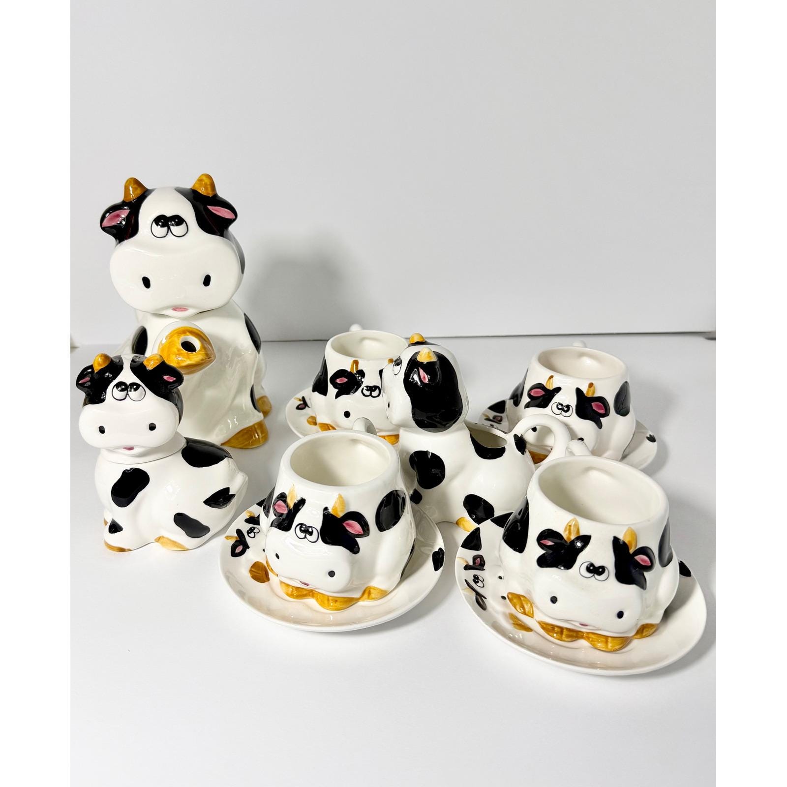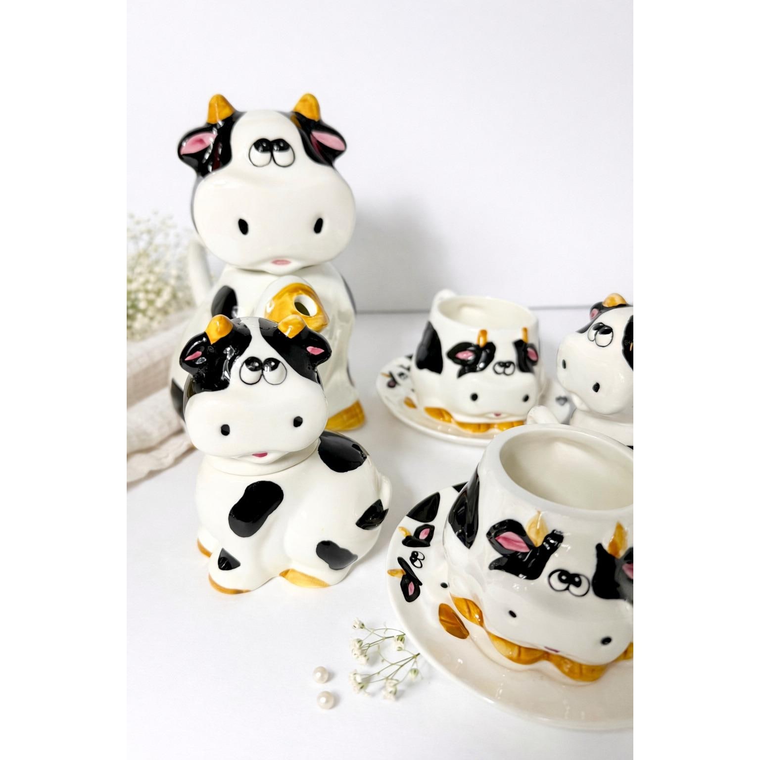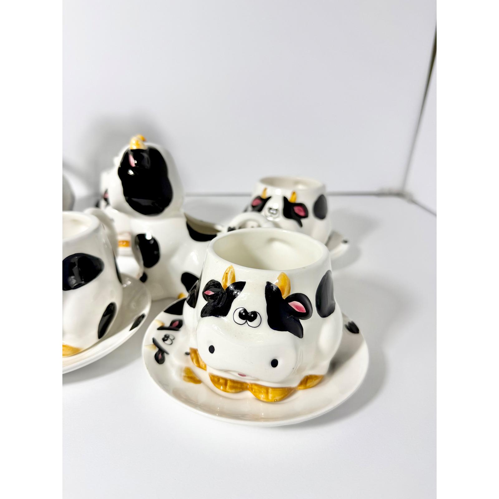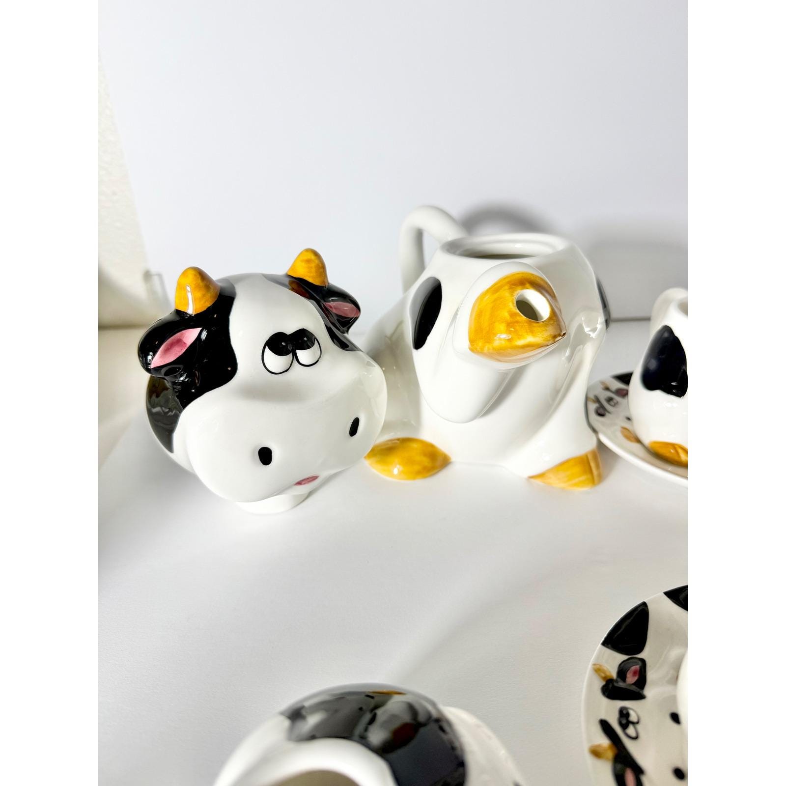 This charming vintage spotted cow tea and coffee set is a complete matching collection that brings playful character to any kitchen or tea table. Featuring the classic black-and-white cow pattern, this set is both functional and decorative.