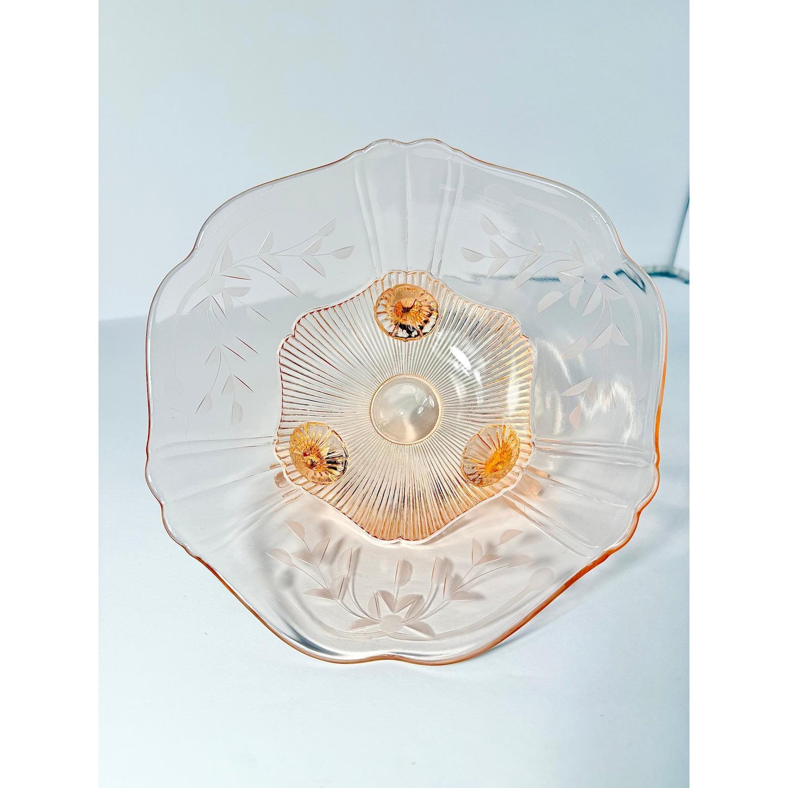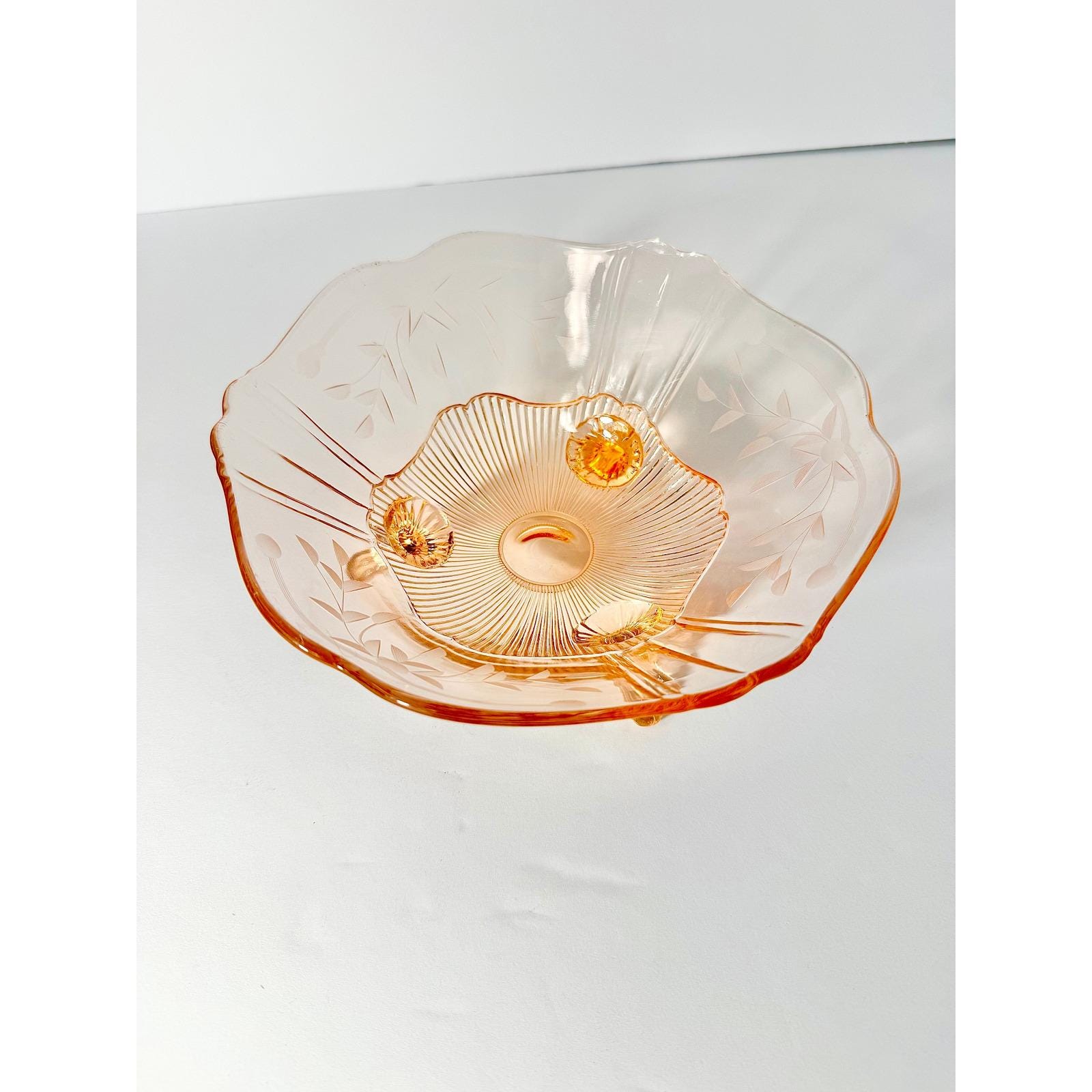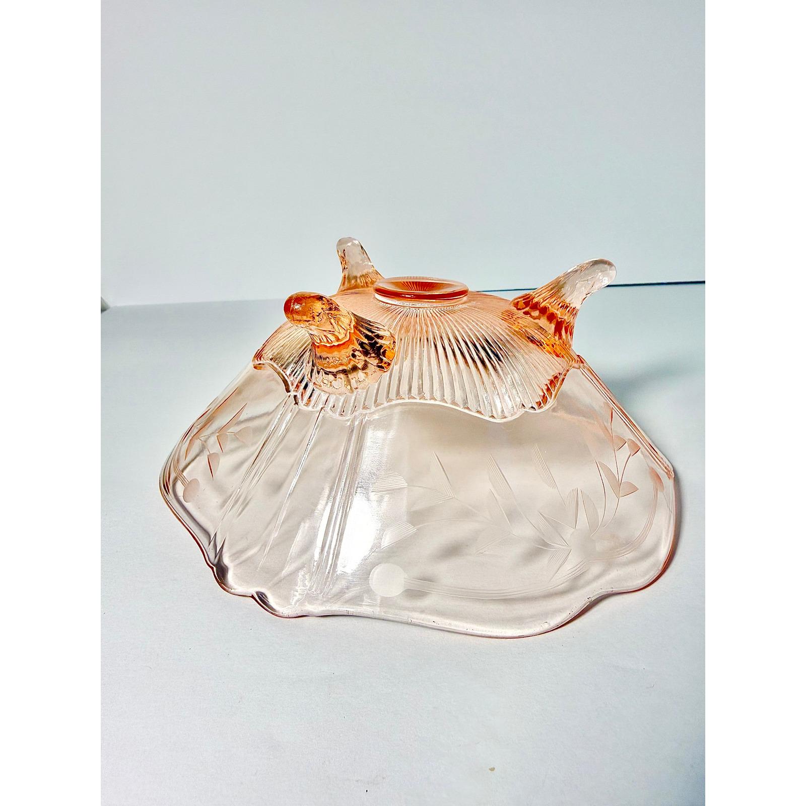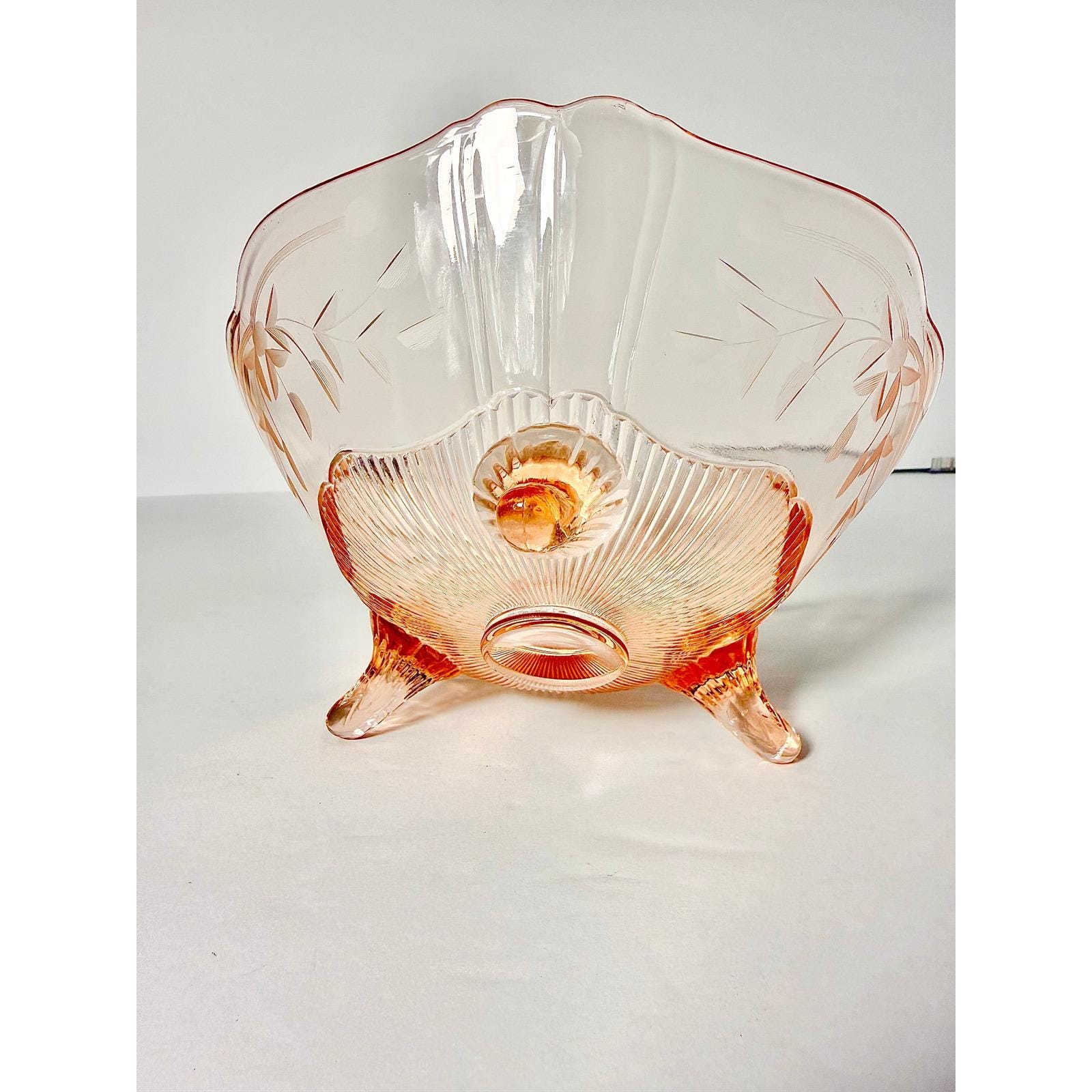 This beautiful vintage three-footed bowl is made of soft pink Depression glass by the Lancaster Glass Company. The delicate color and classic pedestal design give it a timeless, elegant look that displays beautifully in any collected space.