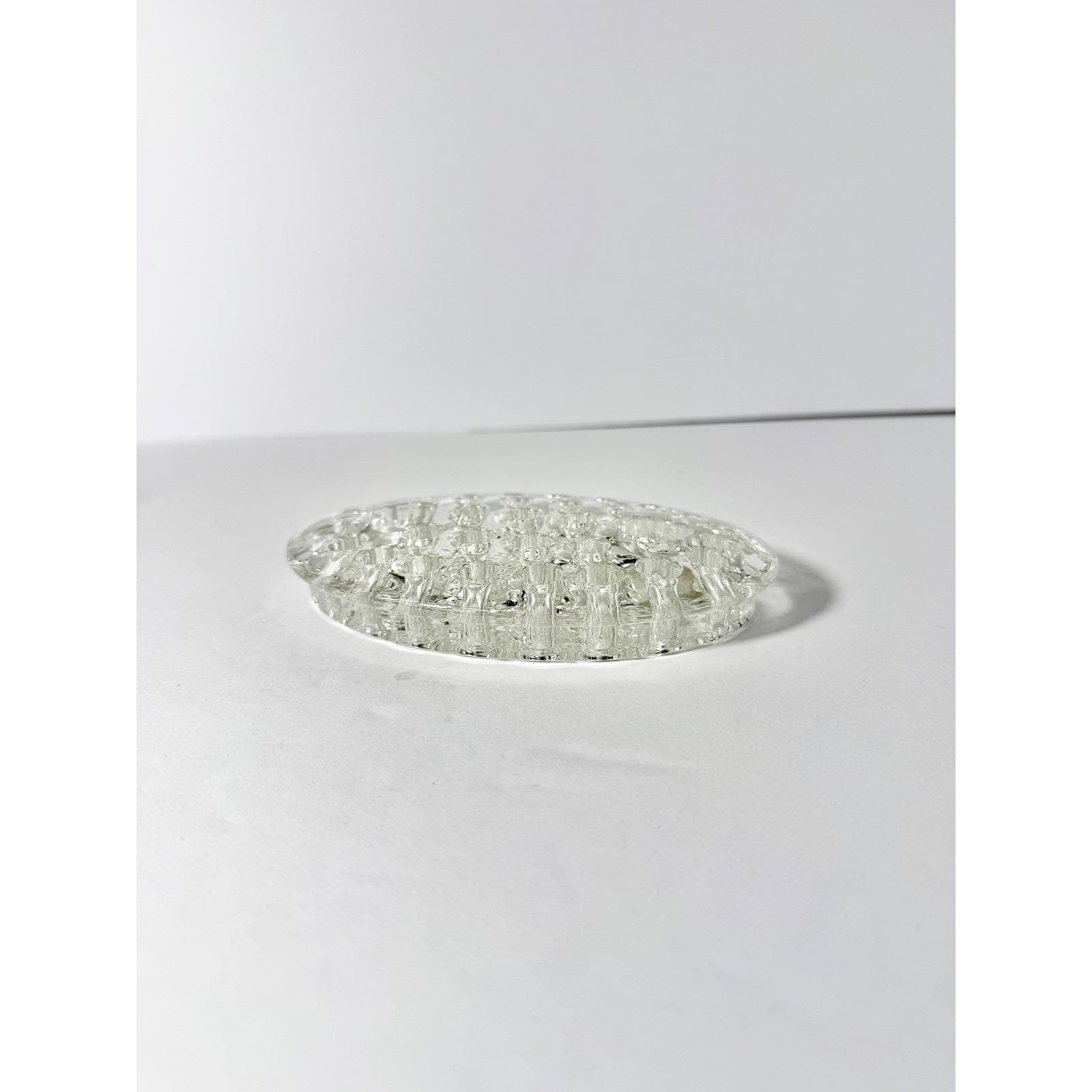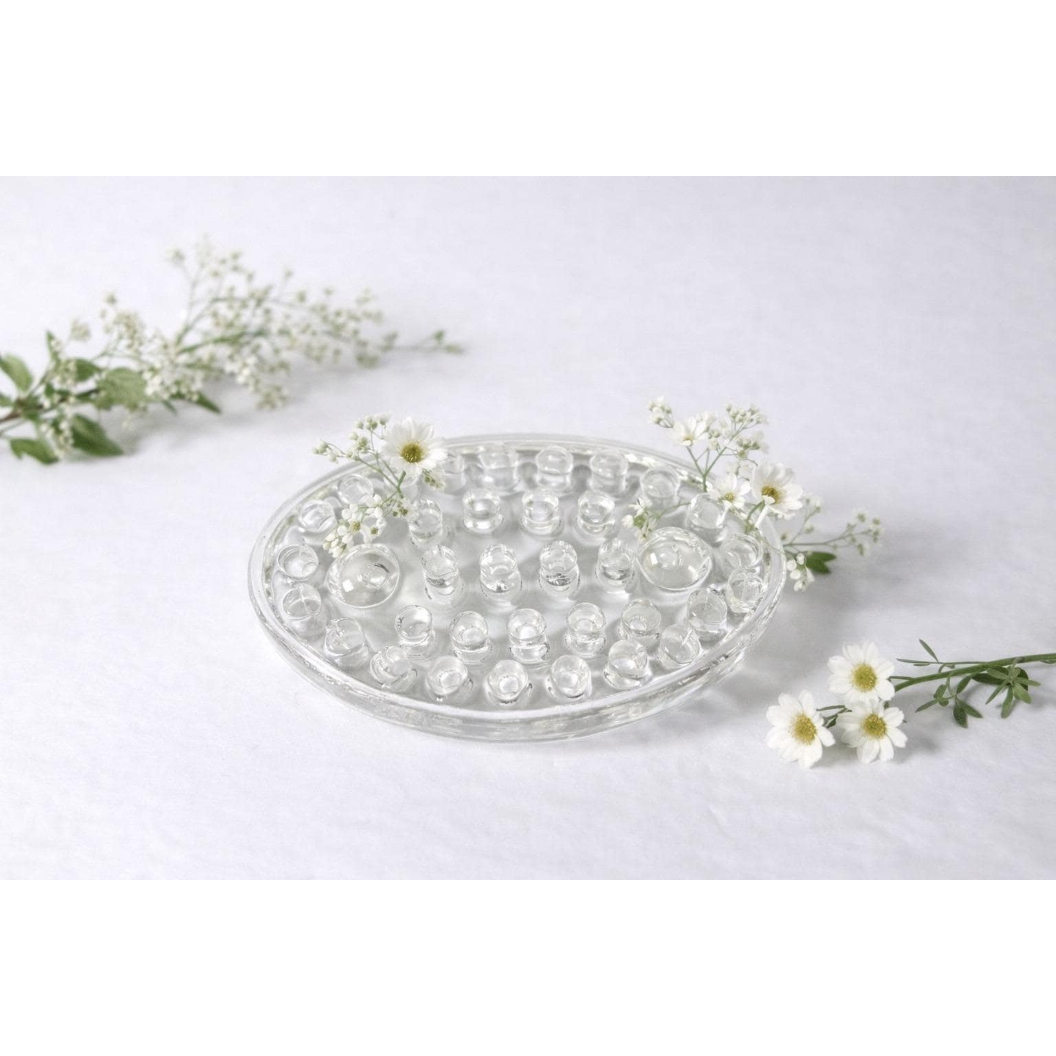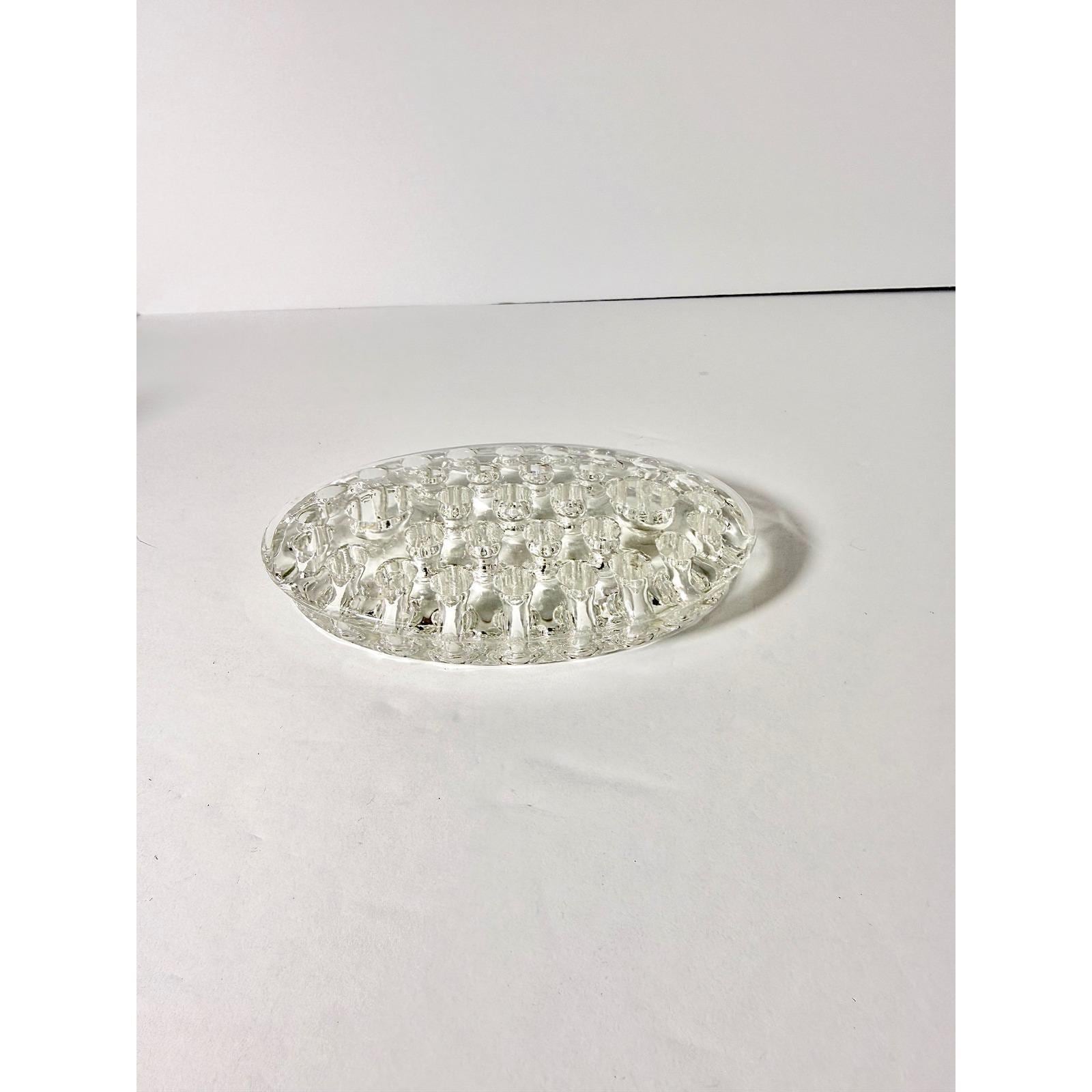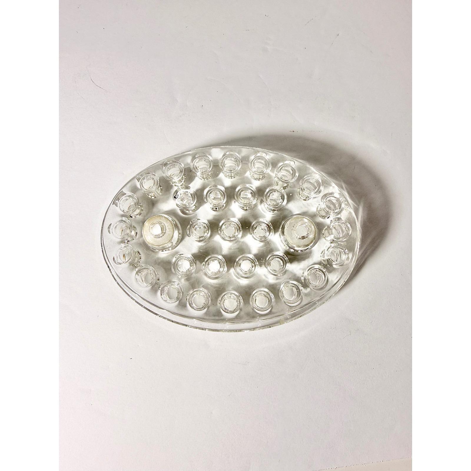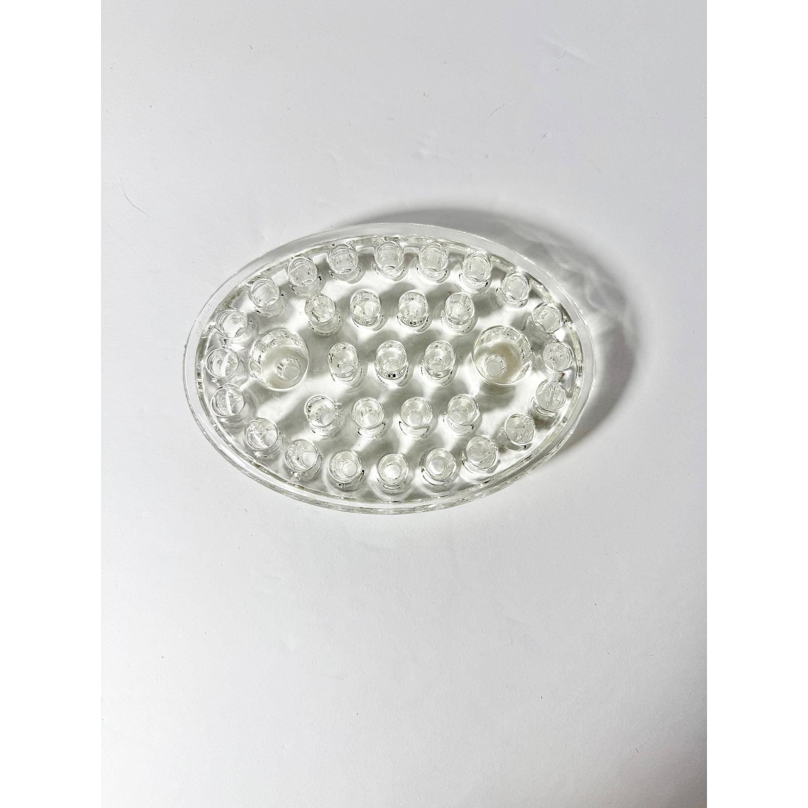 This vintage oval glass flower frog is a classic tool used for arranging fresh or dried flowers in vases and bowls. Made from solid clear glass, it features multiple openings to help support and position stems for beautiful, structured arrangements.