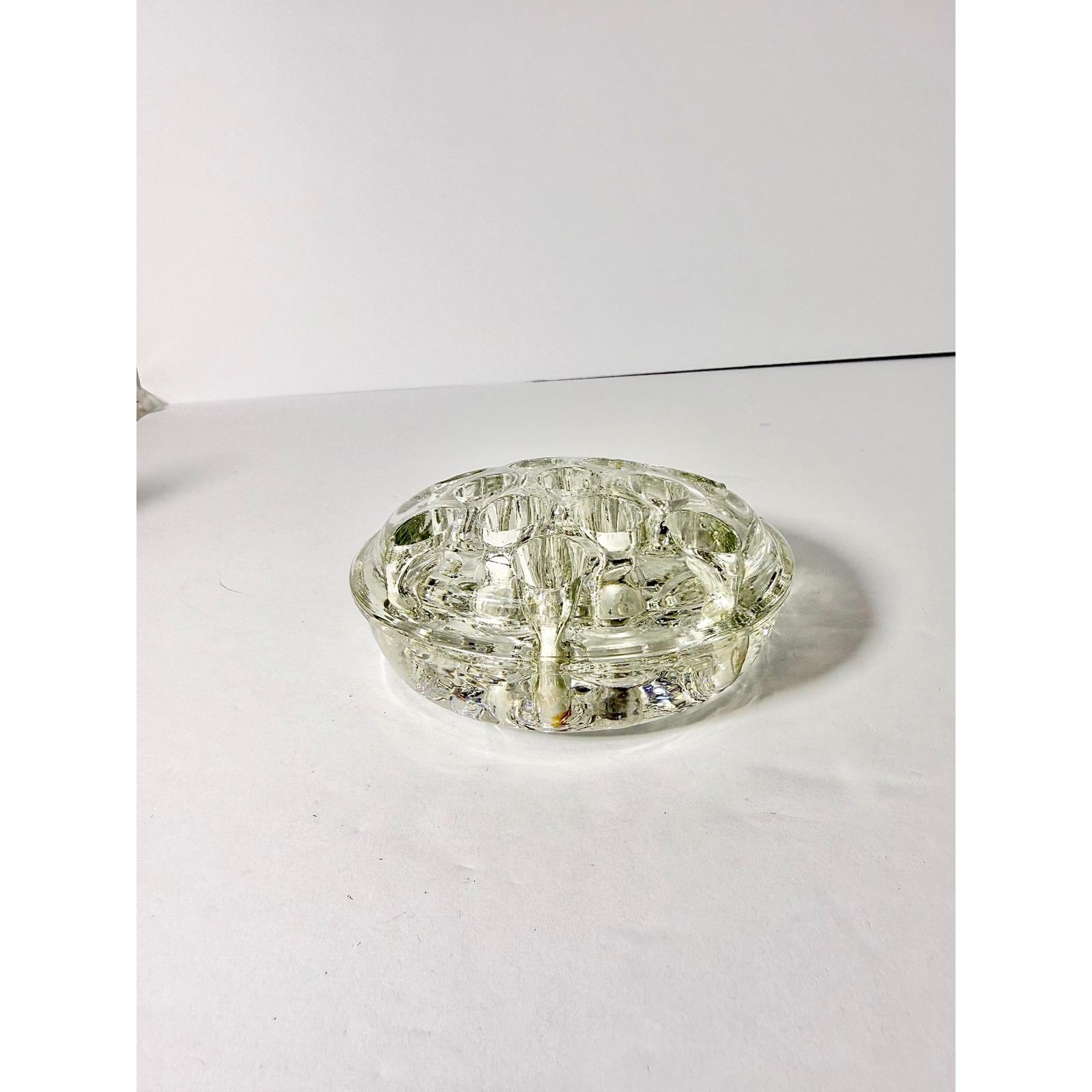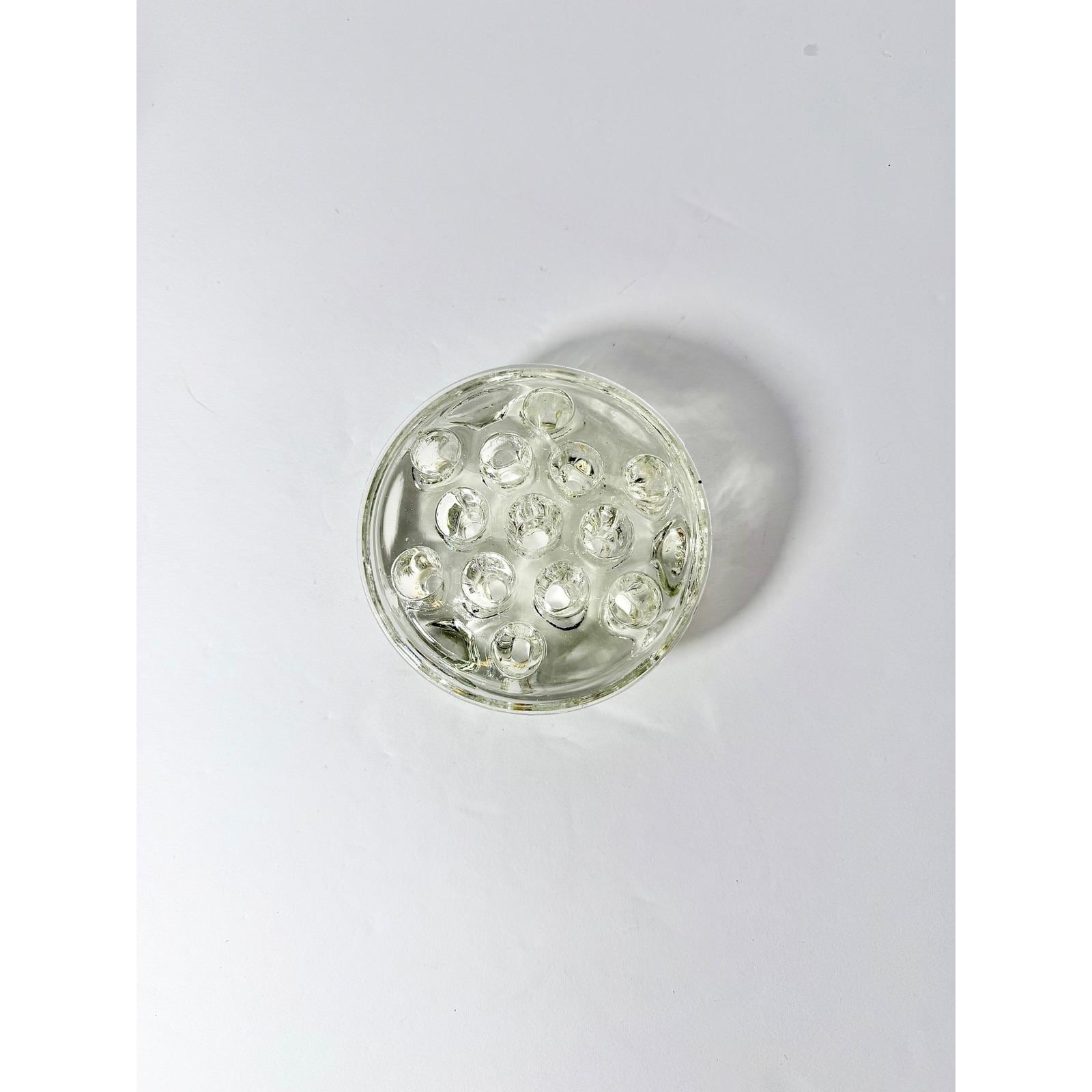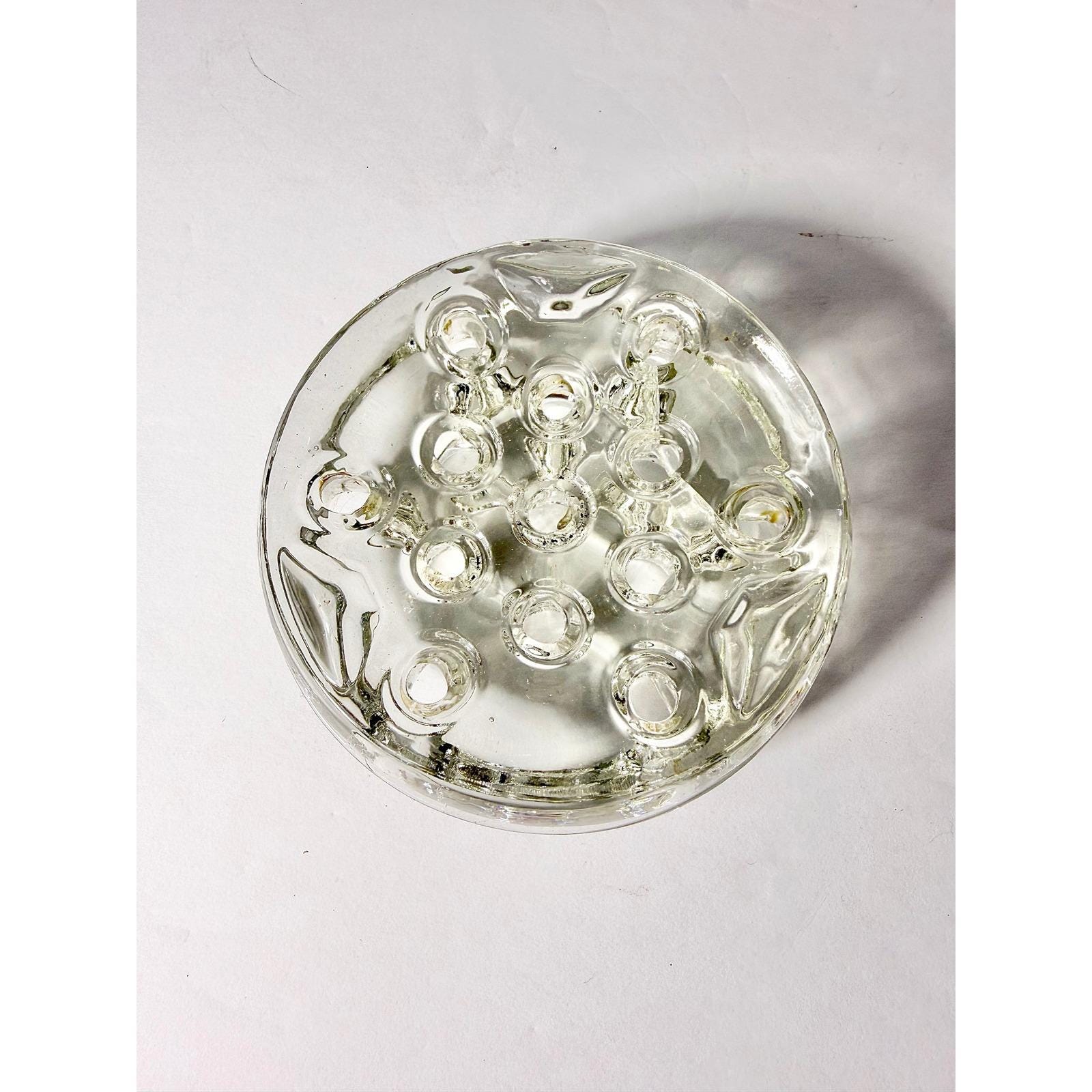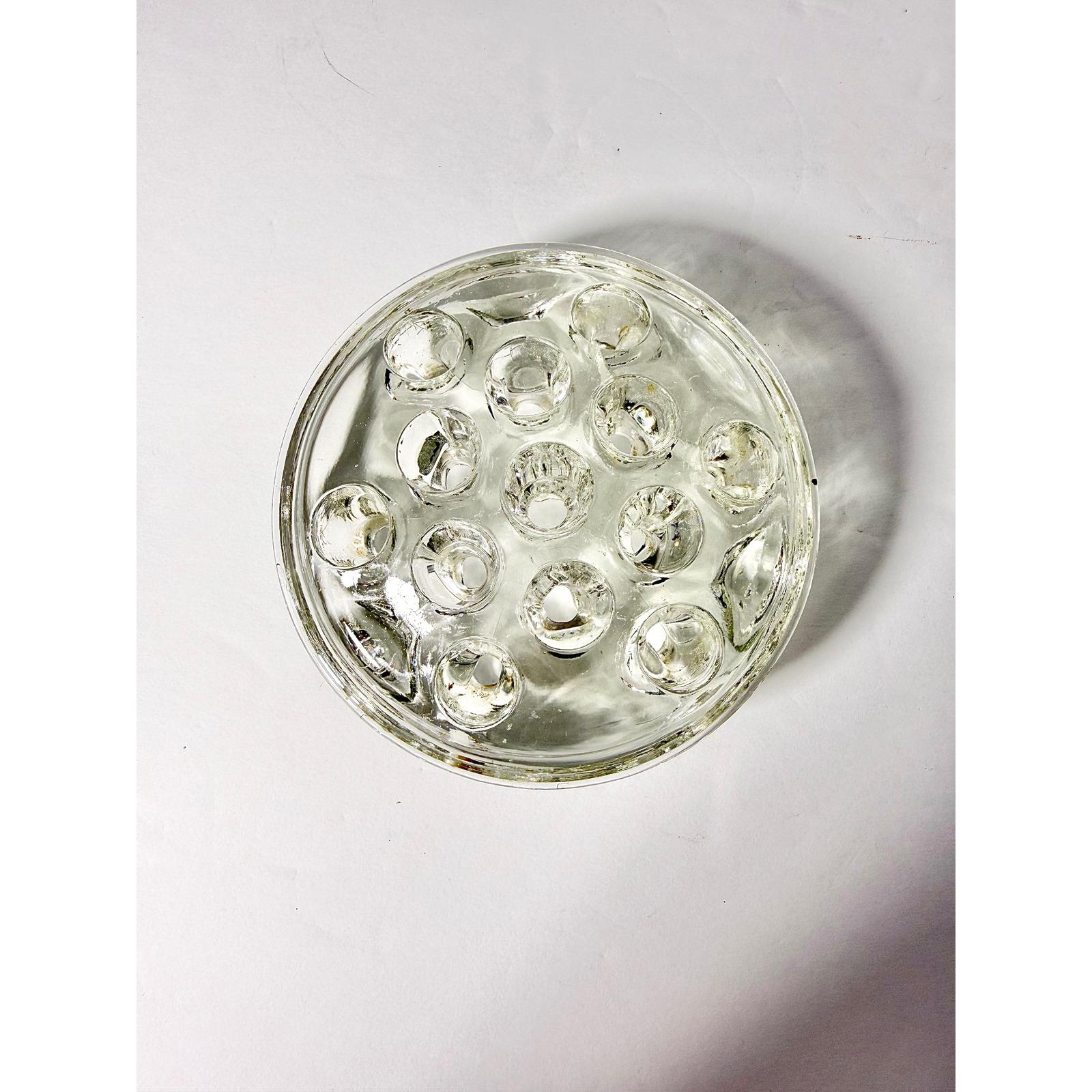 This vintage circular glass flower frog features 13 holes designed to hold and support stems for beautiful, structured floral arrangements. Made from solid clear glass, it has a sturdy weight and classic design that's both functional and timeless.