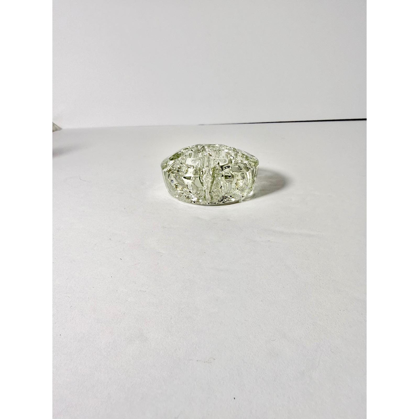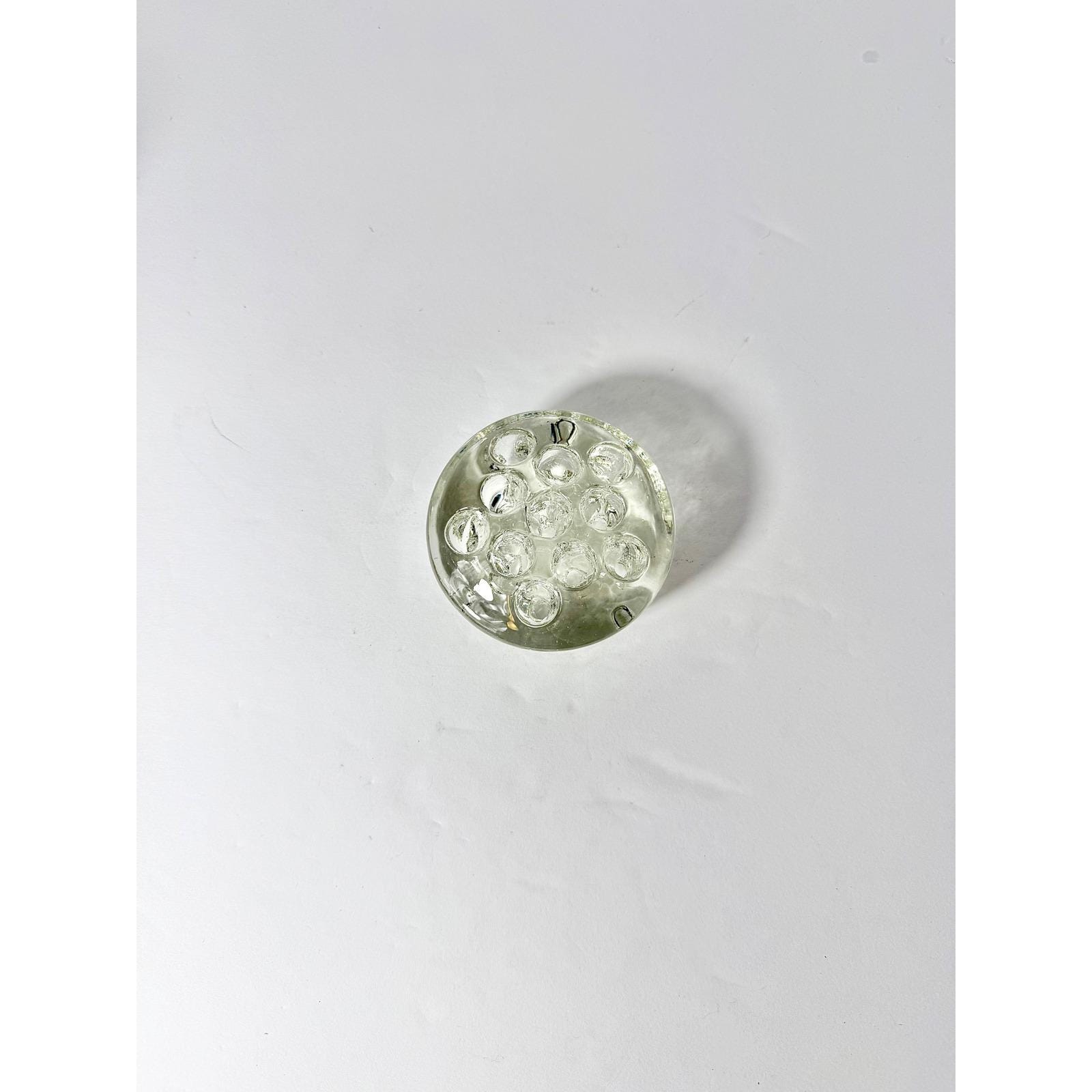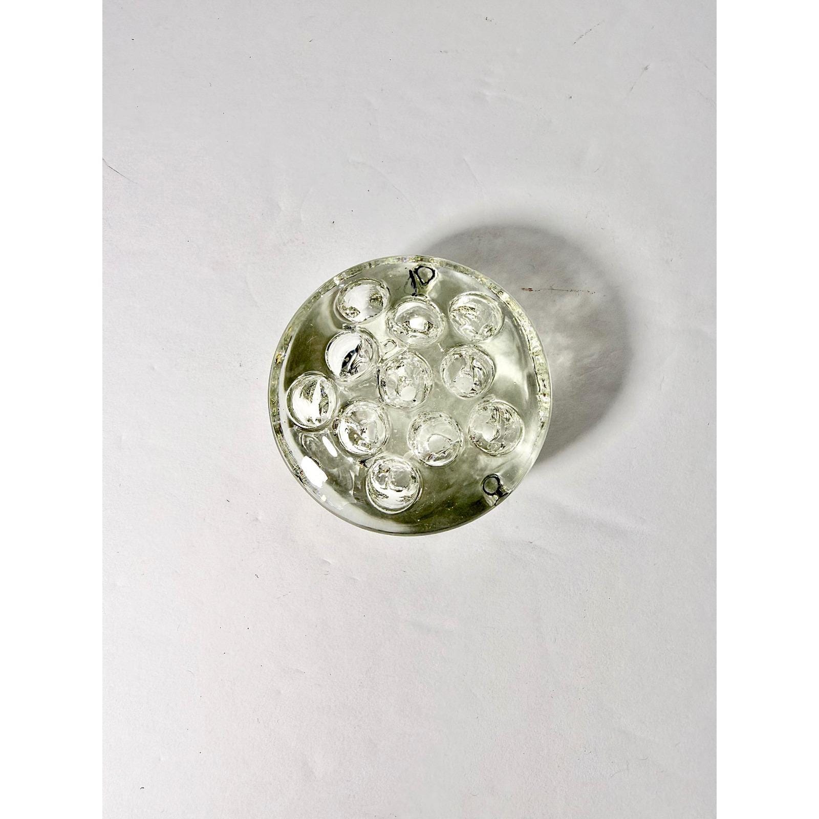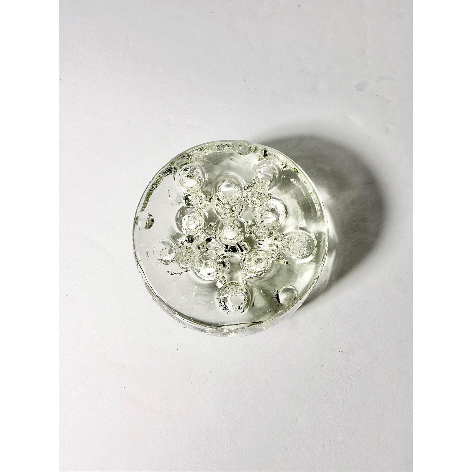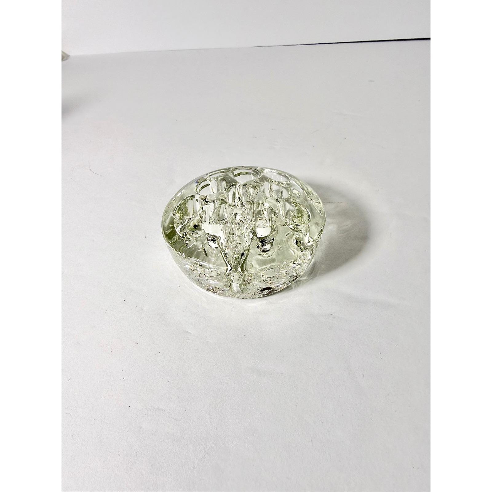 This vintage small circular flower frog is made from thick, solid clear glass and features 11 holes for supporting flower stems in compact arrangements. Its substantial weight and sturdy design make it both practical and long-lasting.